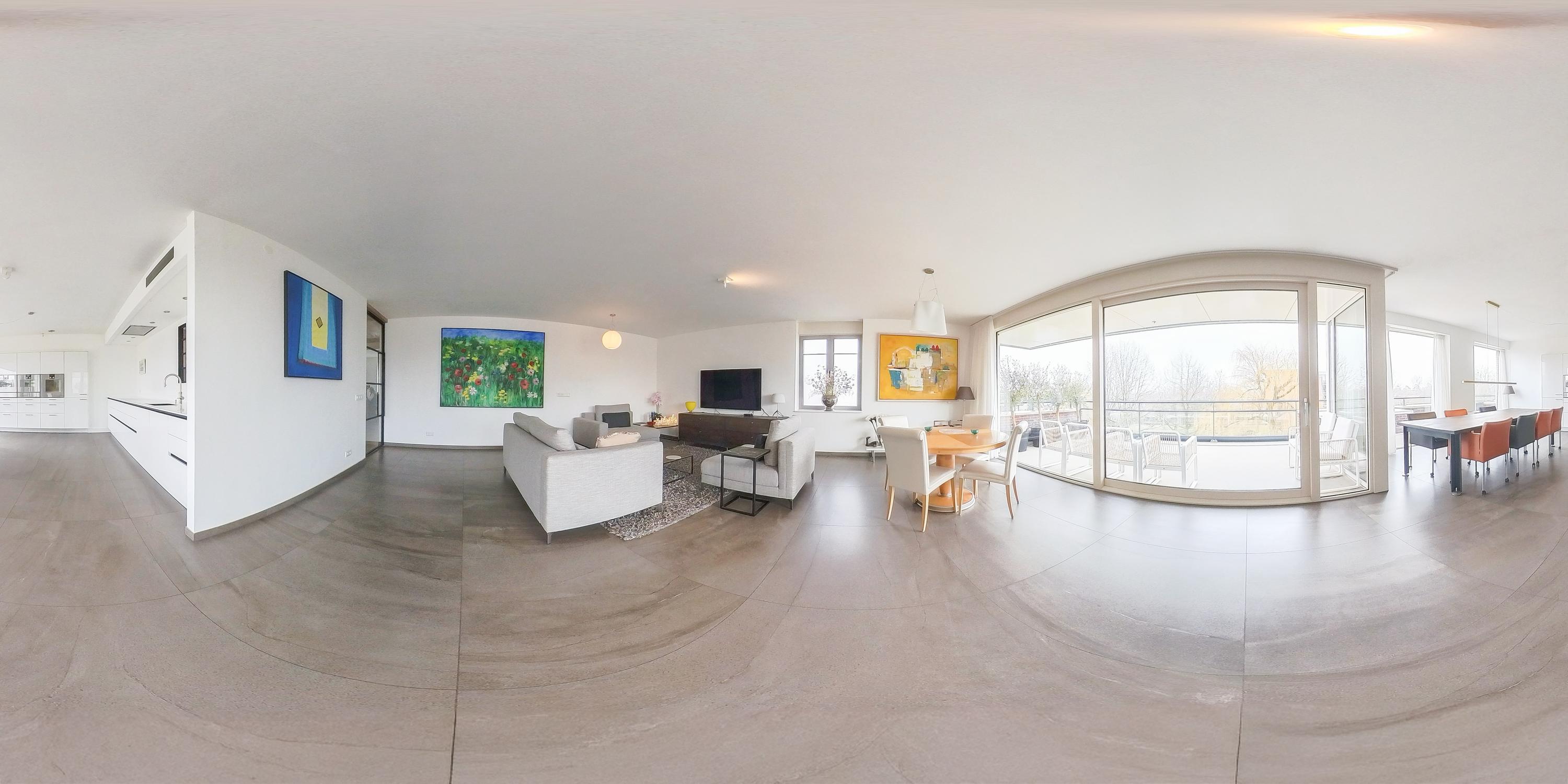 The living room is without a doubt the beating heart of the apartment and feels spacious, bright and relaxed. The generous seating area easily accommodates a large lounge setup as well as guests. Through the wide sliding doors, you step directly onto the large southeast-facing terrace. This terrace is truly impressive in size: there is plenty of room for a large dining table, lounge furniture and greenery, making it a perfect place to relax with family and friends.