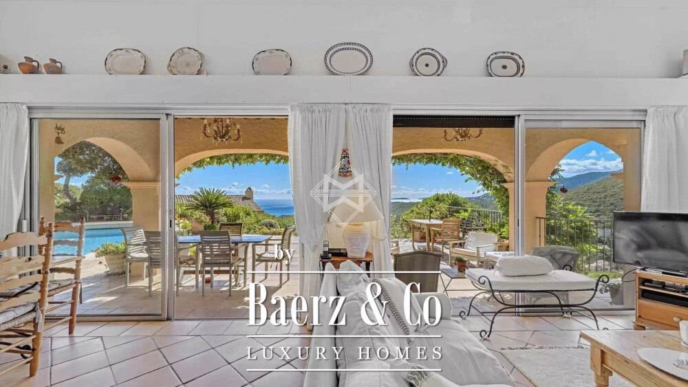 The 2300sqm plot ensures complete privacy and includes a pétanque court, meticulously maintained Mediterranean plants, an 8x4 m swimming pool, double garage and multiple parking spaces, electric gate with intercom, automatic irrigation system, outdoor lighting, and mains drainage.