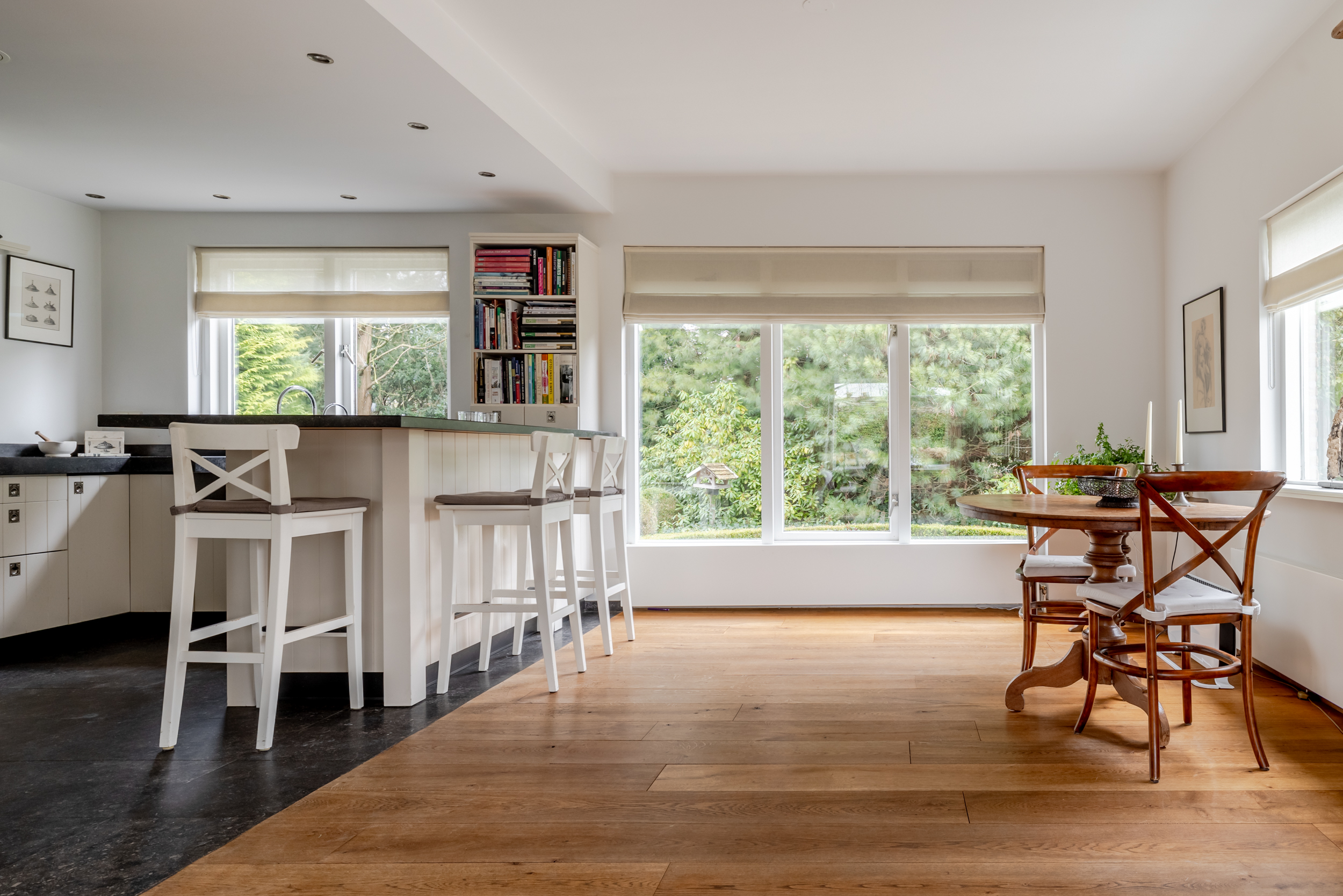 Garden-facing living room consisting of a lounge area (approx. 4.00 x 7.30 m) and a dining area (approx. 4.00 x 4.05 m) with a fireplace and French doors opening onto the garden. Large windows provide beautiful natural light and a seamless connection to the outdoors.