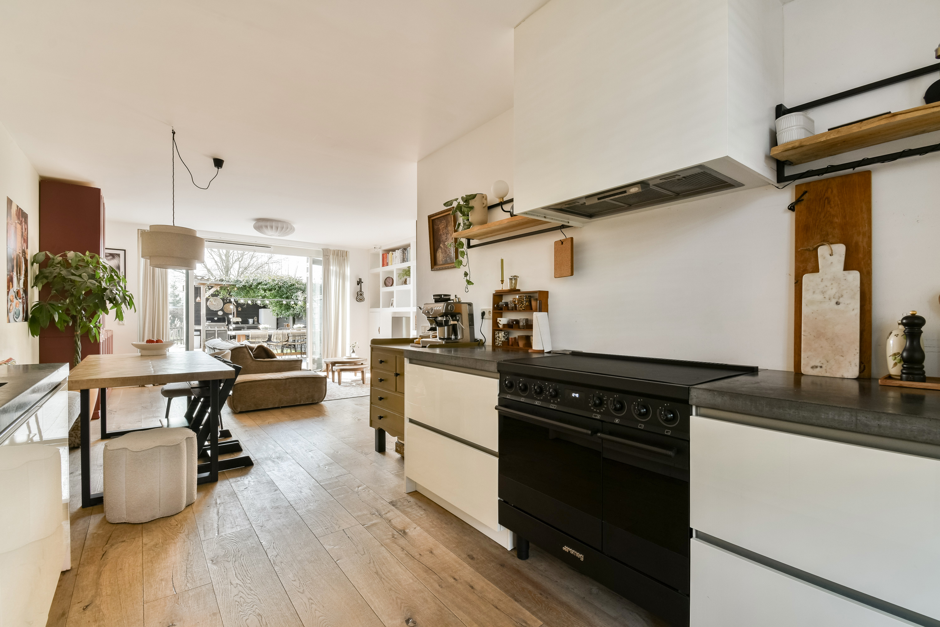 Through the entrance you enter the hallway with meter cupboard and a modern wall-mounted toilet with washbasin. At the front of the house is the open kitchen, equipped with various built-in appliances and a spacious countertop. The living room is located at the rear, with French doors providing access to the beautifully landscaped backyard. The ground floor also features a practical storage cupboard under the stairs.
