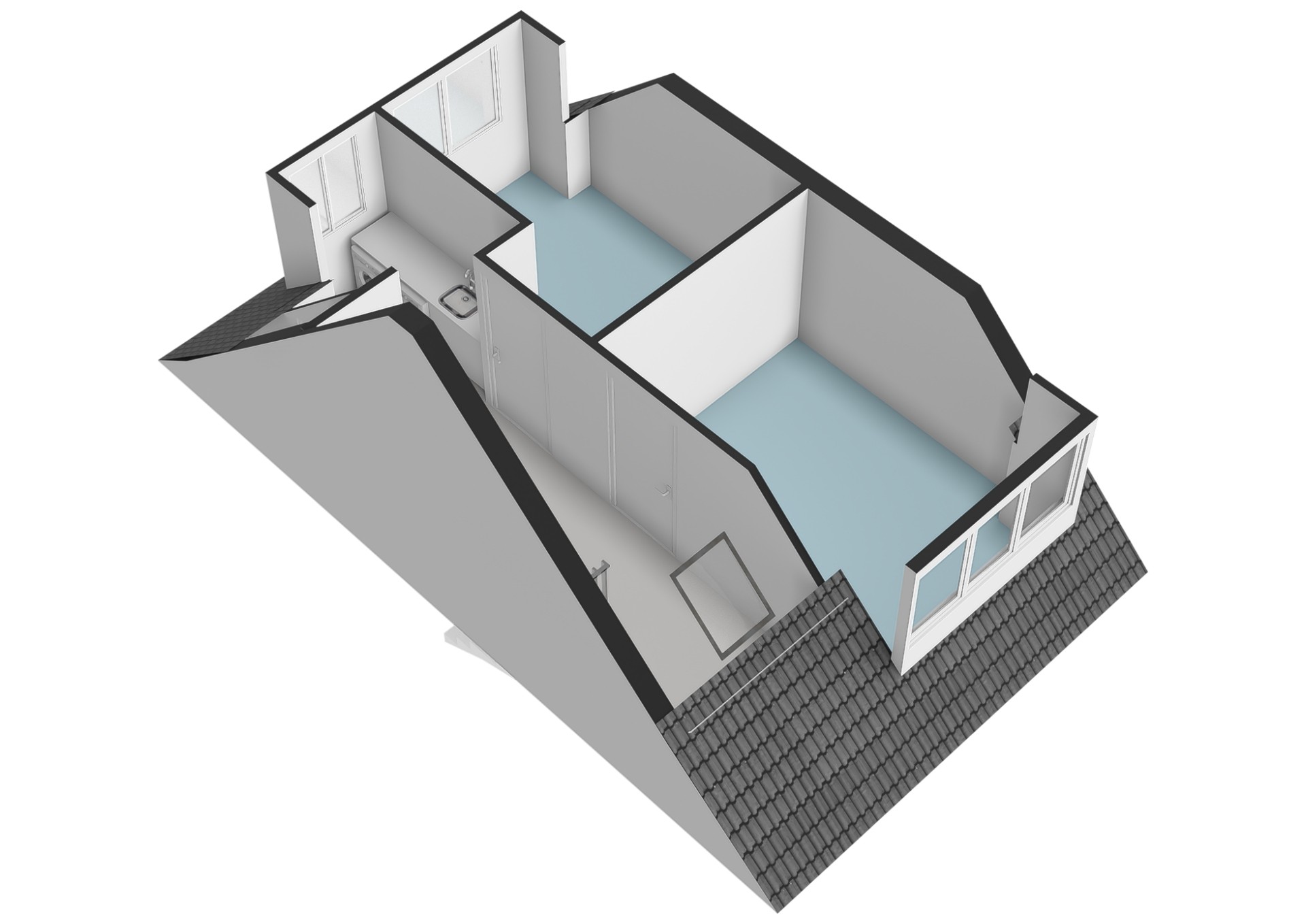 A fixed staircase leads to the second floor. Here you will find two additional full-sized bedrooms, both with natural light. There is also a separate space with connections for a washing machine and dryer, as well as the technical installations.