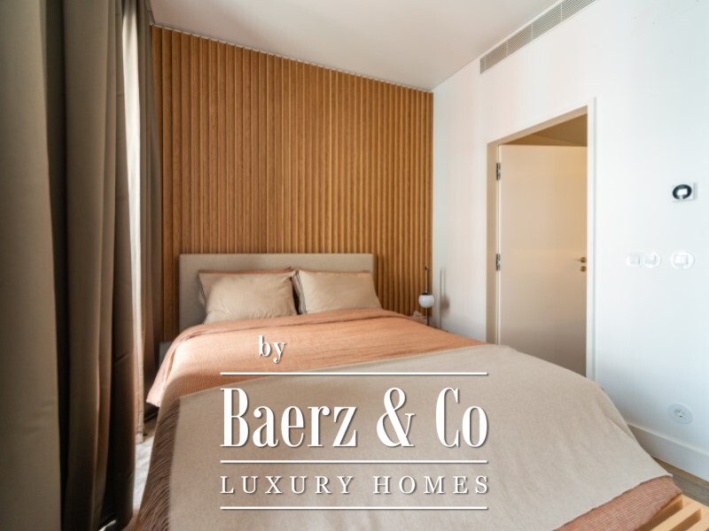 The private area comprises a suite with walk-in wardrobe and en-suite bathroom featuring a bathtub, complemented by a second bedroom also with a walk-in wardrobe, and a full bathroom that serves as both guest facility and powder room. Air conditioning, sun exposure, and 2022 new construction further shape a lifestyle of calm sophistication.
