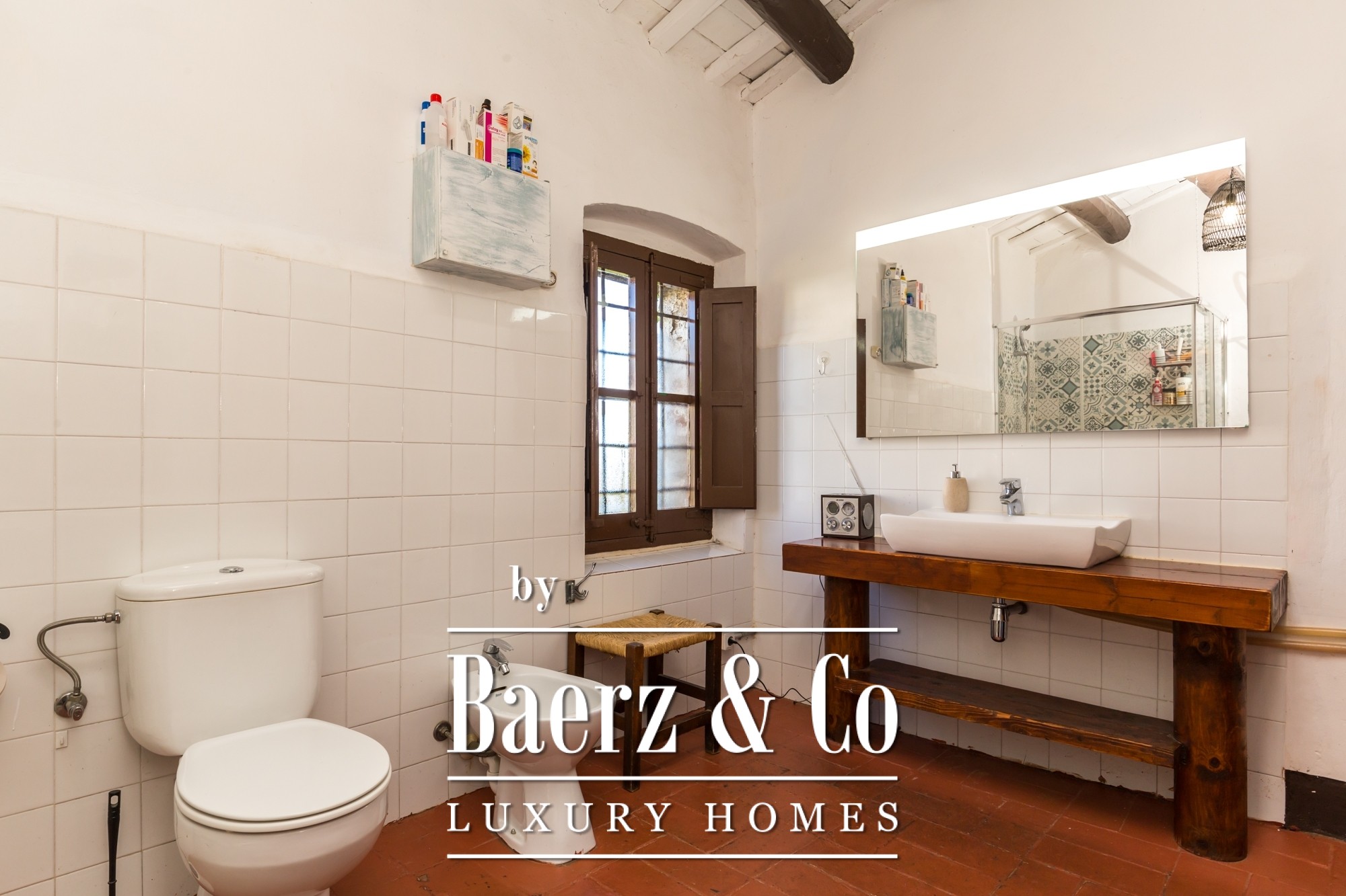 The pool is situated in an elevated location, creating a tranquil retreat within the estate’s natural rhythm. An elegant driveway approaches the property, where a garage enhances convenience. Opportunity exists for bespoke refinement within spaces ready for renovation, suited both for residential use or as an exclusive retreat. This farmhouse for sale in Llagostera is poised between history and possibility, in the heart of inland Costa Brava.