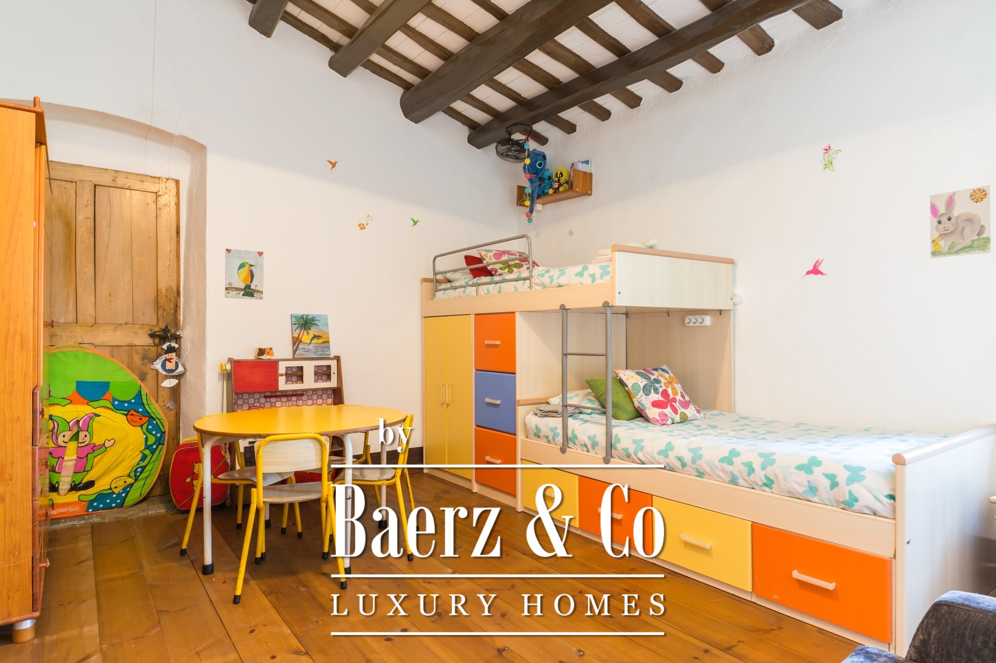 The main residence features seven bedrooms and four bathrooms, with suites on the upper level offering private terraces and sweeping vistas. High ceilings, light-filled rooms, and original architectural details reflect its historical character. There are two dining and living rooms, a voluminous family kitchen, and an office-library connecting to a serene private garden. Generous storage and auxiliary buildings convey practical flexibility.