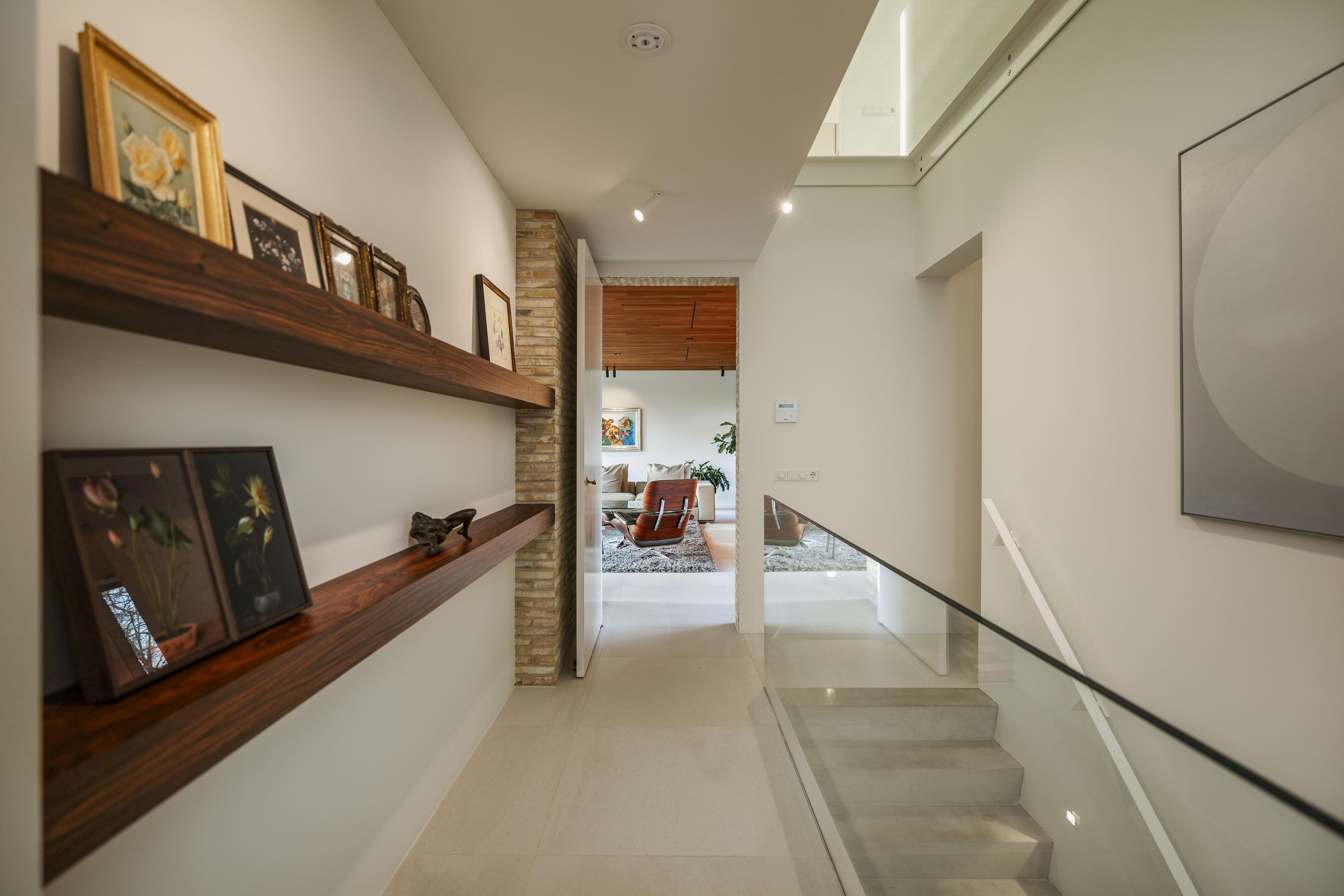 The living room (74 m²) is spacious and divided into two seating areas by a room divider with an integrated television and bookcase. At the rear, floor-to-ceiling windows offer views of the garden, while at the front, the ponds come into view, with sufficient privacy thanks to the half-height parapet. A wide Metalfire fireplace and a raised teak floor area at the front give the room extra character. The sophisticated lighting plan ensures that art and architectural lines are shown to their best advantage.