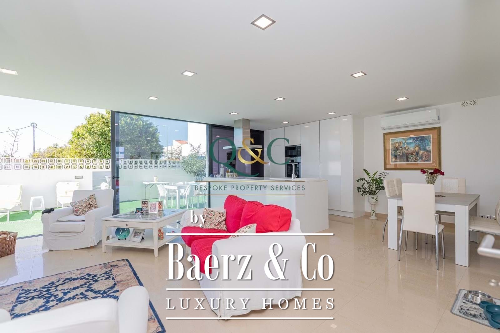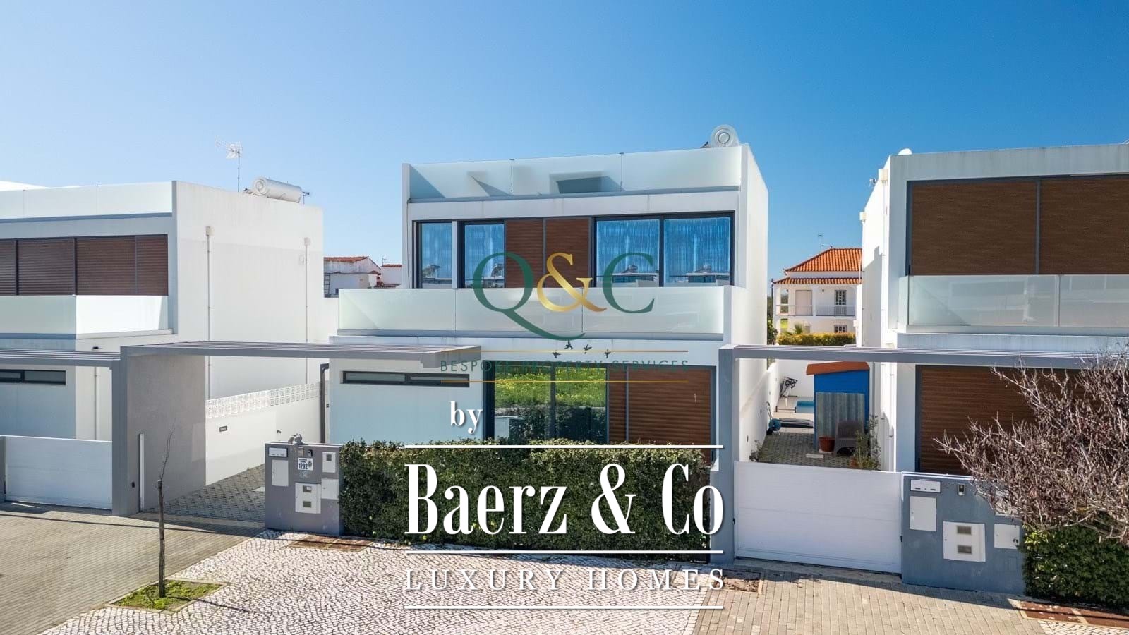 Modern house Luz de Tavira presents a refined blend of light, space, and calm, shaped around 141 m² of contemporary design on a 189 m² plot. The ground floor orients itself around an open-plan living area, where the kitchen, dining, and lounge flow seamlessly, anchored by a woodburning fire and inviting terraces. Each detail, from double glazing to air conditioning and electric gates, expresses a commitment to understated comfort. The downstairs bedroom opens to a private terrace and is served by a nearby guest bathroom.