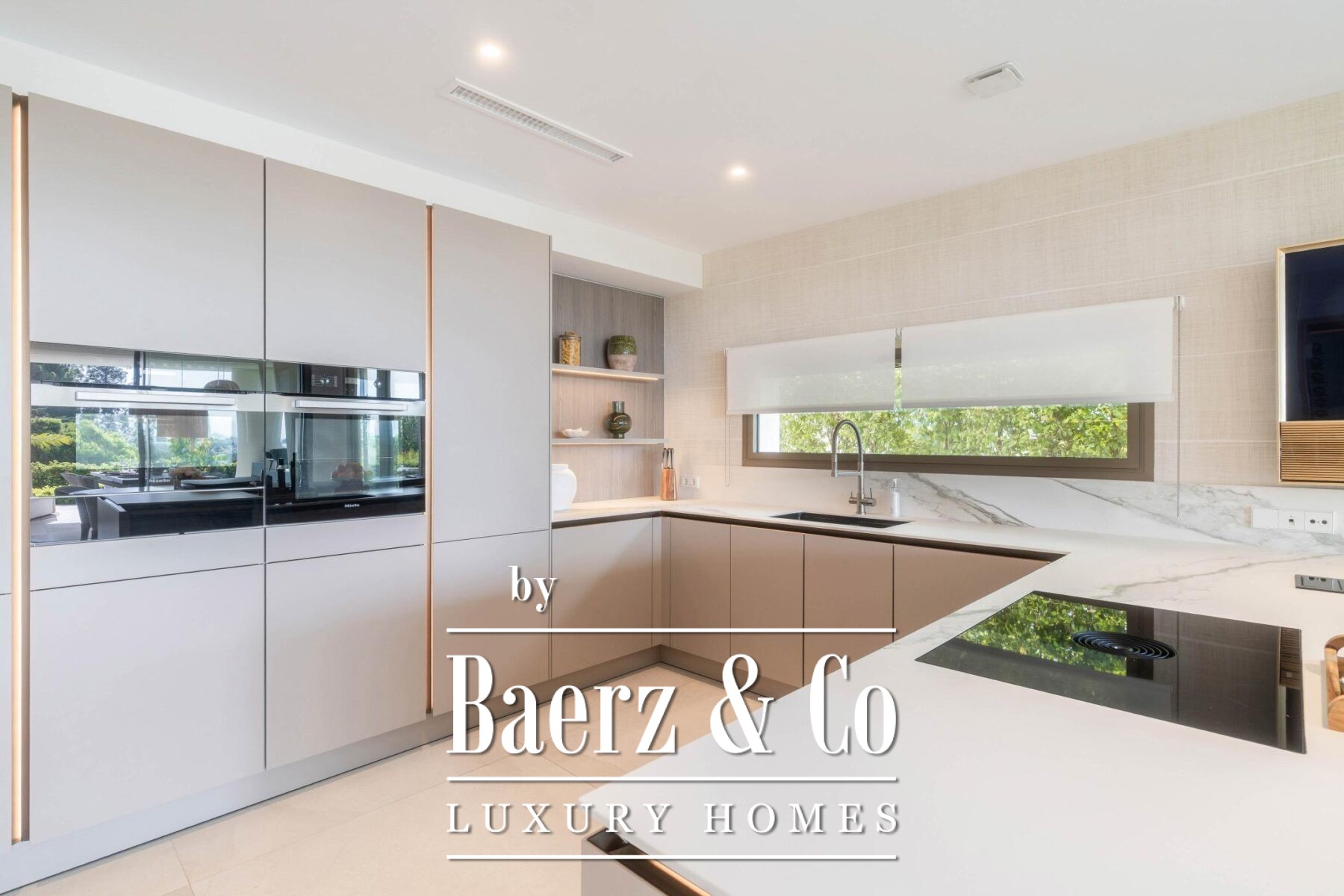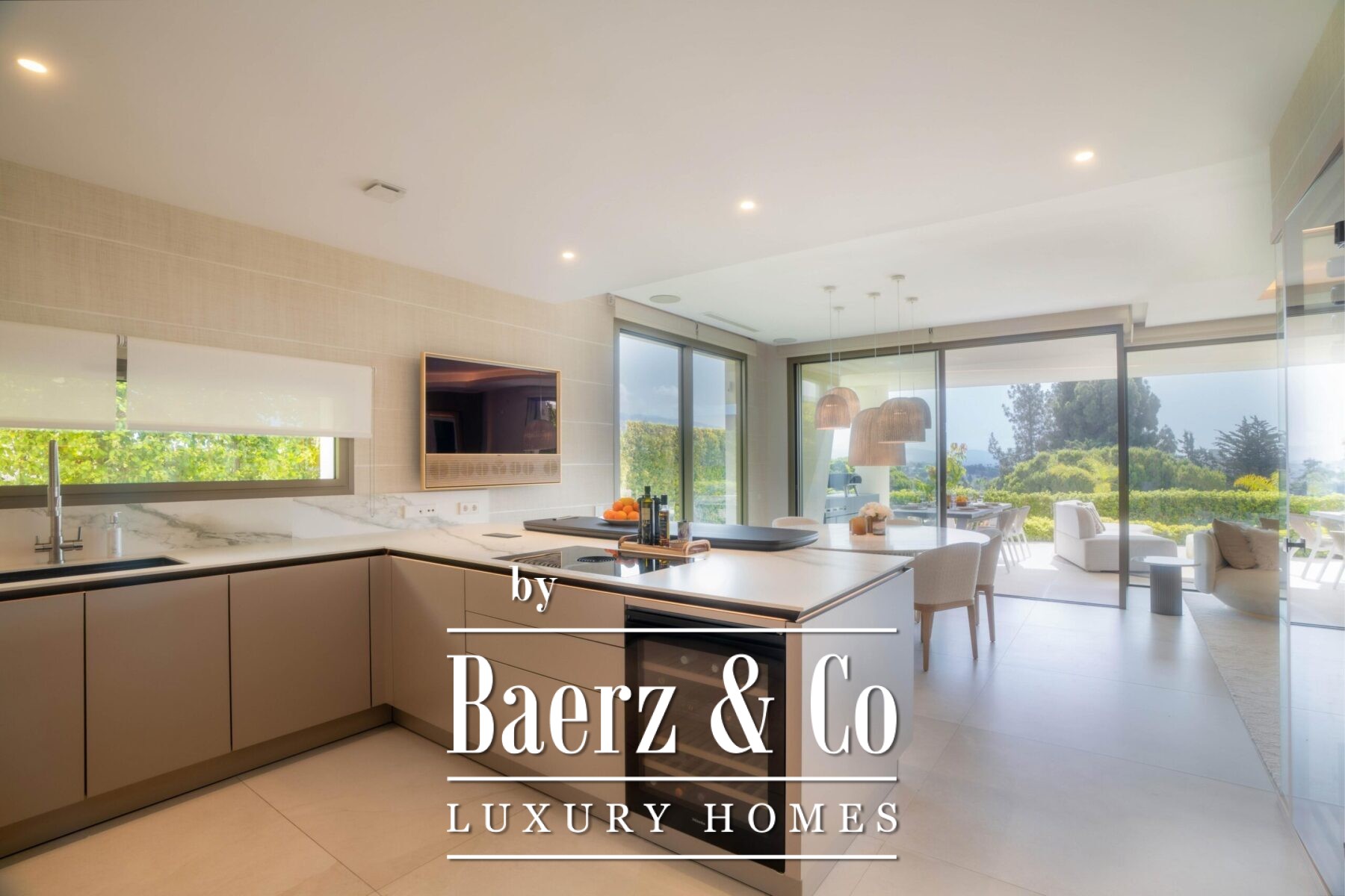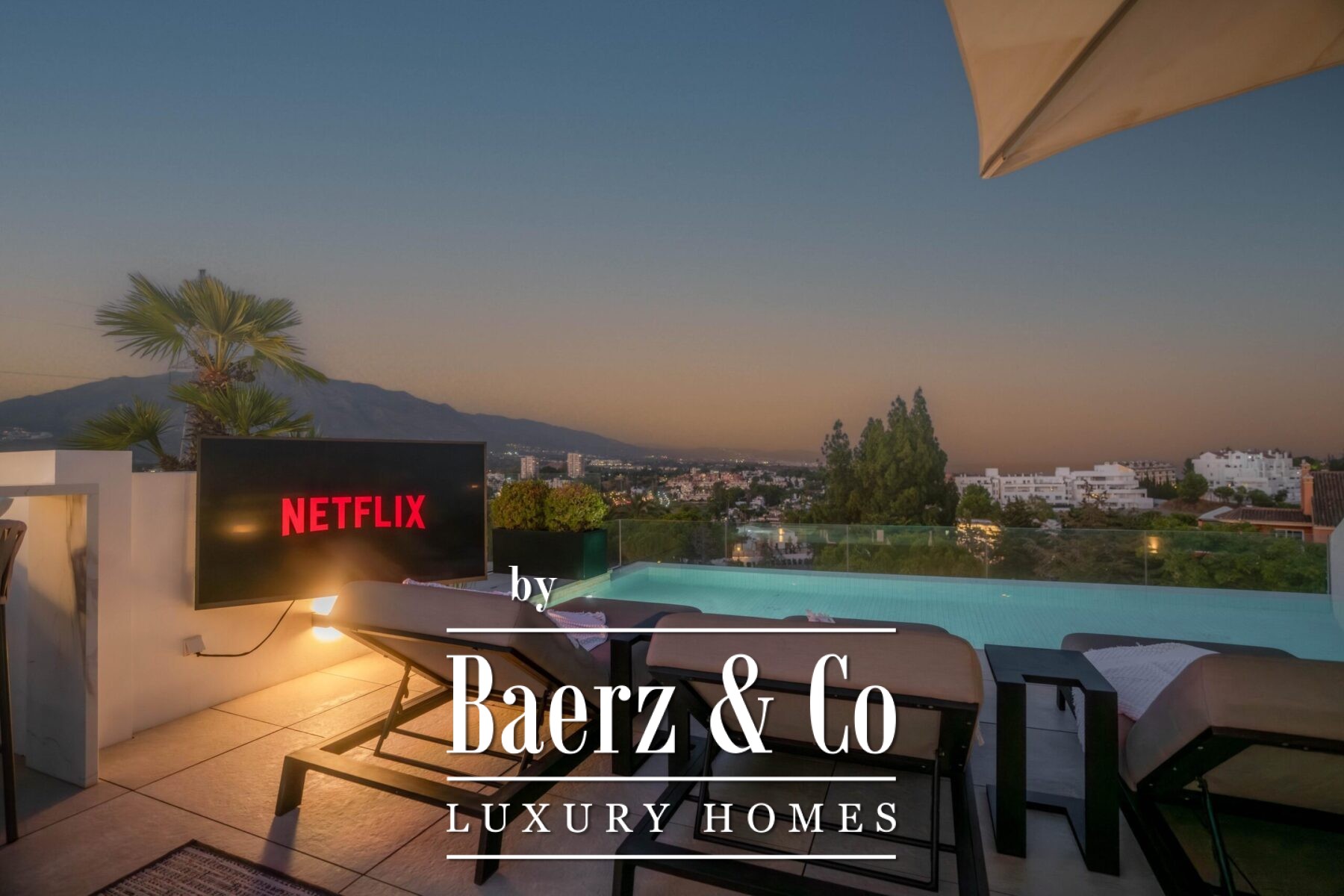 Generous living areas connect to a covered terrace designed for seamless indoor-outdoor living. The custom rooftop solarium, complete with a private plunge pool, opens up panoramic views over the Golf Valley and the iconic La Concha mountain. A private elevator links each of the four levels, allowing effortless access throughout, while the fully equipped Siematic kitchen invites convivial gatherings.