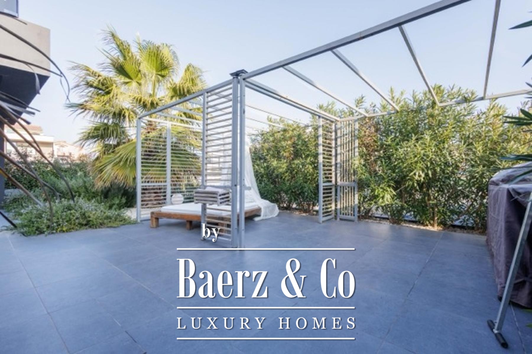 On the ground floor, an expansive living room anchors the home, featuring bespoke furnishings sourced from Germany, Italy, and the Czech Republic. The interplay of soft color palettes, a statement fireplace, and generous glazing blurs indoor and outdoor life, opening to the private pool and surrounding terrace. Adjoining rooms include a thoughtfully equipped kitchen, a guest bedroom, a toilet, additional service spaces, and direct garden access.