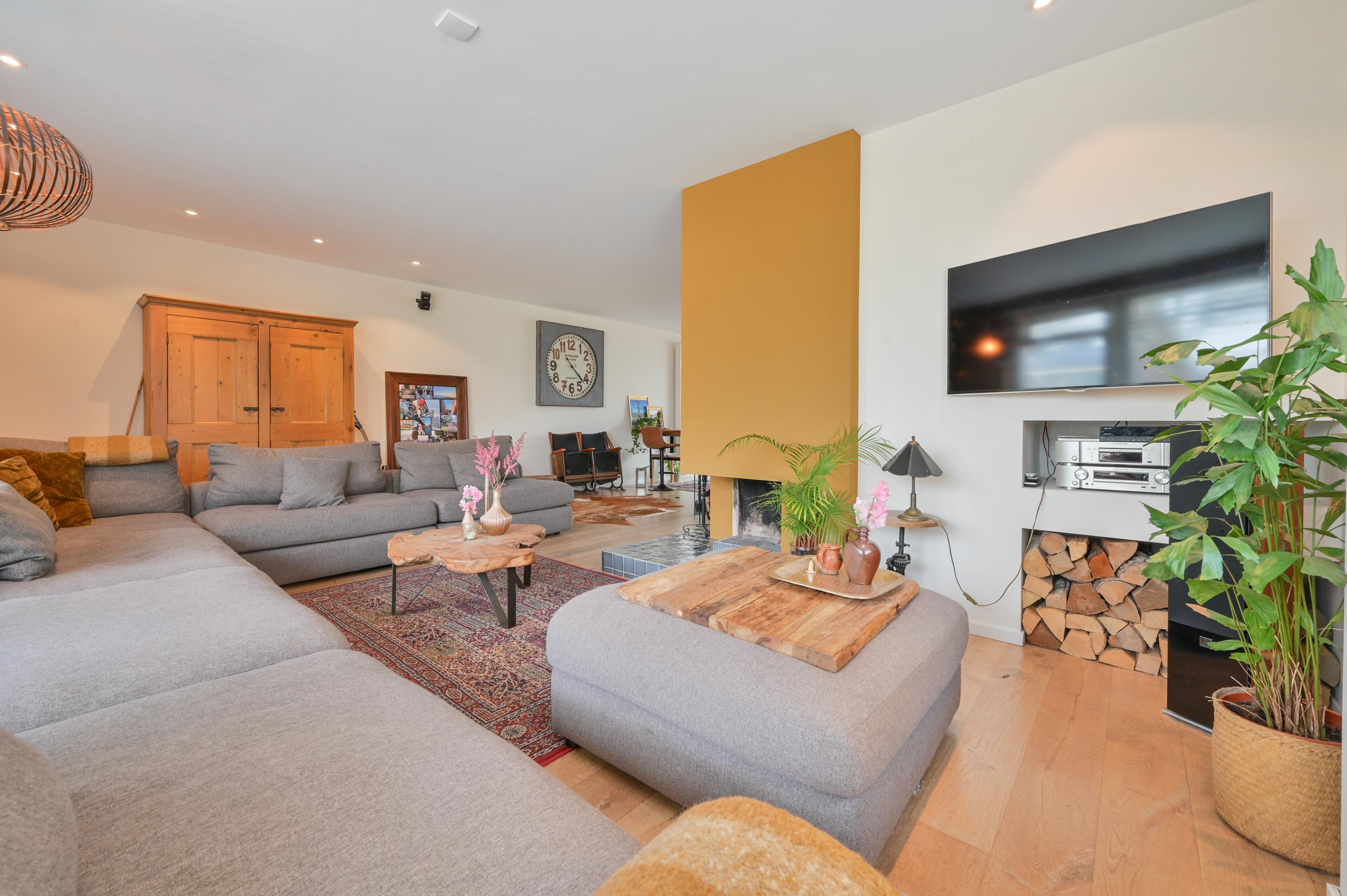 The living room has a cozy L-shaped layout. At the front, a large window provides pleasant natural light and an open connection to the quiet street. The seating area with fireplace forms the warm heart of the home — a place to truly unwind. On the side, a large window offers unique views over the meadows, beautifully blending indoor and outdoor living. The wooden flooring enhances the calm and timeless atmosphere.