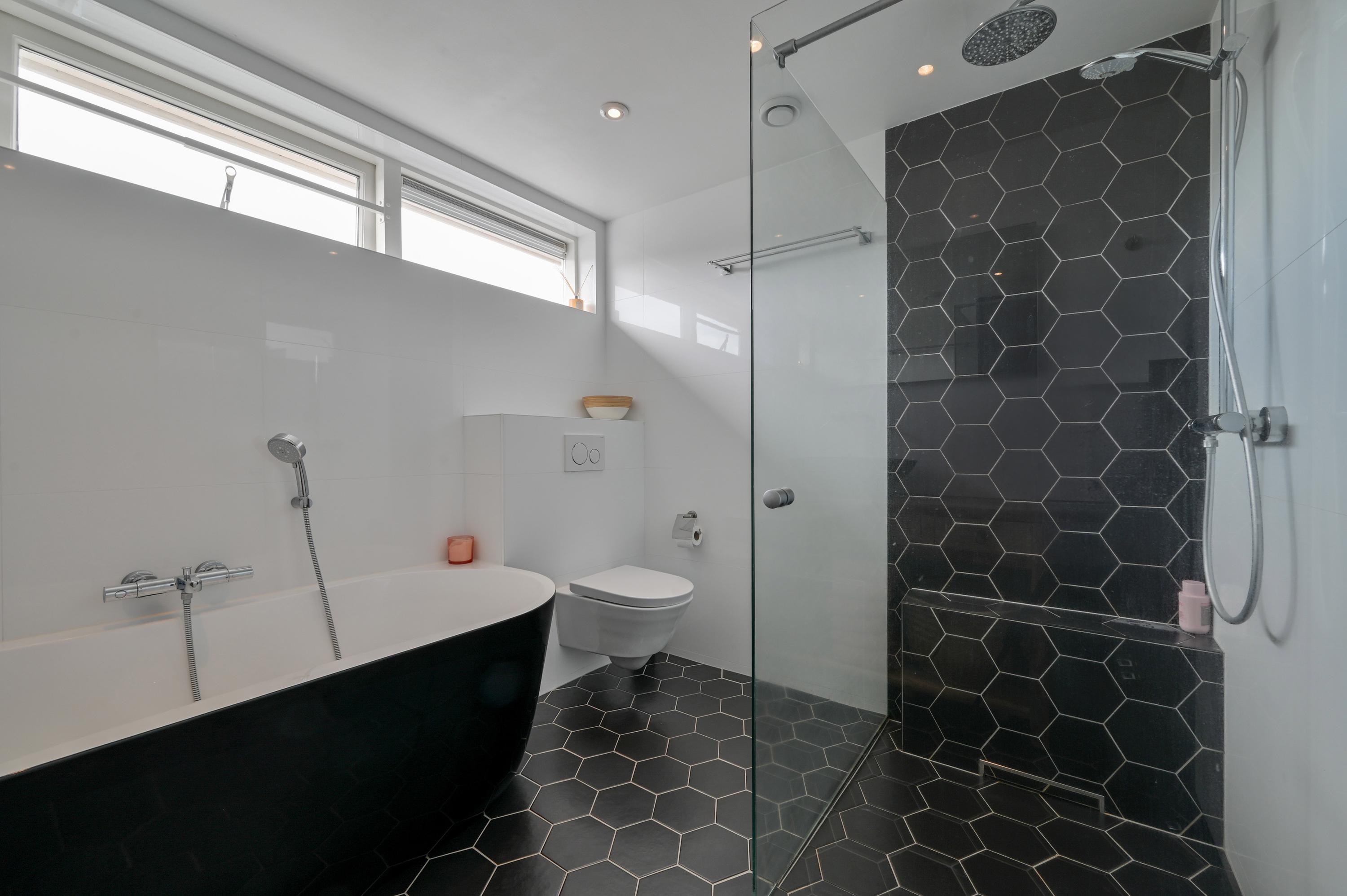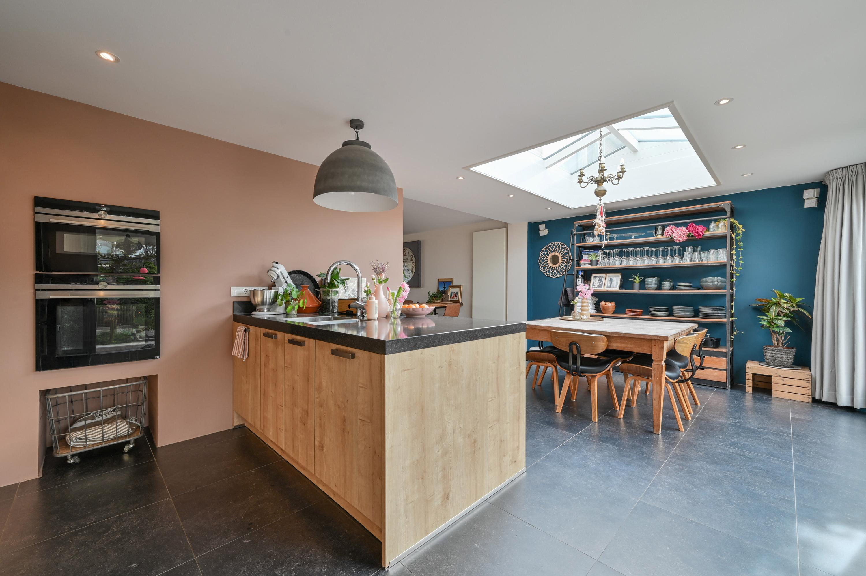 At the rear, the house has been extended to create a spacious open-plan kitchen that truly forms the centerpiece of the home. A skylight allows beautiful natural light to flood in throughout the day. The tiled floor with underfloor heating ensures comfort in every season. The kitchen is both practical and luxurious, featuring a kitchen island with sink, dishwasher, and a Grohe boiling water tap. On the opposite side, you’ll find the cooking area with a 5-burner gas stove, oven, and combination oven. The kitchen easily accommodates a large dining table, making it the perfect setting for long dinners and social gatherings. French doors and a separate door provide direct access to the garden, seamlessly connecting indoor and outdoor living.