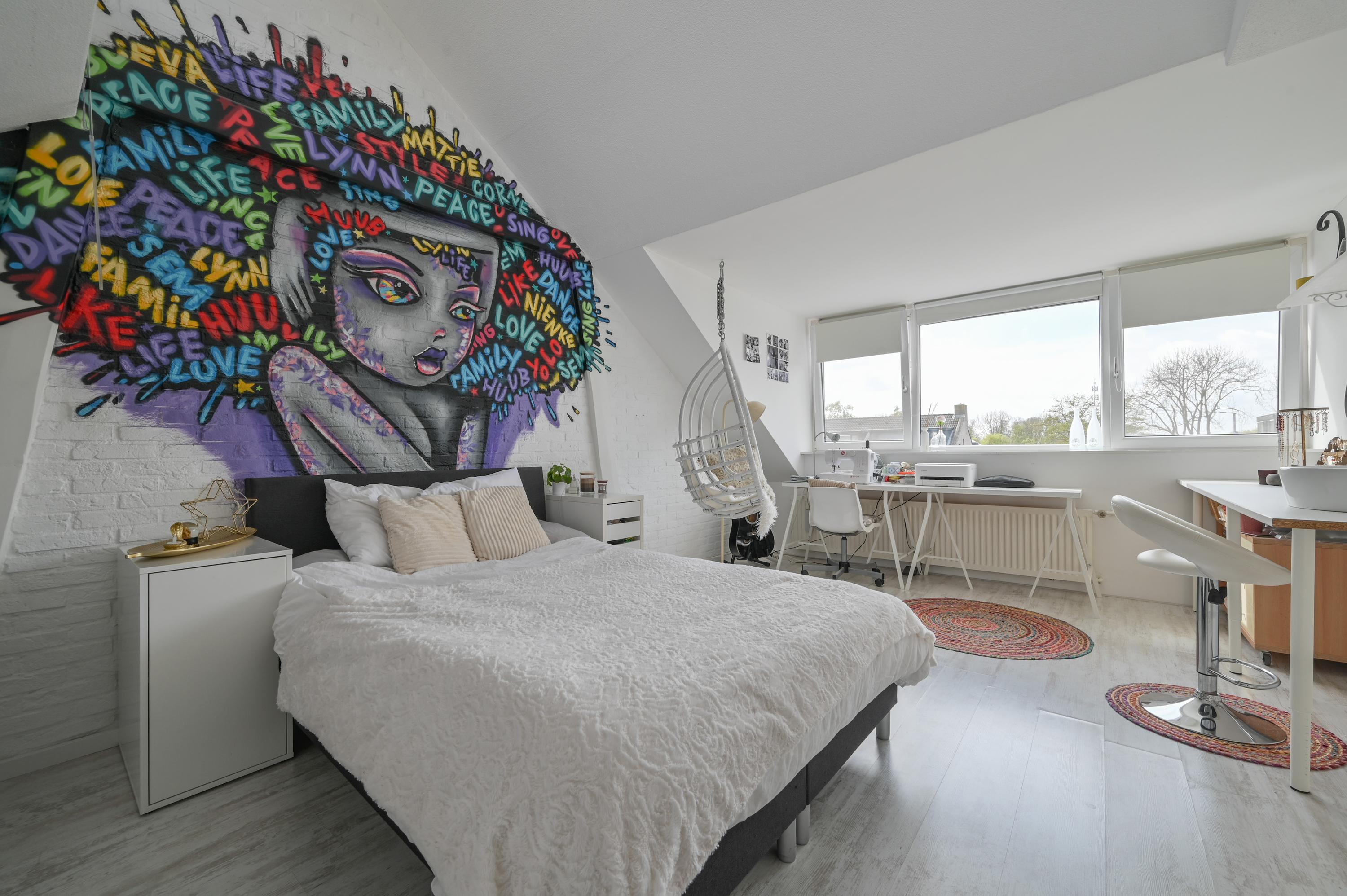 The bedroom on this floor has a playful layout. A high window provides beautiful light, while the dormer adds extra space and comfort. The room also features a built-in mirrored wardrobe and additional storage in the sloped ceiling area. There is also a convenient sink and unobstructed views over the meadows, further enhancing the sense of space and freedom.