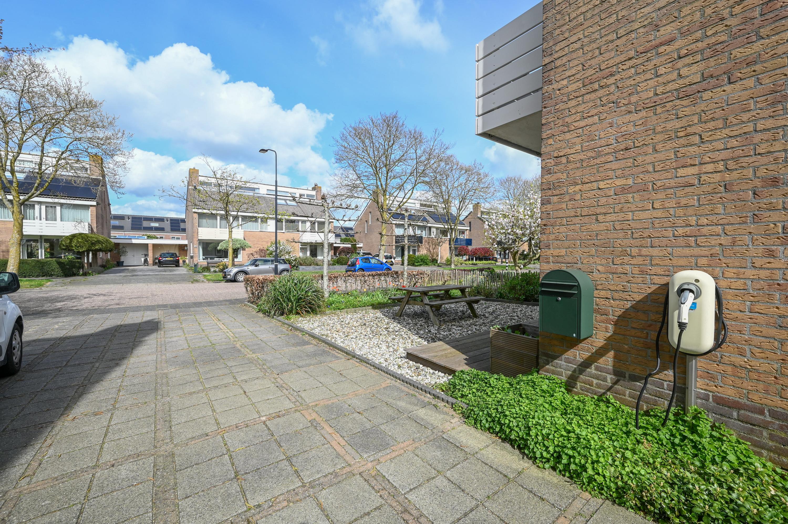 The garage is practically laid out and divided into two sections: at the front, there is a convenient storage area with connections for a washing machine and dryer, while the rear is currently used as an atmospheric lounge area — a versatile extra living space. The house is also well-equipped: a spacious driveway with room for at least three cars, a charging point for an electric vehicle, and 14 solar panels contribute to comfortable and future-proof living. The generous 400 m² plot completes the picture and enhances the sense of space around the property.