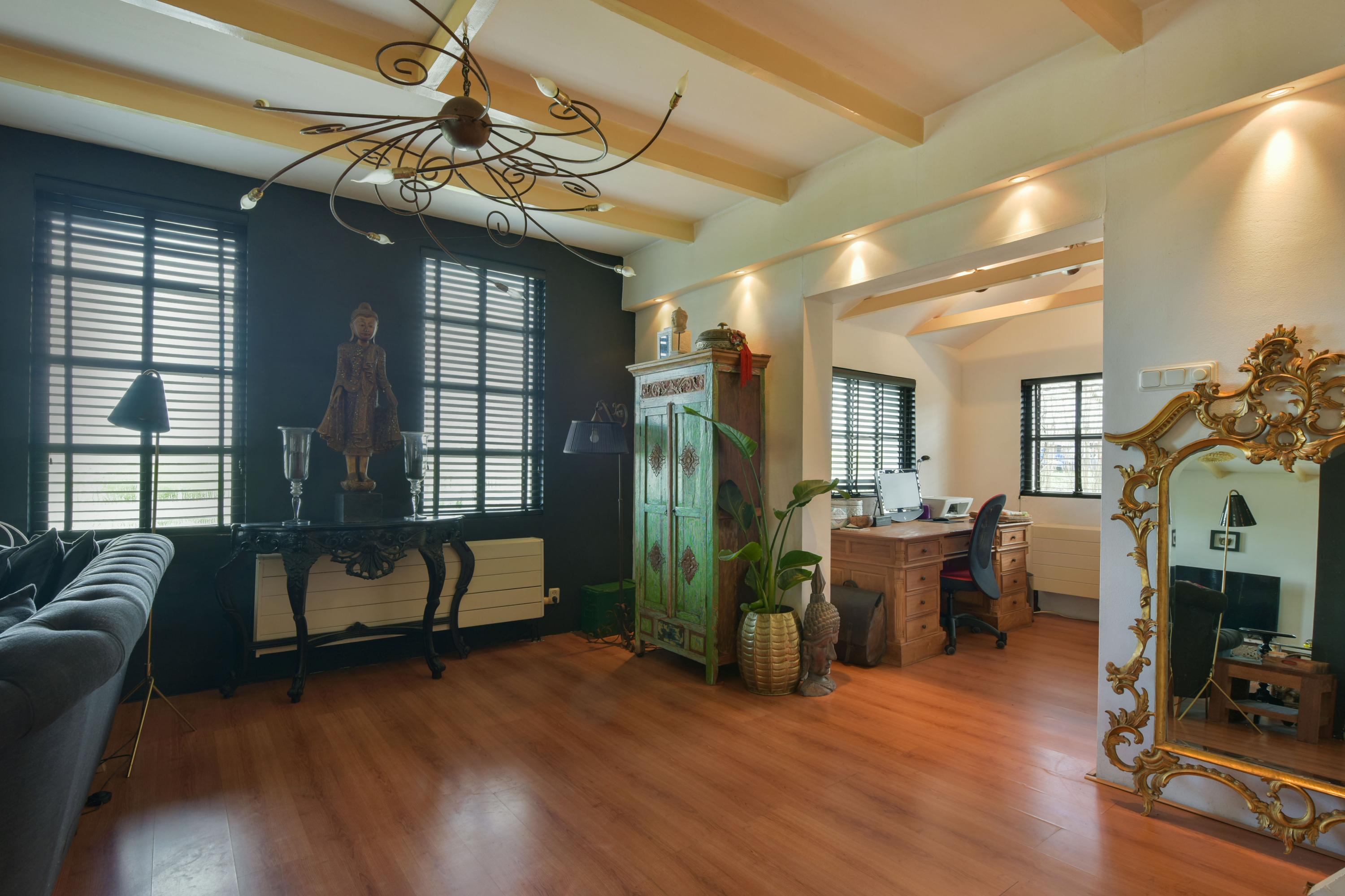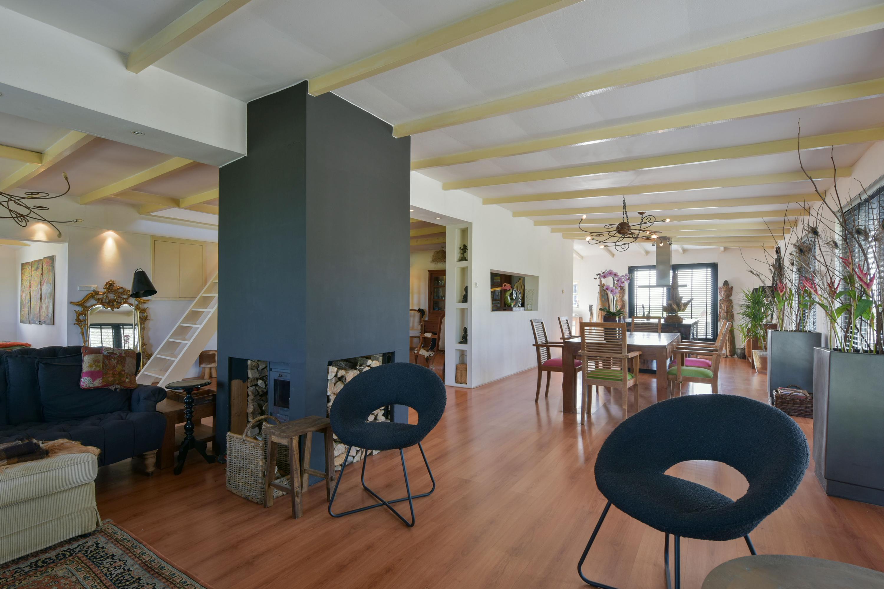 The large fireplace with wood-burning stove forms the warm heart of the space, while the wooden ceiling beams add to the charming, country-style atmosphere. In addition, a separate corner has been created, currently set up as a home office—ideal for working from home or as a quiet reading or hobby space.