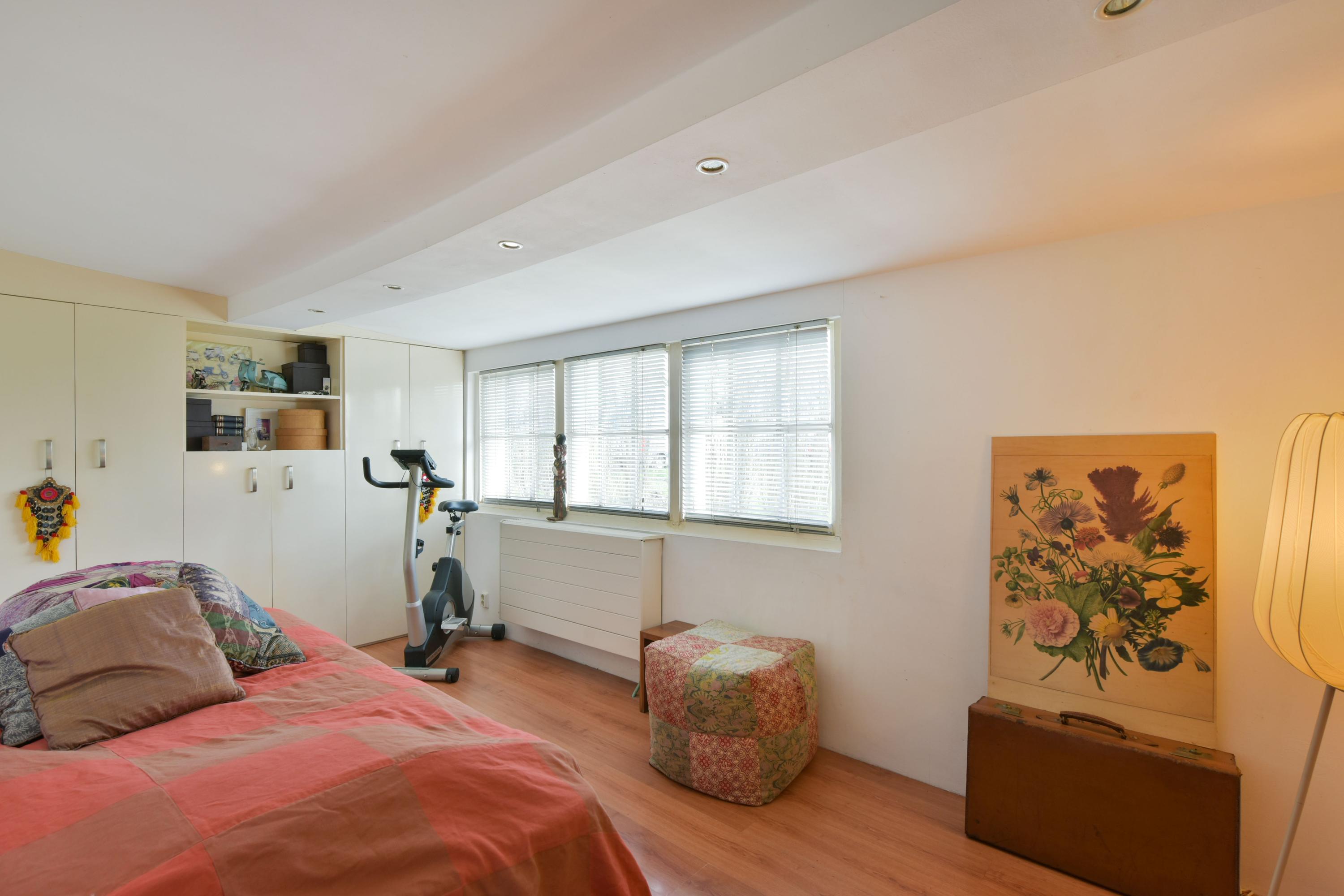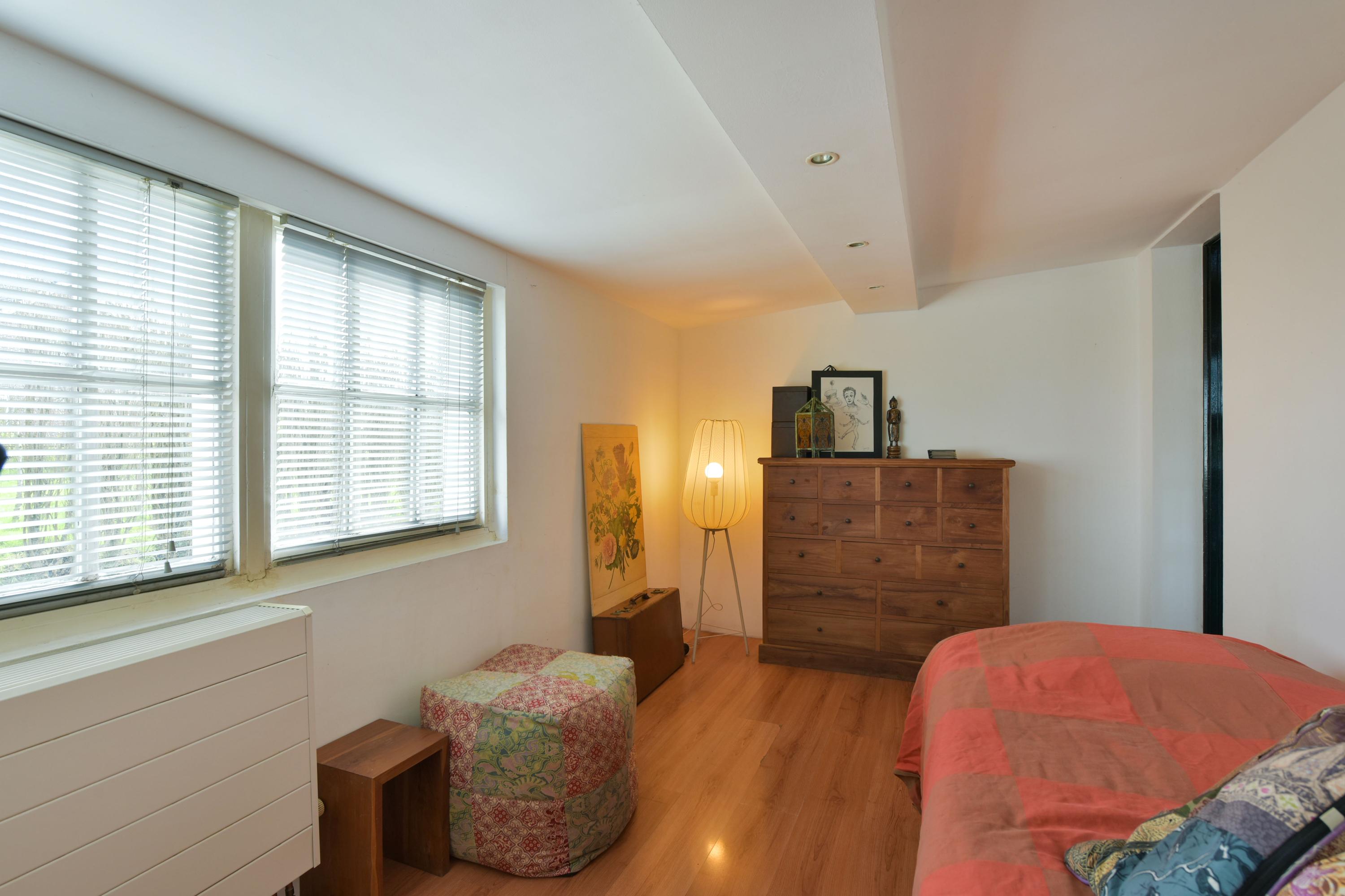 From the living room, the ground floor bedroom is accessible. This room features two built-in wardrobes and offers plenty of possibilities: from a comfortable master bedroom to a guest room or workspace.