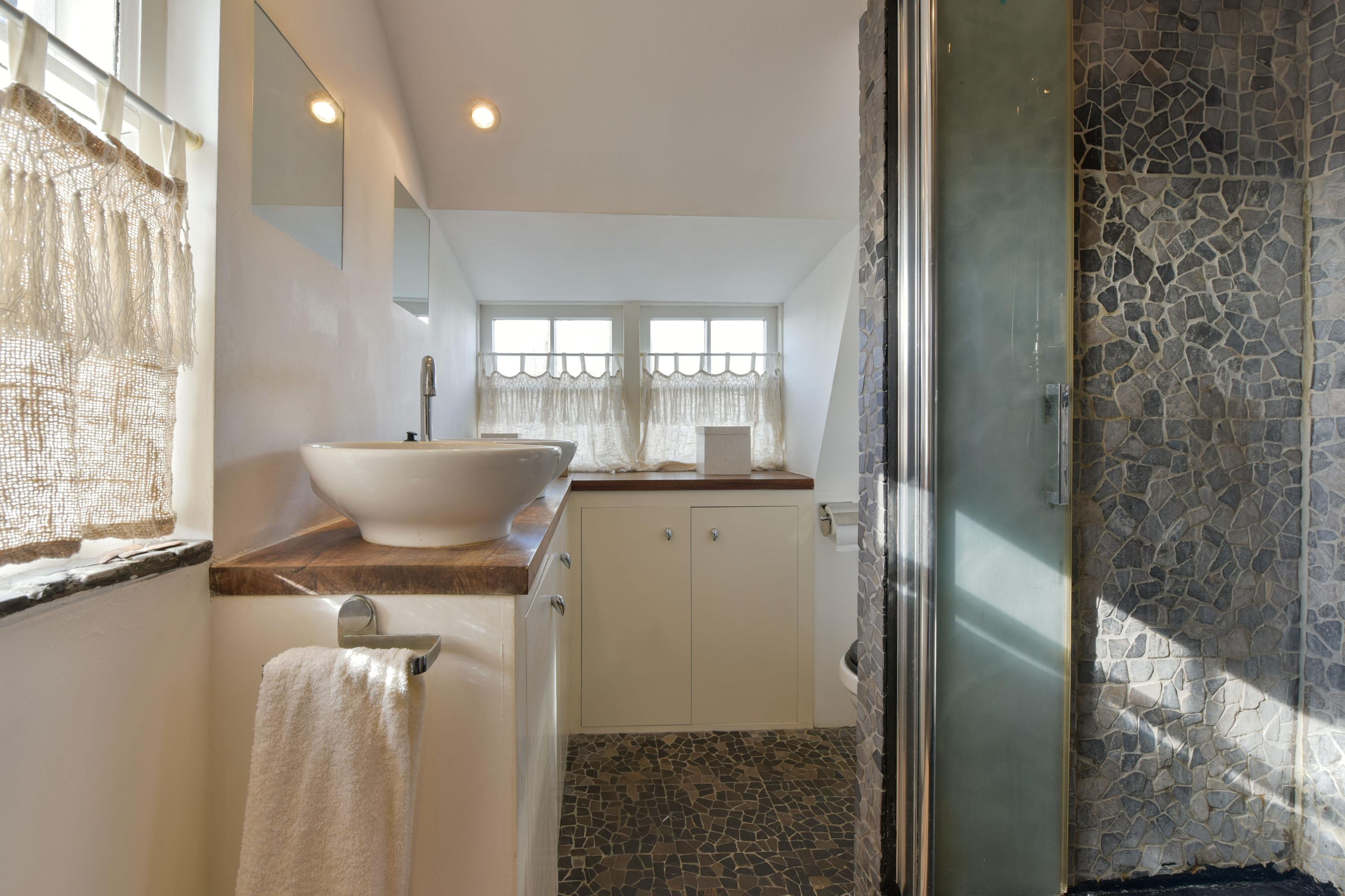 The bathroom, located at the rear of the house, is fully equipped. Here you can enjoy a spacious walk-in shower with rain shower, a luxurious whirlpool bathtub, a toilet, a double vanity unit, and a towel radiator. A perfect place to start or end your day in relaxation.