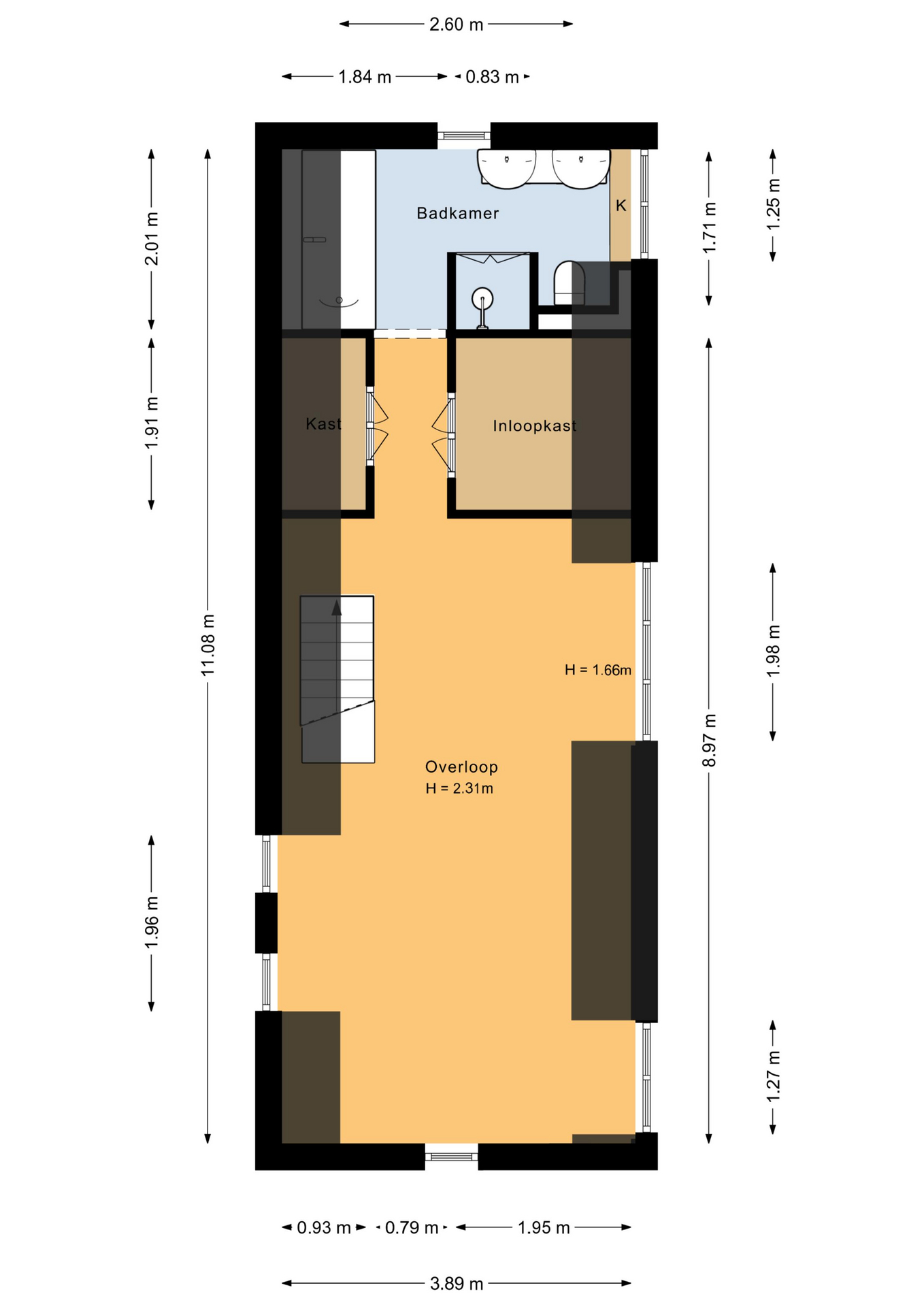 The staircase in the living room leads to the first floor. Here you will find a spacious bedroom with two large built-in wardrobes, ideal for those who require plenty of storage space.