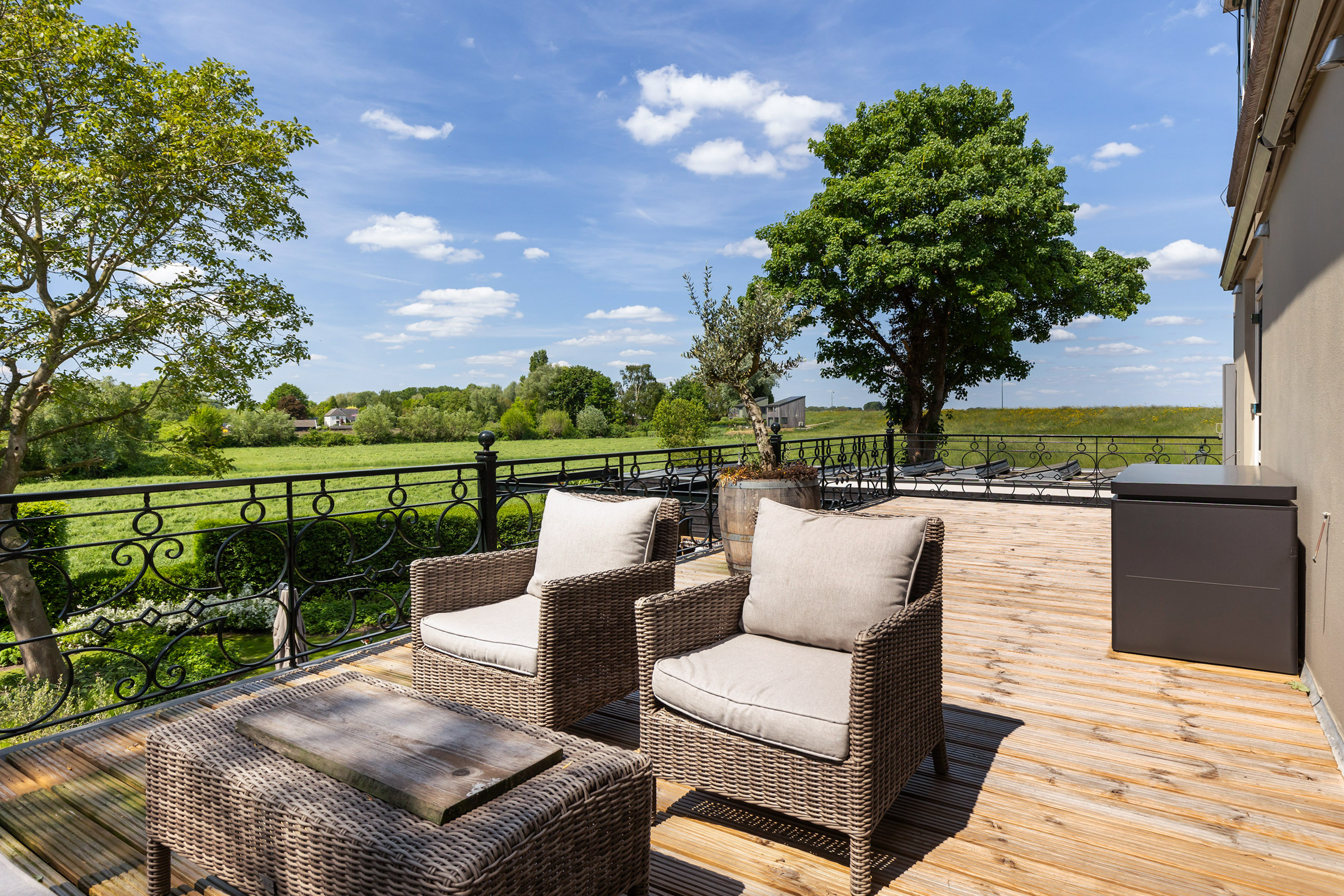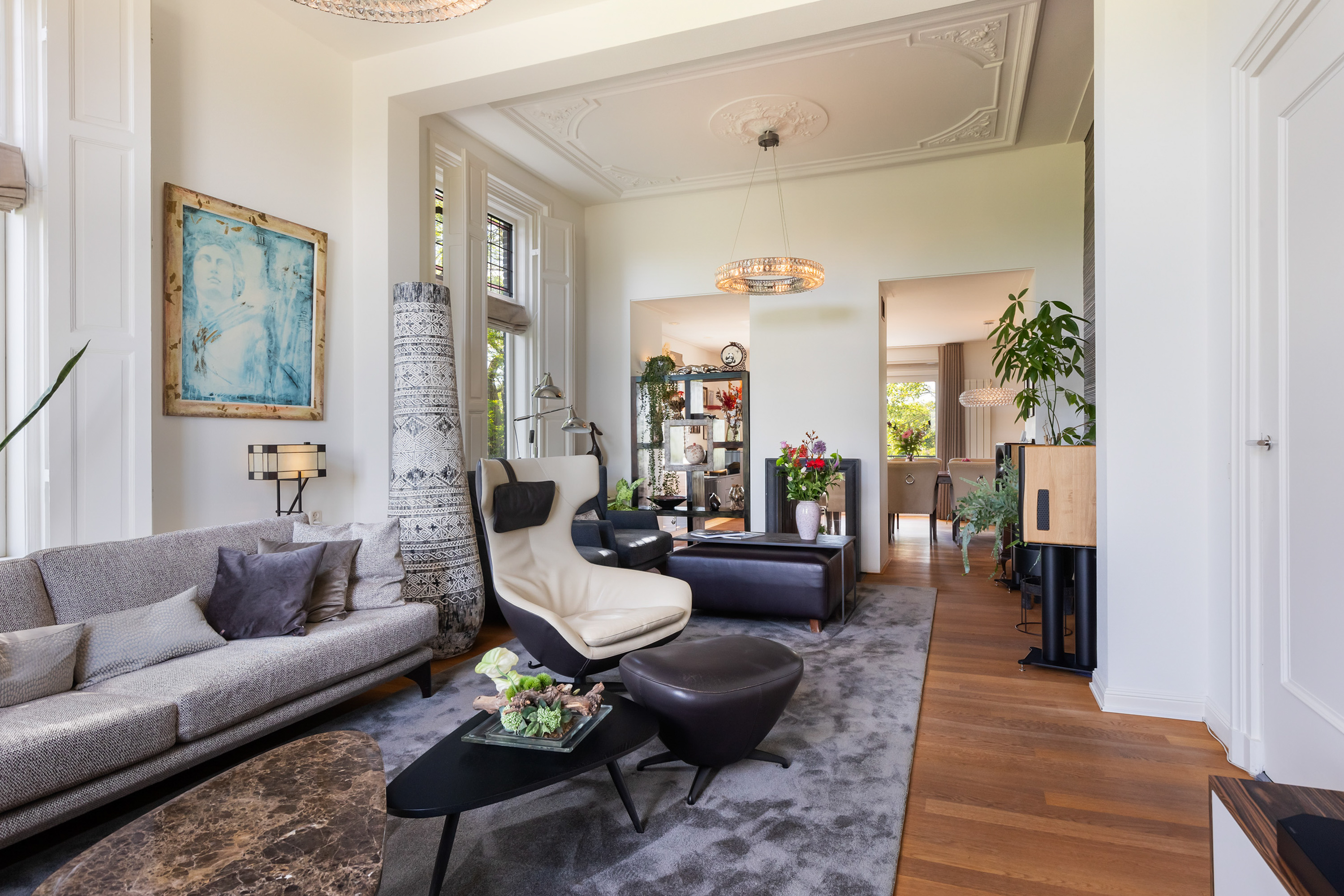 The outdoor space forms a natural extension of the home. The garden, redesigned in 2022, has been thoughtfully arranged with a focus on tranquillity and usability. Clean lines are combined with natural planting, and multiple terraces offer both sun and shade throughout the day. The veranda, featuring a timber beam ceiling and prepared for an outdoor kitchen and wellness facilities, enhances the enjoyment of outdoor living. To the side of the plot, a second garden area with lawn and a graceful weeping willow adds to the sense of greenery and privacy.