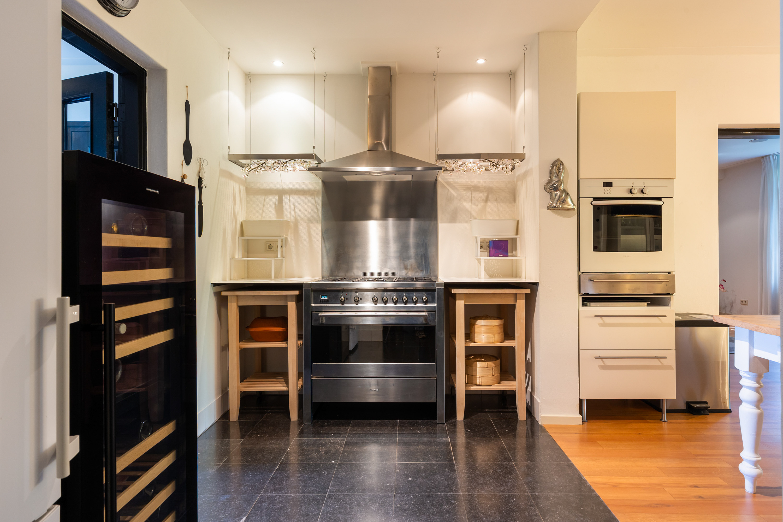 The villa distinguishes itself not only by its setting, but also by its versatility. Arranged over four full floors, the layout naturally accommodates a combination of living, working and hosting. At dike level lies the heart of the home: an elegant living floor where various living spaces flow seamlessly together. From the vestibule, one enters a generous study with fireplace and views across the river. The adjoining living room, dining area and open-plan kitchen form a cohesive and spacious environment, unified by a stylish double-sided fireplace. Large windows and French doors provide direct access to the balcony, where uninterrupted views over the water and surrounding countryside create an ever-changing and captivating backdrop.