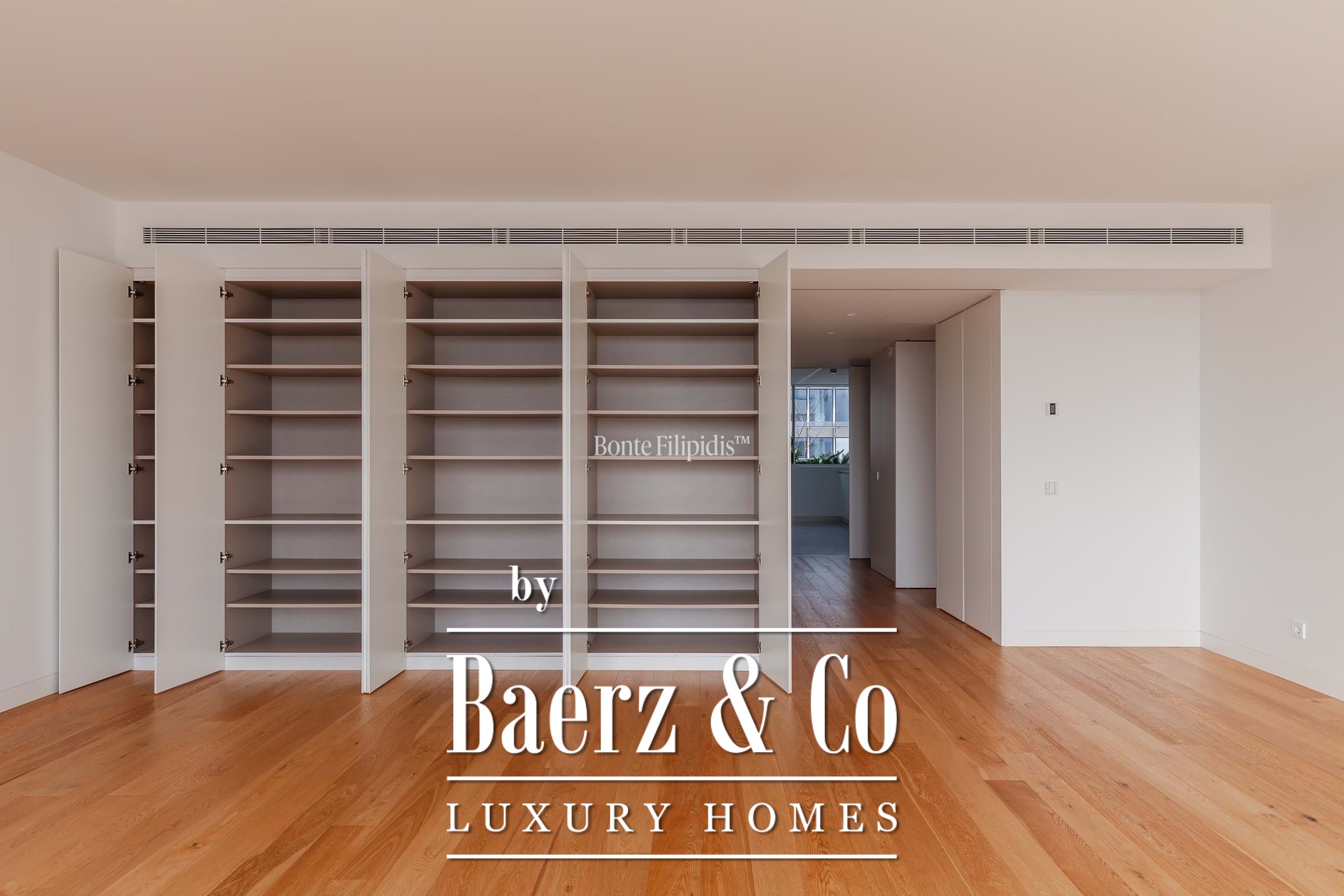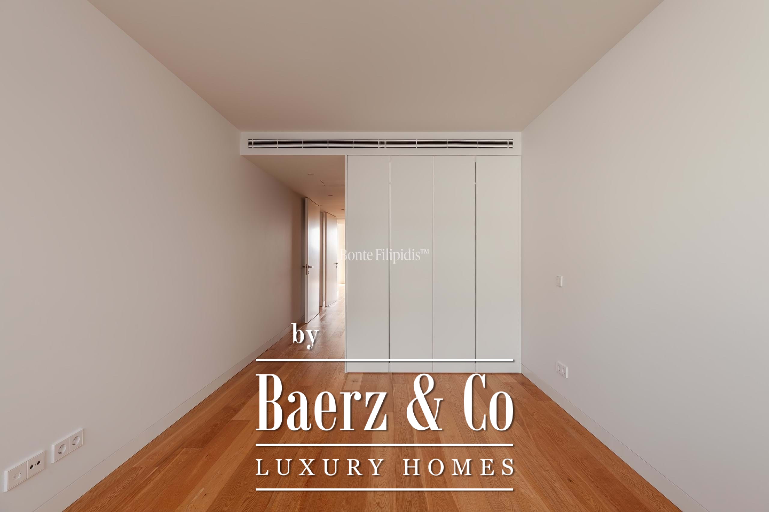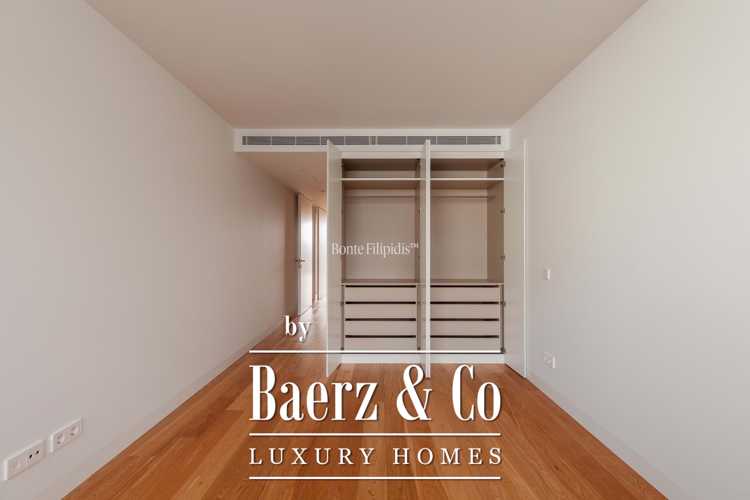 The principal suite is finished with fitted wardrobes and an en suite bath in natural stone. Two additional bedrooms offer generous proportions, wide windows and integrated storage, complemented by a total of three bathrooms. Solid wood flooring, refined cabinetry, and a fully equipped kitchen with high-quality appliances underline a focus on modern comfort.