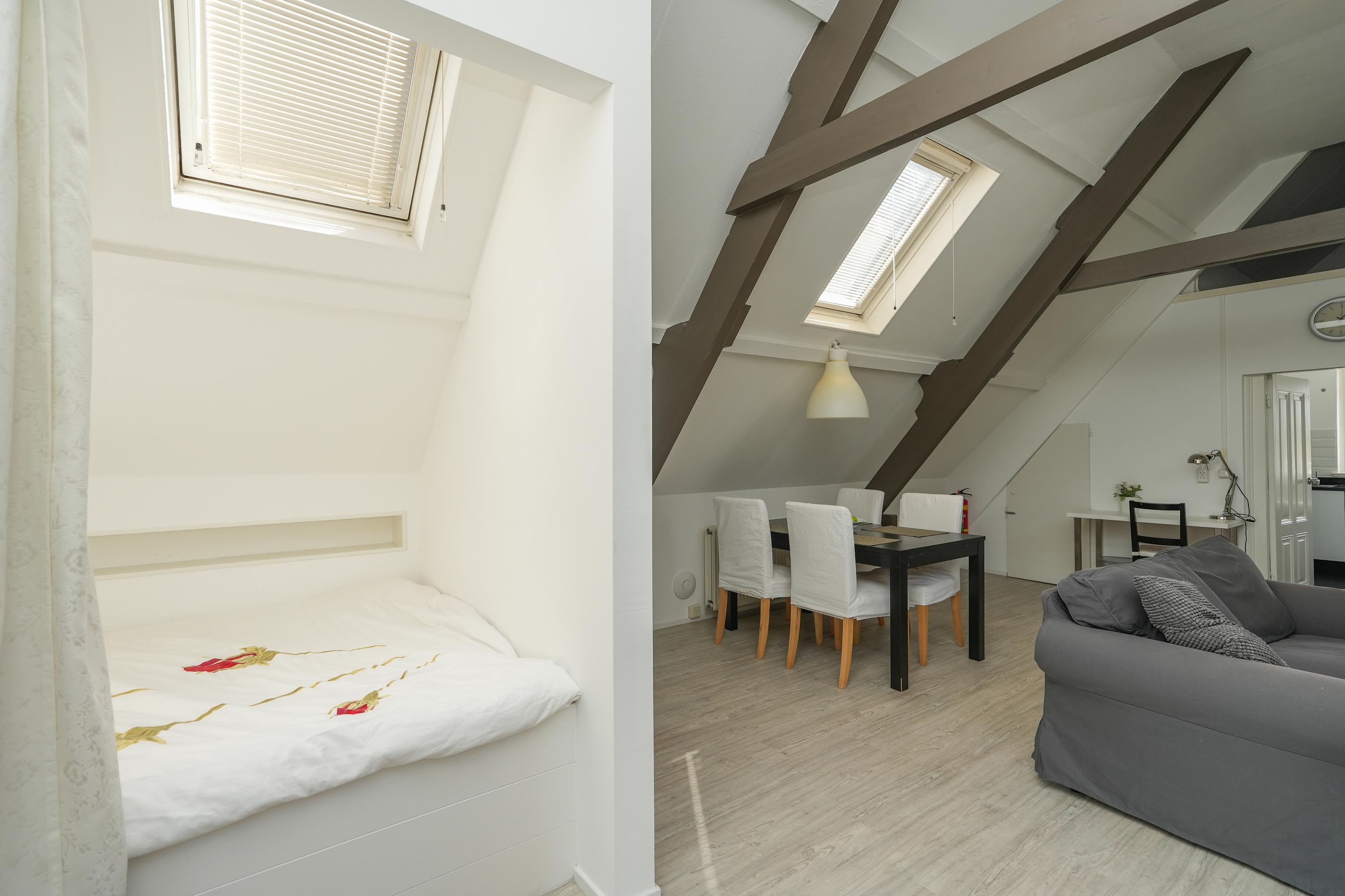 Middels een vaste trap is de bovenste verdieping bereikbaar, hier bevindt zich een ruime woonkamer met een bedstee. Tevens is er een moderne dichte keuken met witgoedaansluiting en er is een functionele badkamer met toilet en douche. Deze verdieping is sfeervol doordat de originele constructiebalken zichtbaar zijn gebleven en de ruimte is lekker licht door de dakramen. Bovendien is er veel bergruimte in vaste kasten.