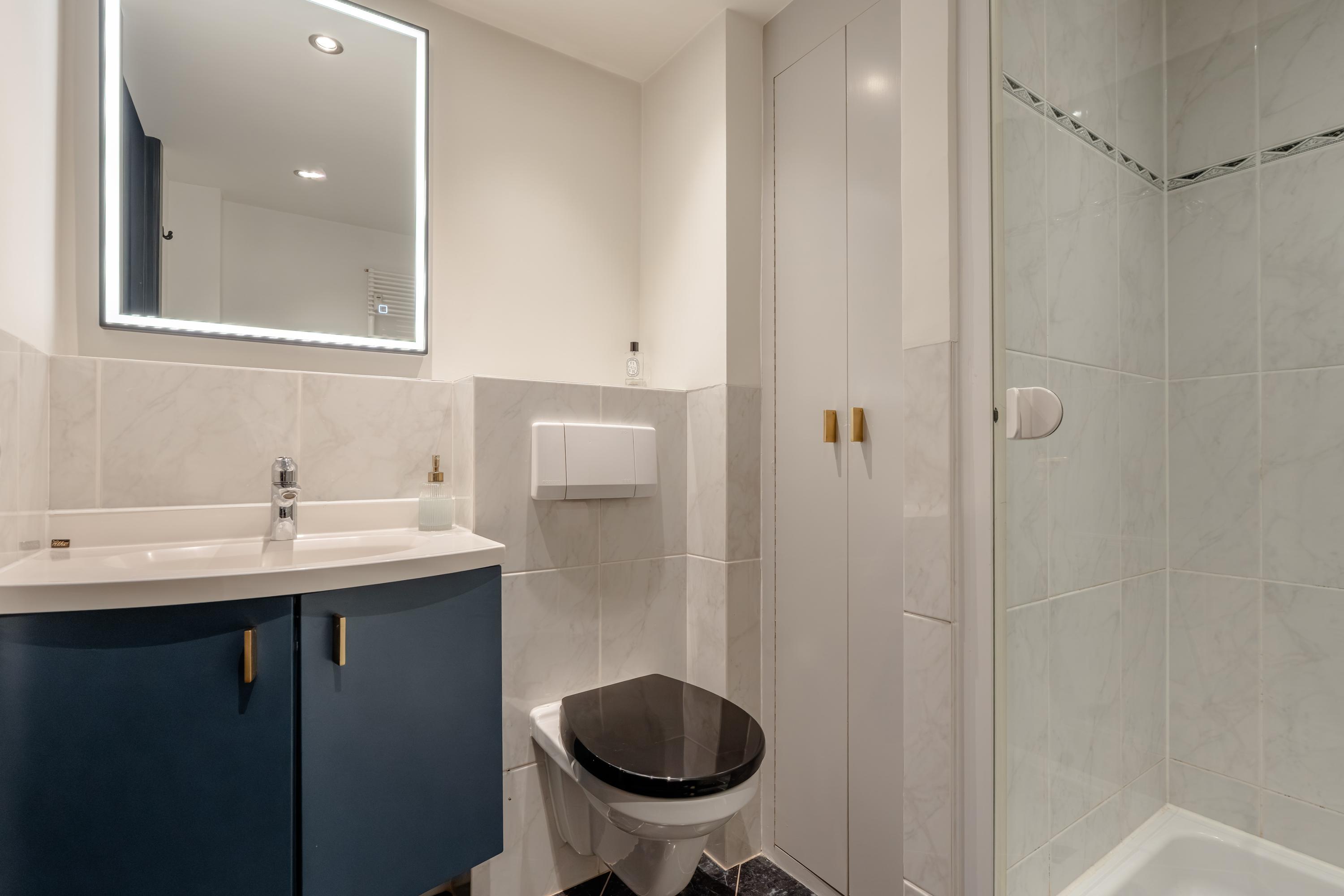 At the rear, you will find the two bedrooms and the centrally located bathroom, equipped with a shower, built-in storage, and a vanity unit with a heated mirror.