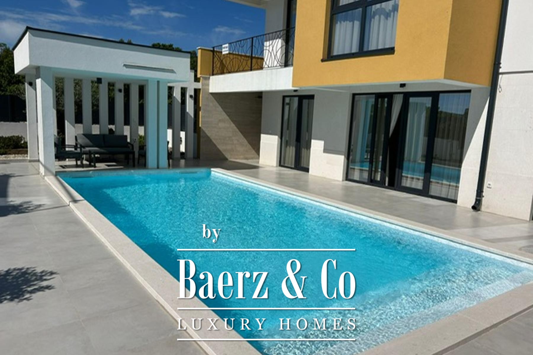 (tavern) located in the garden, equipped with a kitchen and WC, providing an ideal space for socializing and entertaining friends and family. Upstairs, there are three spacious bedrooms, each designed with an emphasis on comfort and style. The master bedroom has its own terrace with a beautiful view of the surrounding area and the sea. An additional bathroom on the upper floor ensures privacy and comfort for all residents.The villa is energy-efficient, ensuring low utility costs and a comfortable stay throughout the year. The balcony and terrace provide additional space for relaxing and enjoying the stunning sunset views, which are particularly enchanting here. The landscaped garden, pool, and konoba offer additional opportunities for entertainment and recreation, making this villa the perfect home for a family seeking luxury and comfort in a peaceful environment.Don't miss the opportunity to become the owner of this exceptional property. For any additional questions or to arrange a viewing, please feel free to contact us.