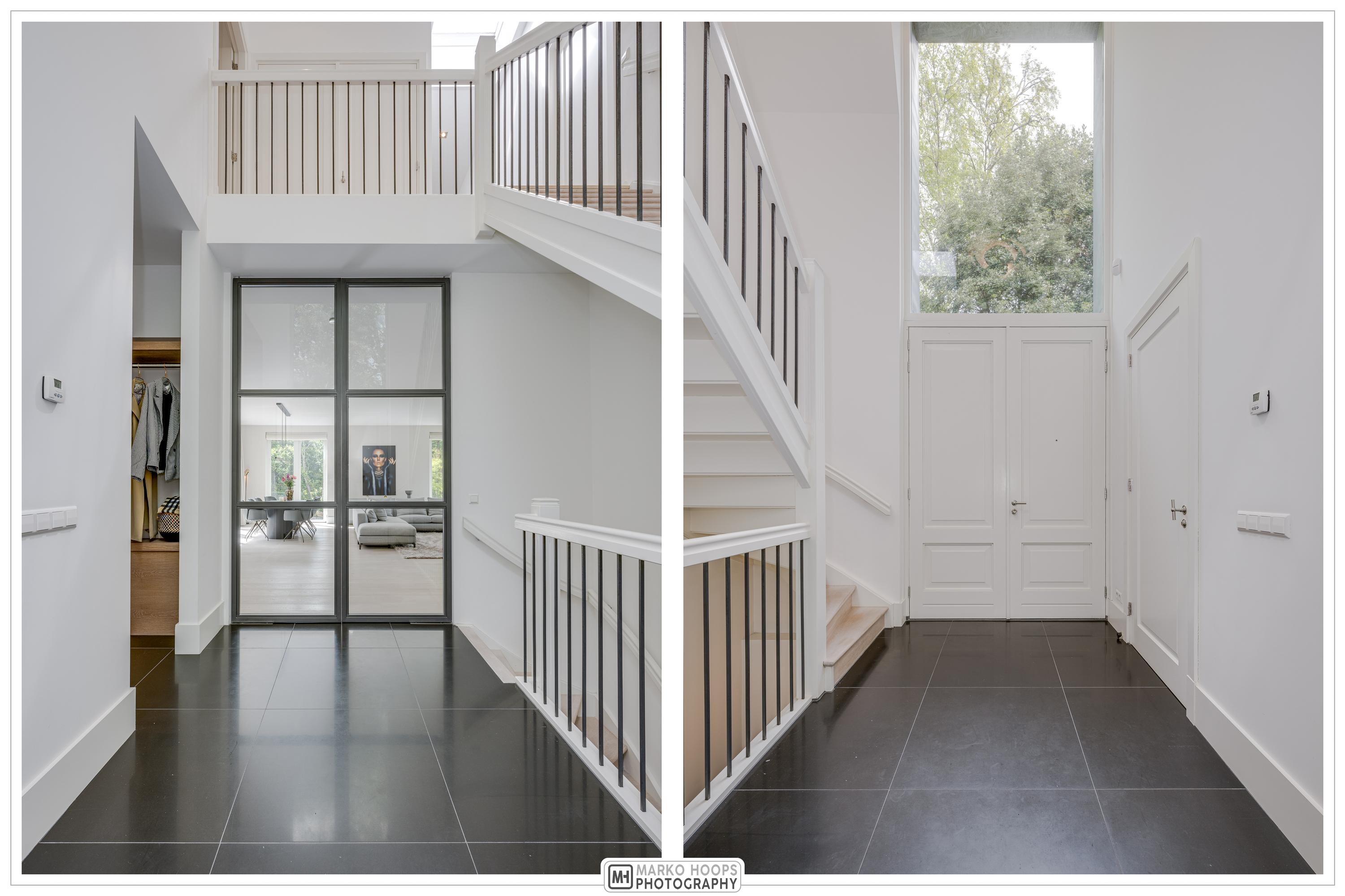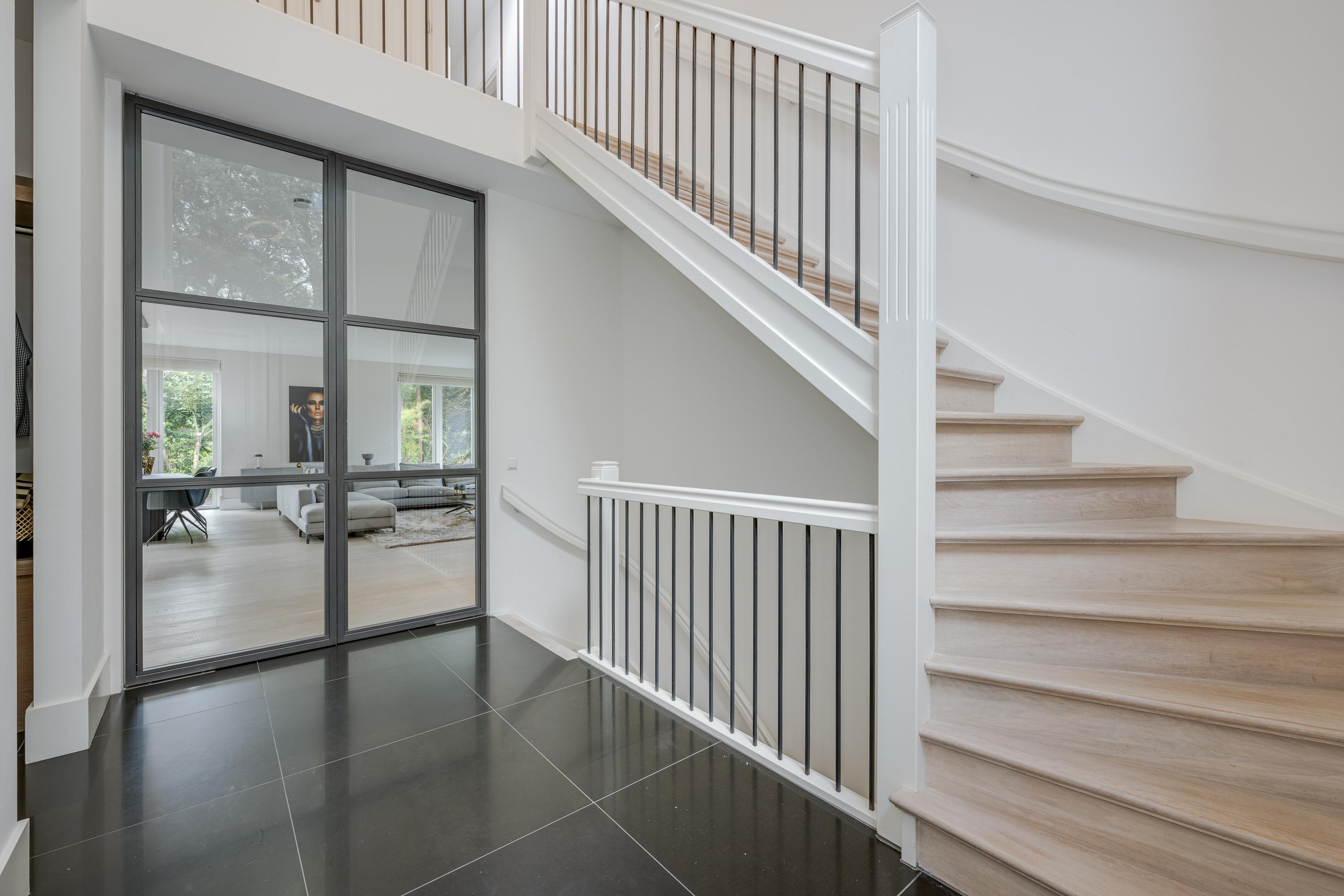 The landing with double entrance doors gives access to the spacious hall in which the stairwell and loft are centrally located. In the hall you will also find the guest toilet, a spacious wardrobe and the meter cupboard. The stairs that lead to the basement and the landing stairs to the upper floor are also located here. The double glass doors offer a view into the modern living room.