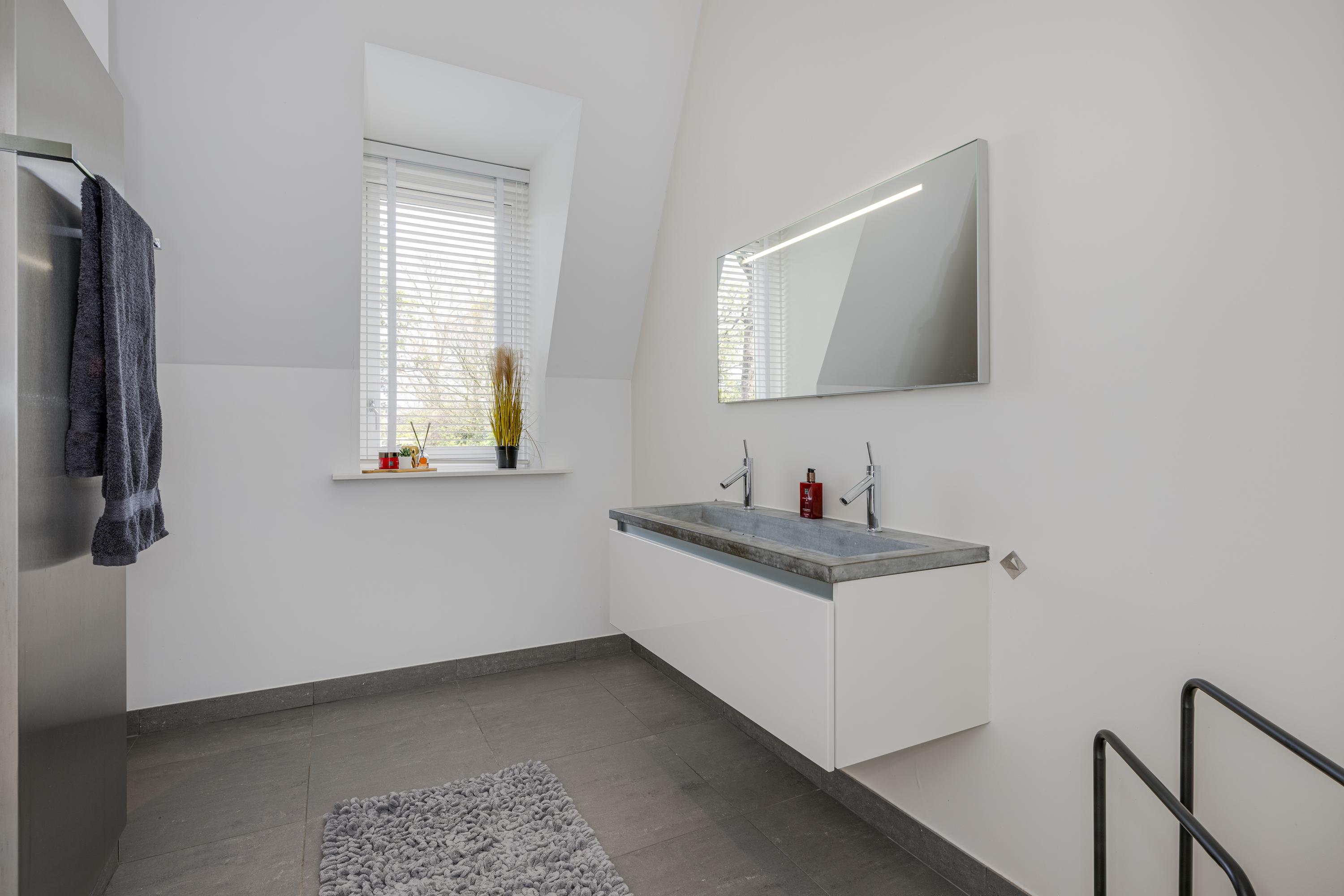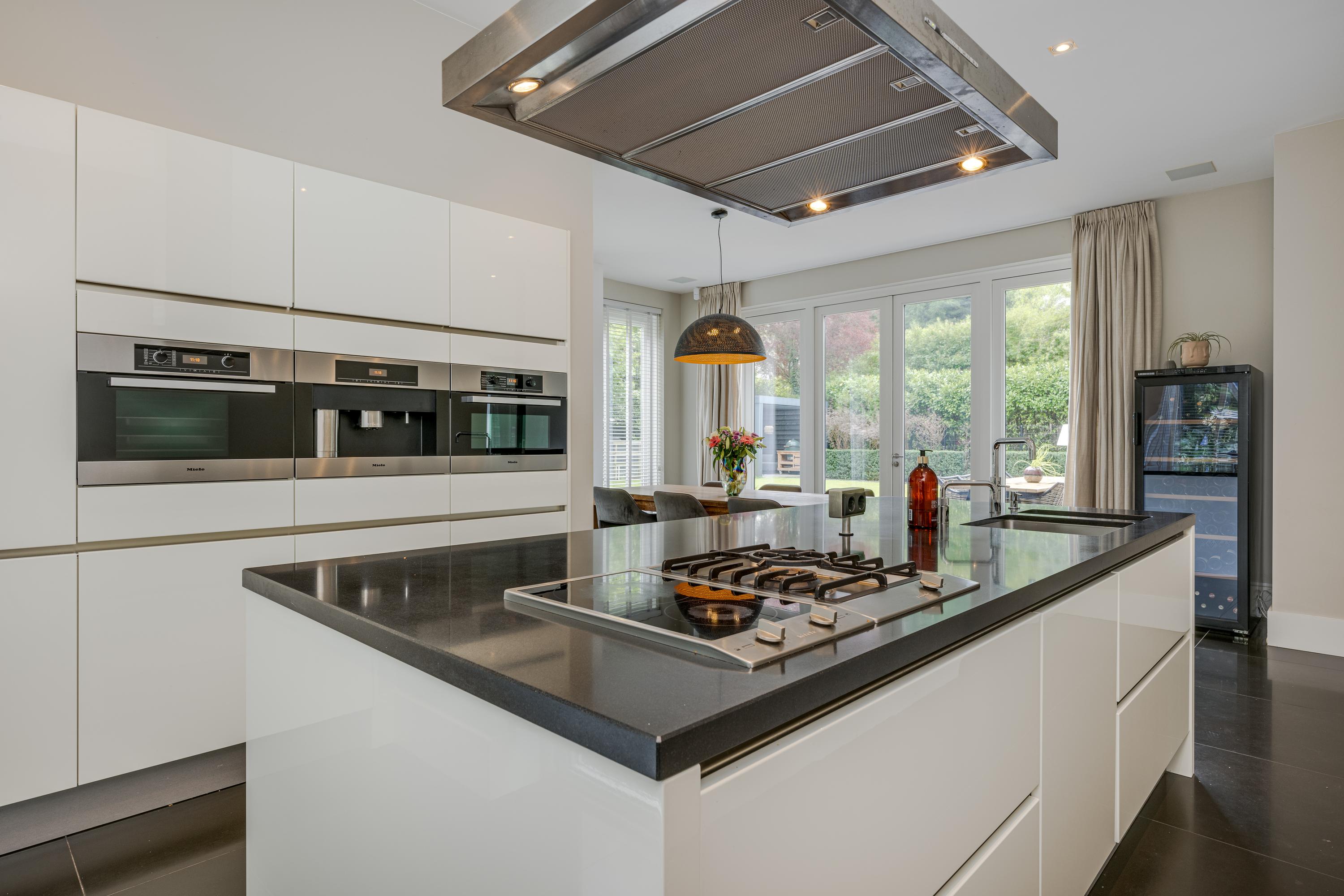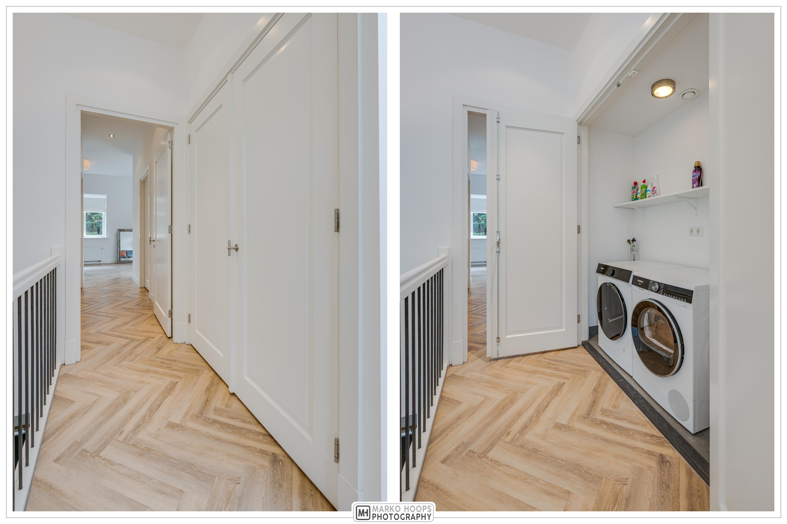 The modern kitchen is equipped with all desirable equipment, with the cooking island having a double sink, dishwasher, refrigerator and a gas and induction hob. The high wall provides space for the steam oven, combination microwave oven and coffee machine. In addition to cooking, the kitchen offers space for a very spacious dining table with a cozy gas fireplace. The double doors from the kitchen give access to the spacious terrace. Next to the kitchen is the utility room, equipped with a sink, plenty of cupboard space and a door to the garden.