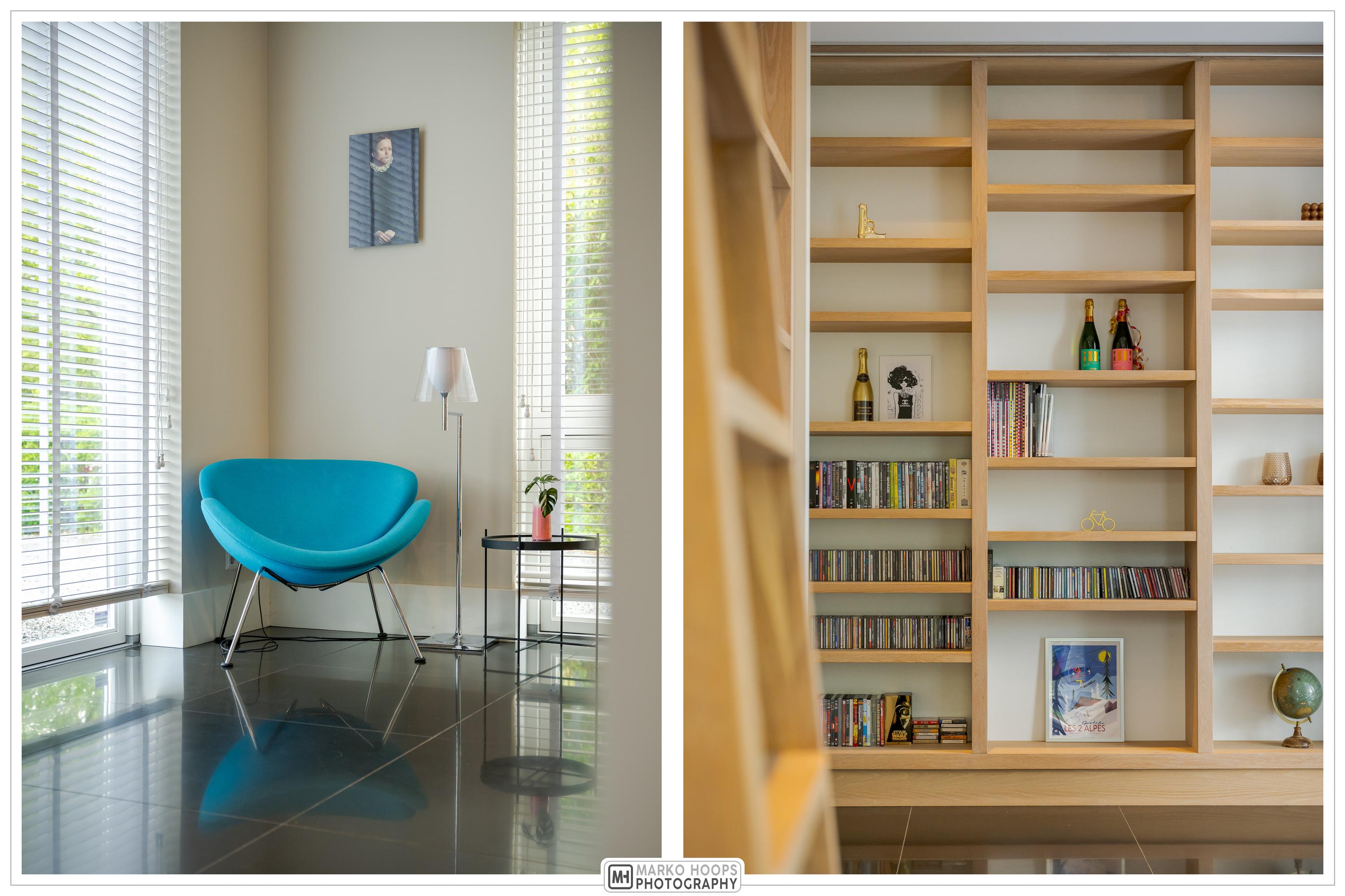 The living room has a light oak floor with a modern fireplace (wood-burning), high windows and double doors to the terrace, allowing light to enter from all sides at any time of the day and a view of the surrounding garden. The kitchen and study can be separated from the living room by modern sliding doors, but when opened, these rooms form one whole. The floor in the kitchen and study are made of bluestone, which together with the oak elements and colors create a beautiful effect. The office/library is spacious and has a built-in L-shaped book wall.