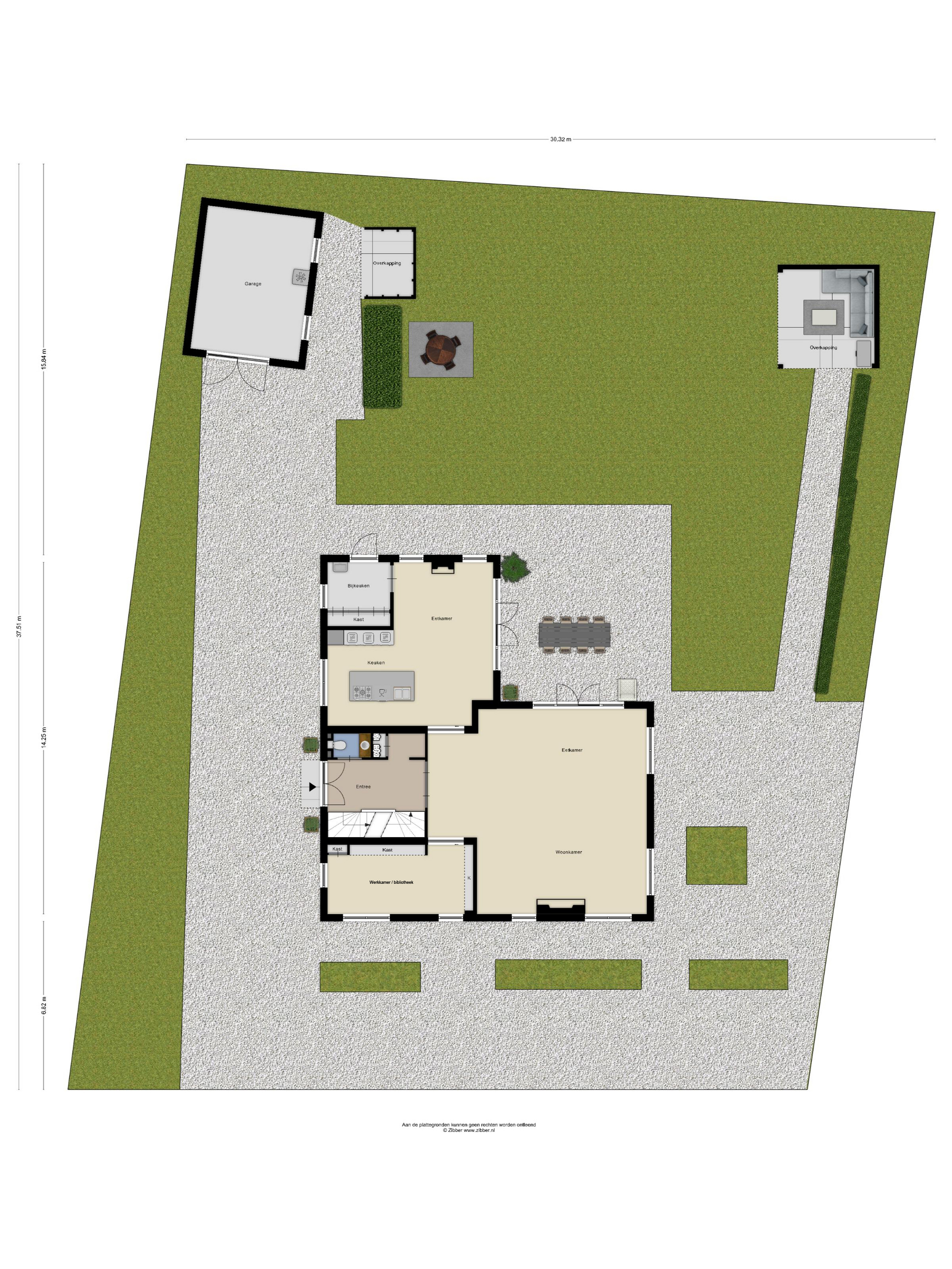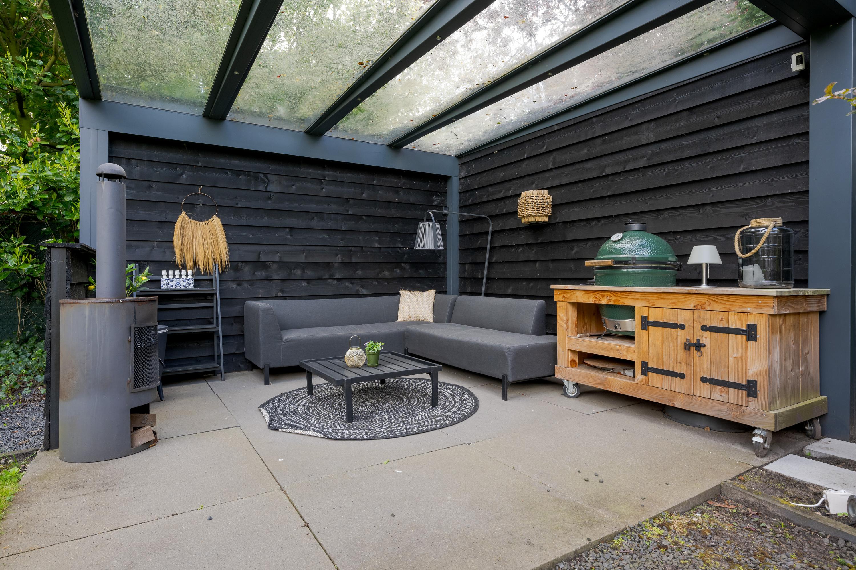 The garden has a very favorable sunny position. The sun shines on the plot from early in the morning until late in the evening. At the back of the garden is a seating area with a canopy and outdoor kitchen, a wonderfully sheltered place to have a BBQ or drink a nice glass of wine in the summer. The large terrace adjacent to the lawn faces south and various seating areas have been created around the house, so that you can enjoy the sun or shade at any time of the day.