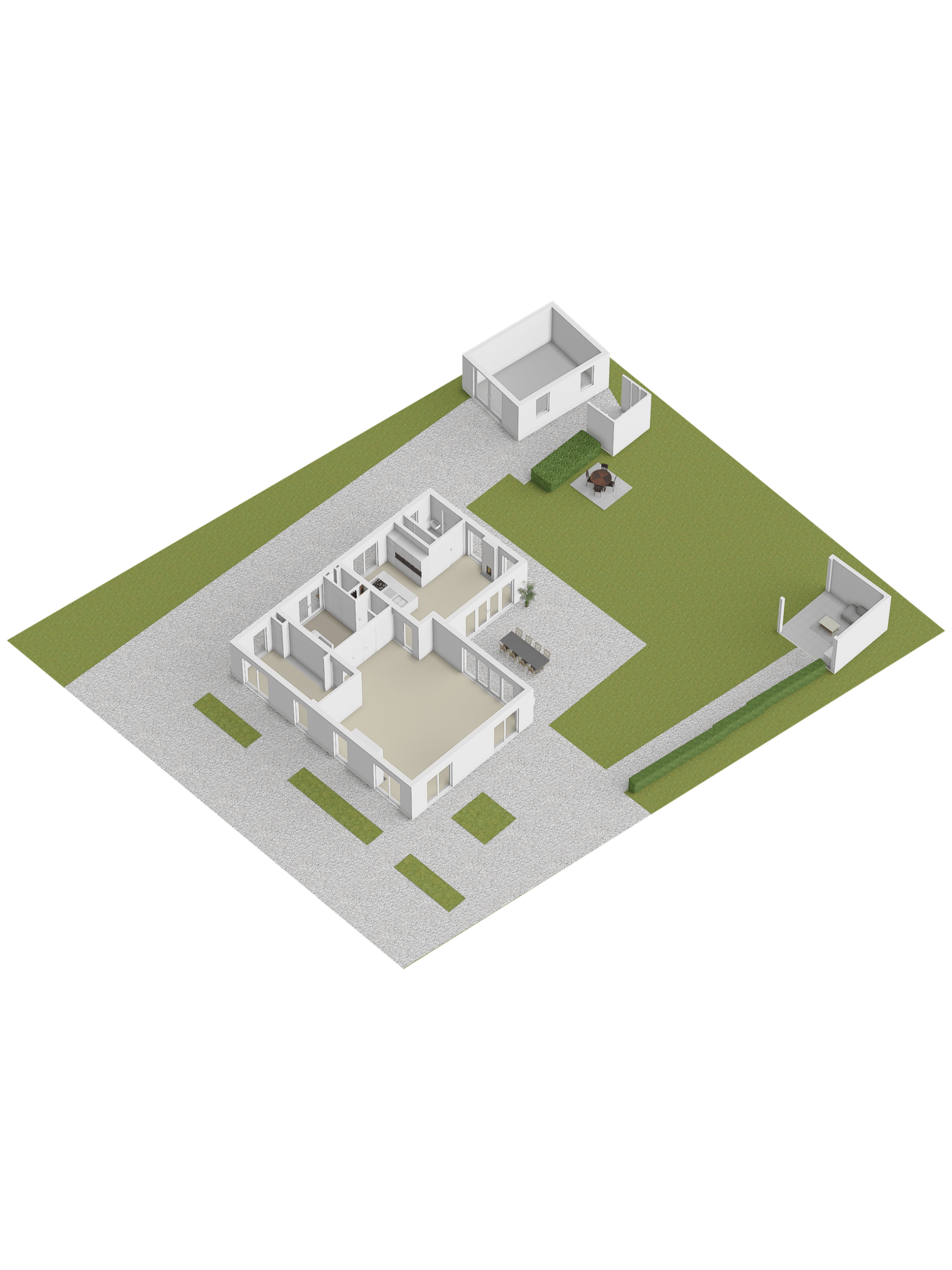 The driveway to the garage is accessible through the electric gate and offers space for several cars. At the back of the driveway is the garage, which has double doors, a window and a side door. The garage is suitable for a car, as well as bicycles and garden tools. The waste containers are located behind the garage.