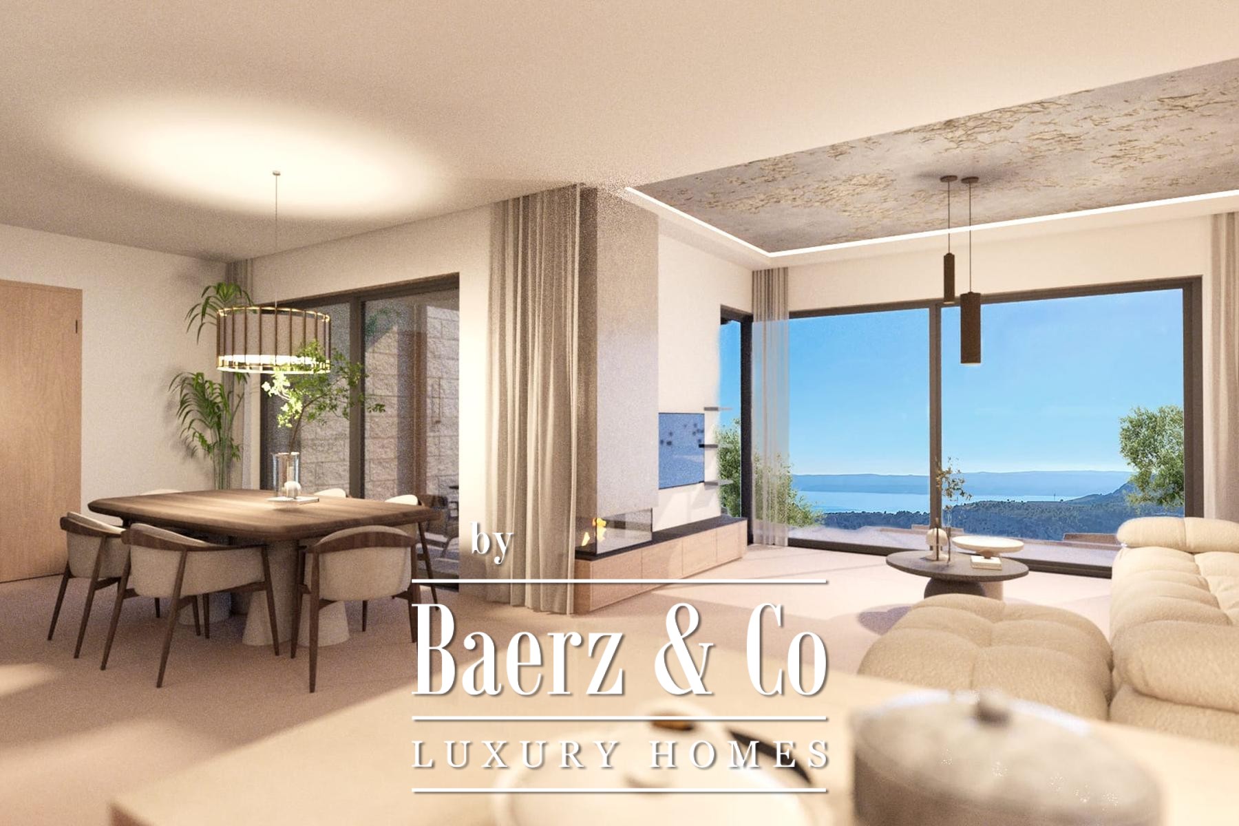 Two master bedrooms feature serene en-suite bathrooms, elegant walk-in closets, and direct access to private terraces oriented towards the Omiš Dinara and the shifting blue horizon beyond. On the ground floor, a flexible multipurpose room is tailored for wellness, guest accommodation, or refined gatherings.