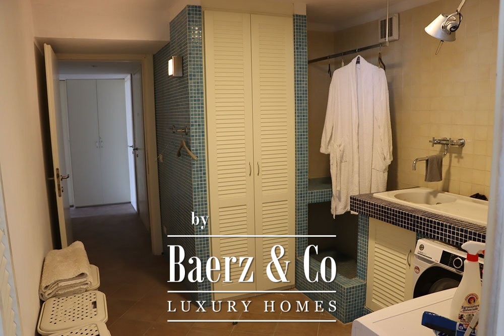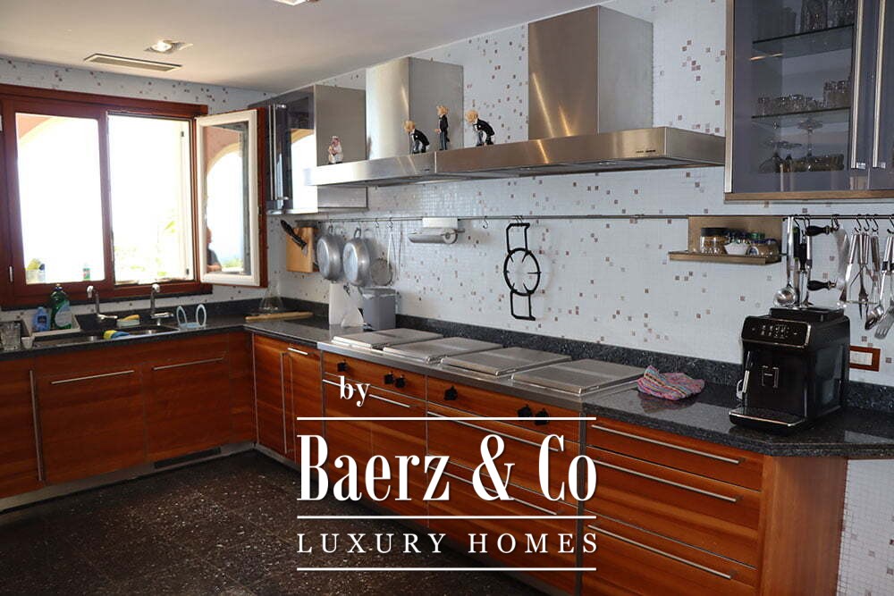 The ground floor flows around a generous living area, where an open professional kitchen integrates seamlessly with the dining space. Adjoining this is a winter garden with a second kitchen and barbecue, enclosed yet open to spectacular sea vistas. Practical features include a sizeable garage accommodating multiple cars, a dedicated pool shower, and a laundry room. The ground floor connects directly to a portico, leading outward onto terraces and a heated infinity pool that echoes the horizon.