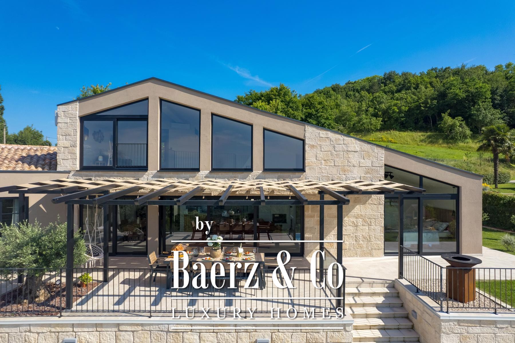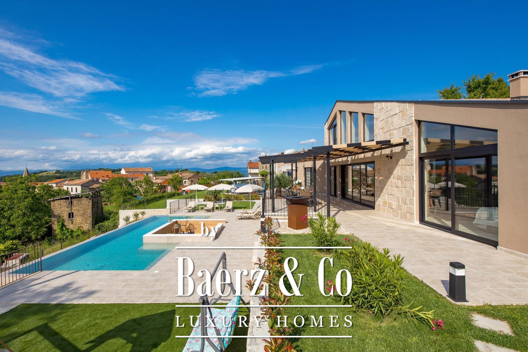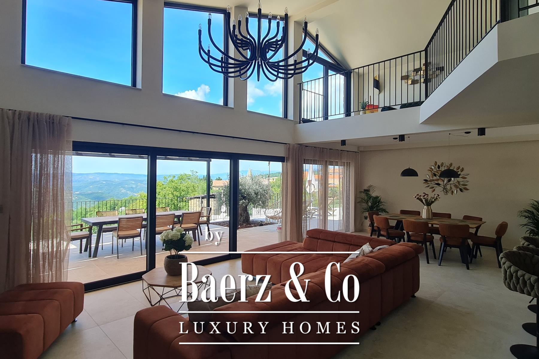 Luxury villa Pazin Okolica offers 230 m² of contemporary living space, set within a gated 1,420 m² plot surrounded by the gentle hills of Istria. The property commands sweeping panoramic views stretching from the lush landscape to Slovenia and Italy, delivering a rare sense of openness and seclusion synonymous with the region.