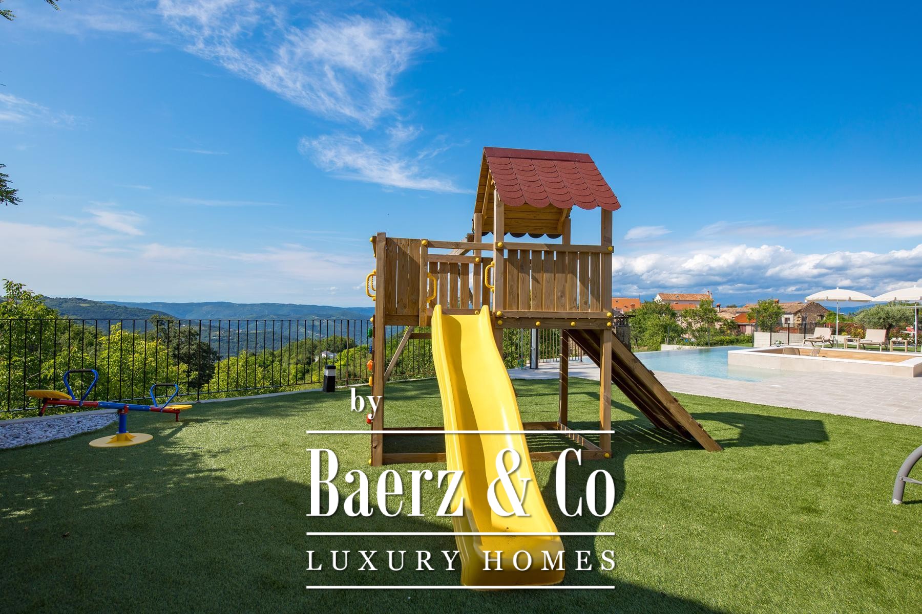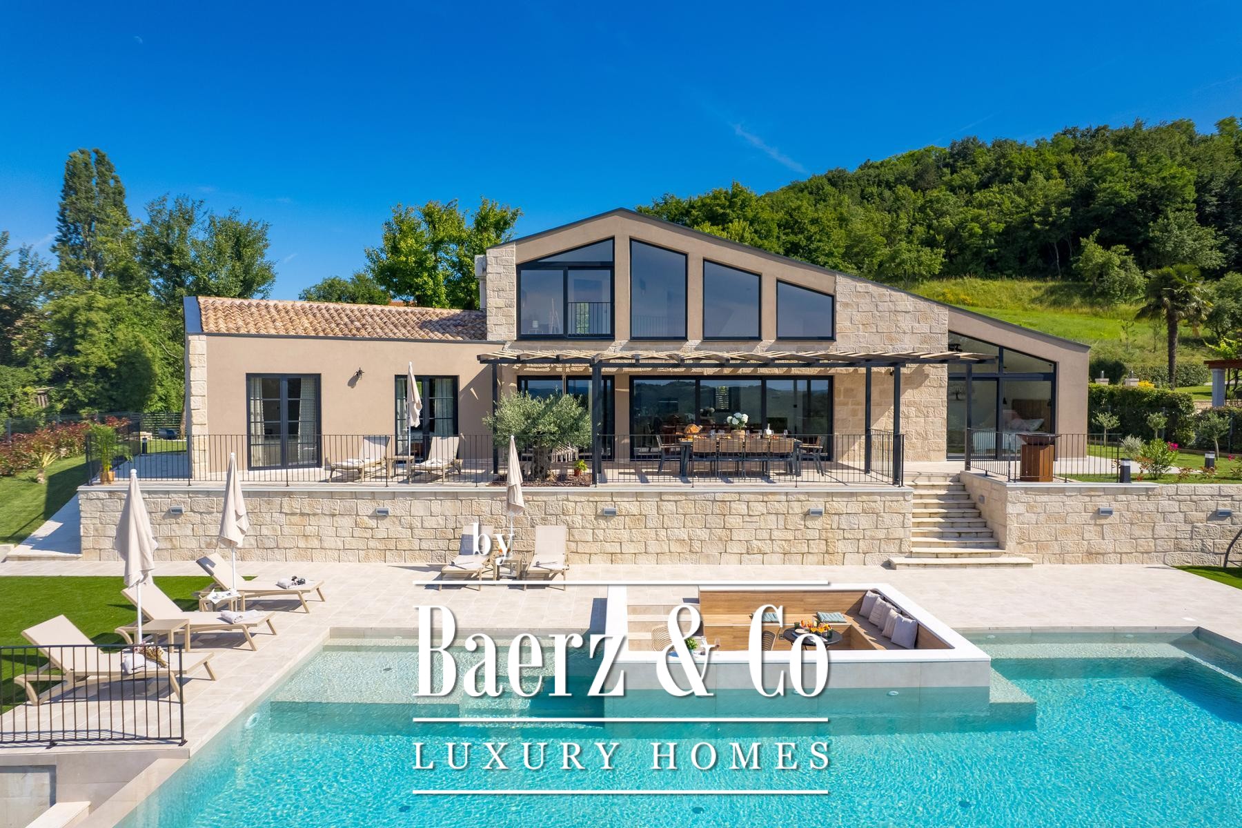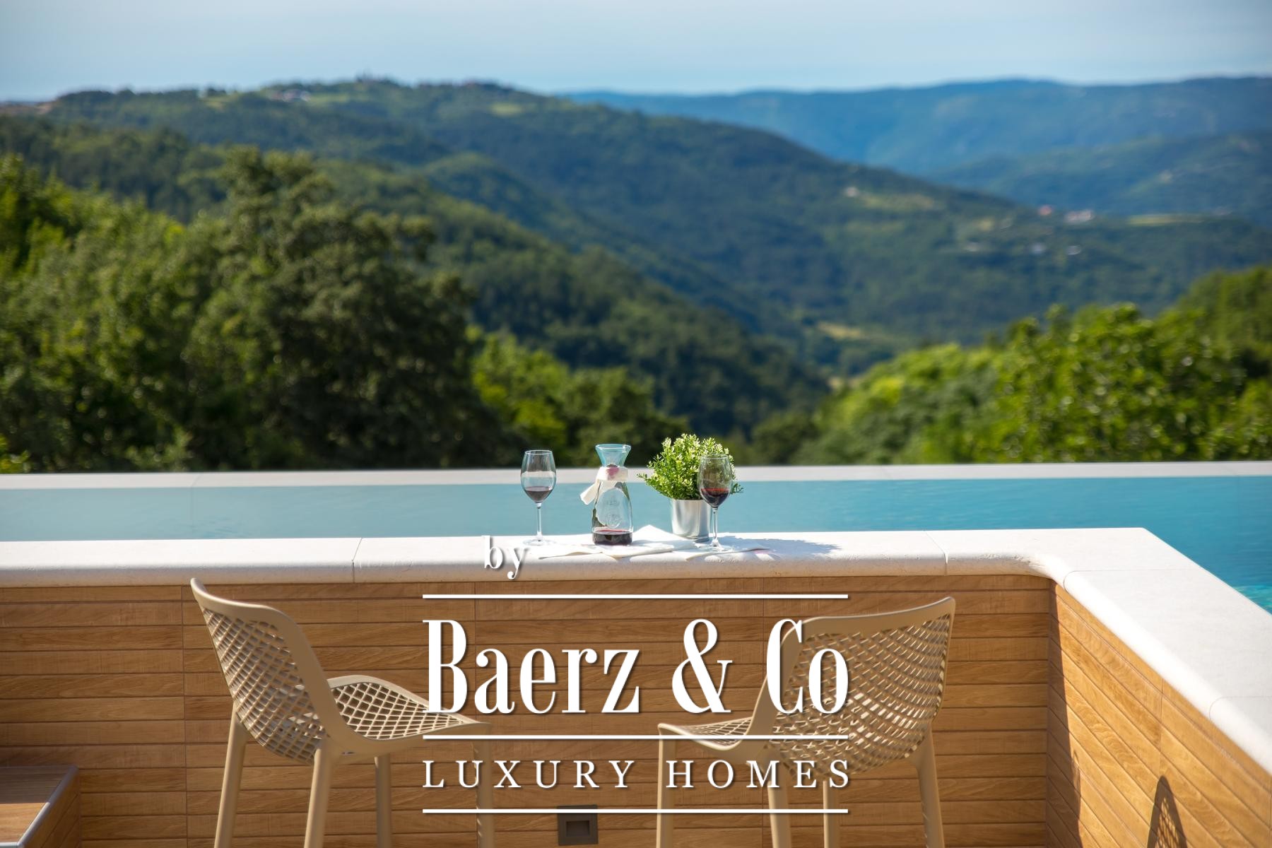 Luxury villa Pazin Okolica offers 230 m² of contemporary living space, set within a gated 1,420 m² plot surrounded by the gentle hills of Istria. The property commands sweeping panoramic views stretching from the lush landscape to Slovenia and Italy, delivering a rare sense of openness and seclusion synonymous with the region.