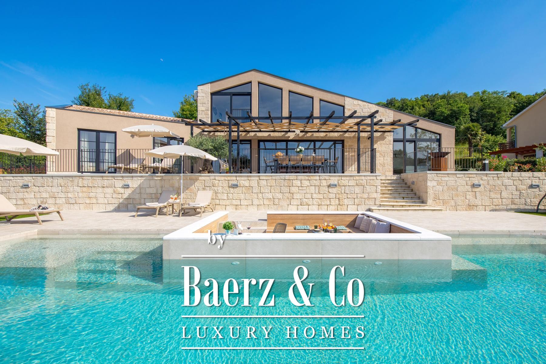 The exterior features a three-sided infinity pool, relaxation zones and meticulous landscaping to secure privacy and peace. Underfloor heating, eight air-conditioning units and a wood-burning fireplace ensure comfort through all seasons. Covered parking for three vehicles completes a residence that merges luxury, authenticity and the quiet grandeur of Istria. This luxury villa for sale in Pazin Okolica is equally suited to private retreat or discreet investment.