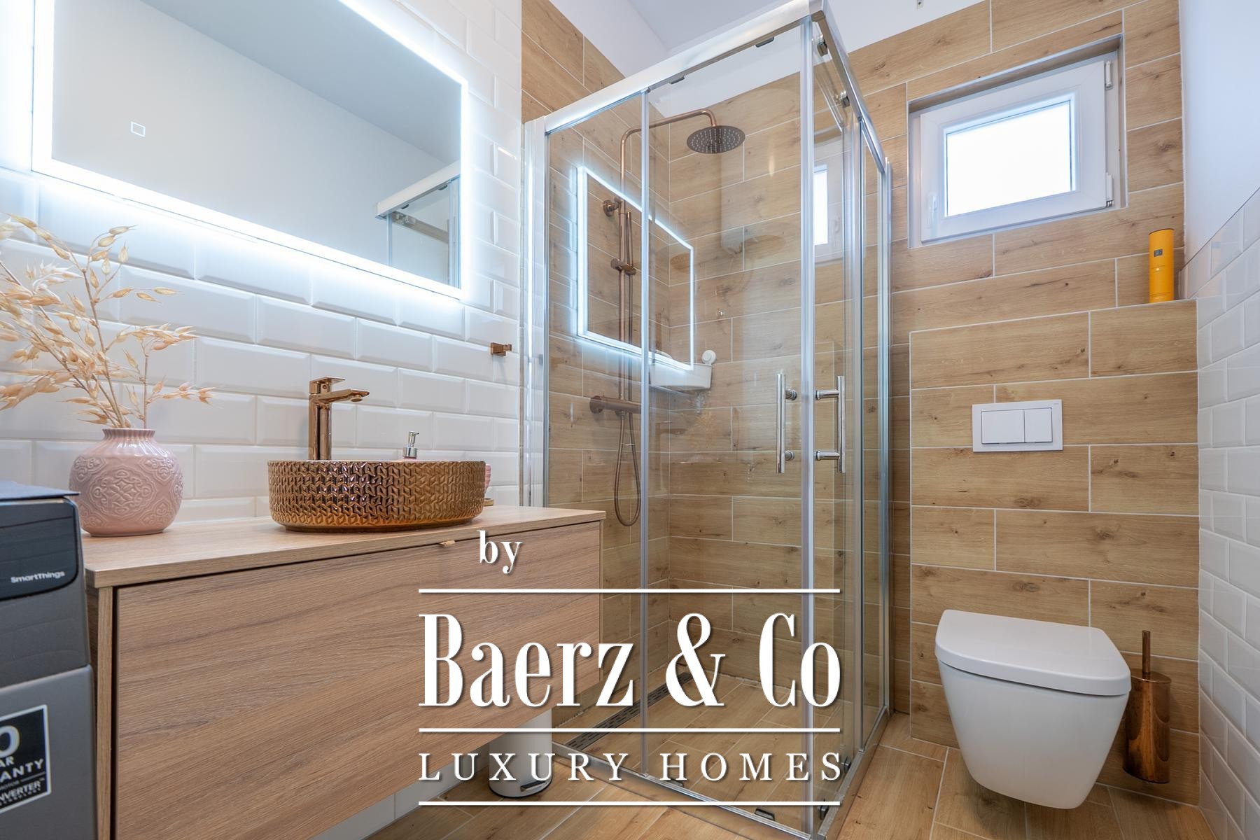 The ground floor features an open-concept living, dining, and kitchen area, complemented by three bedrooms, a bathroom, guest toilet, and a generous terrace ideal for outdoor dining. The apartment on the second floor measures 50 m² and includes two bedrooms, a bathroom, and a modern kitchen with access to a covered terrace overlooking the sea and Ošljak. The third unit, a two-story dwelling of 118 m², is high unfinished, with a main floor opening to a balcony with sea views and a roof terrace that offers panoramic outlooks over the water, Ošljak, and the city of Zadar.