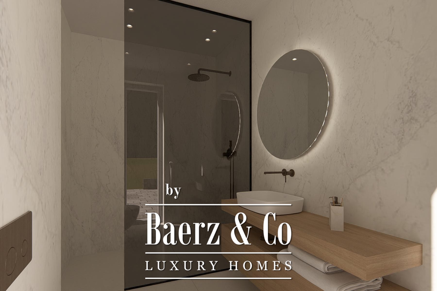 The main level welcomes you with an open living room, kitchen, and dining area, flowing onto a covered terrace with a barbecue. Here, expansive glass doors frame sea views and bring in natural light. The ground floor features one bedroom with its own private bathroom, while the first floor holds three further bedrooms, each with en-suite bathrooms and loggia access. The upper floor opens to a generous terrace, enhancing the flow between indoors and out.