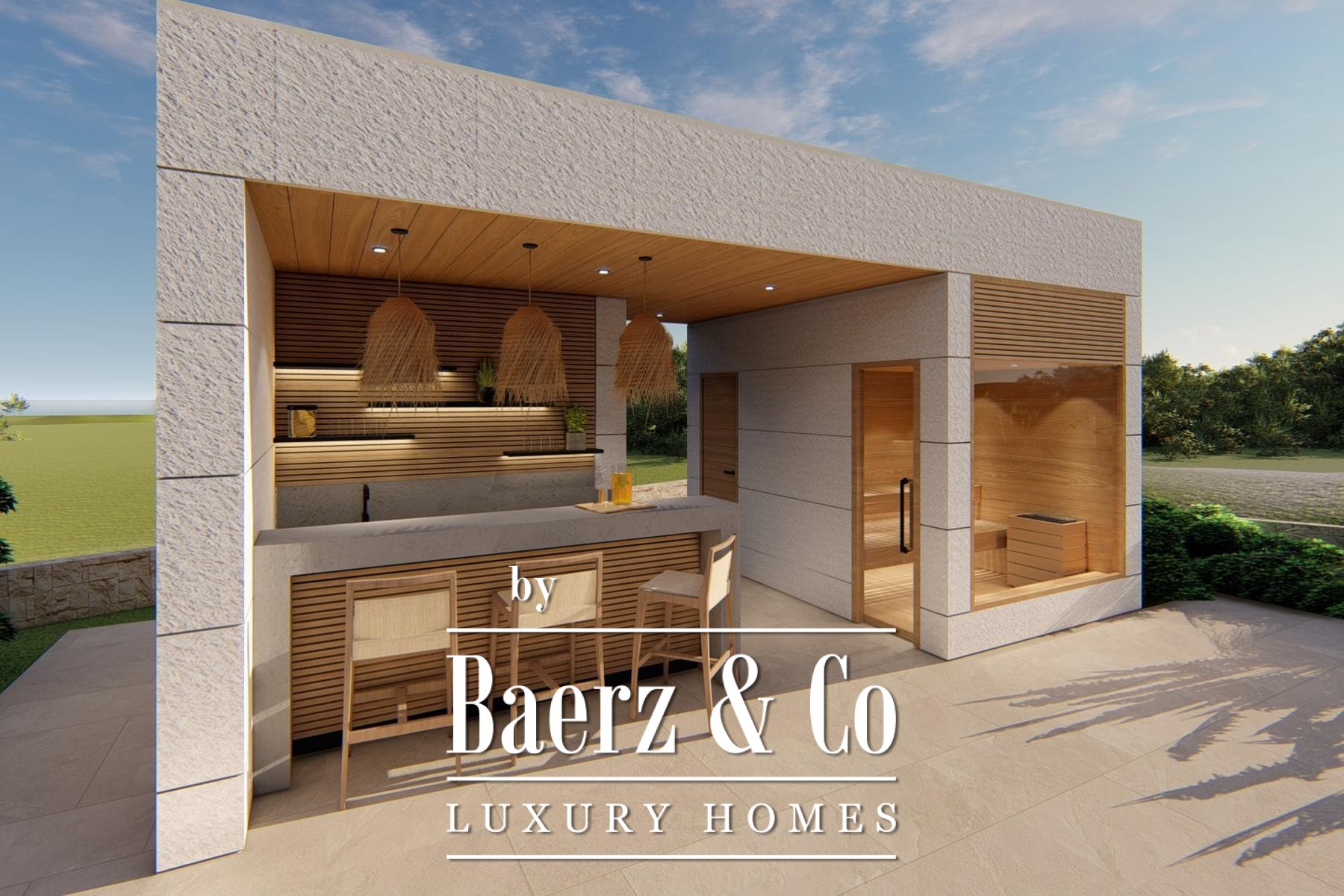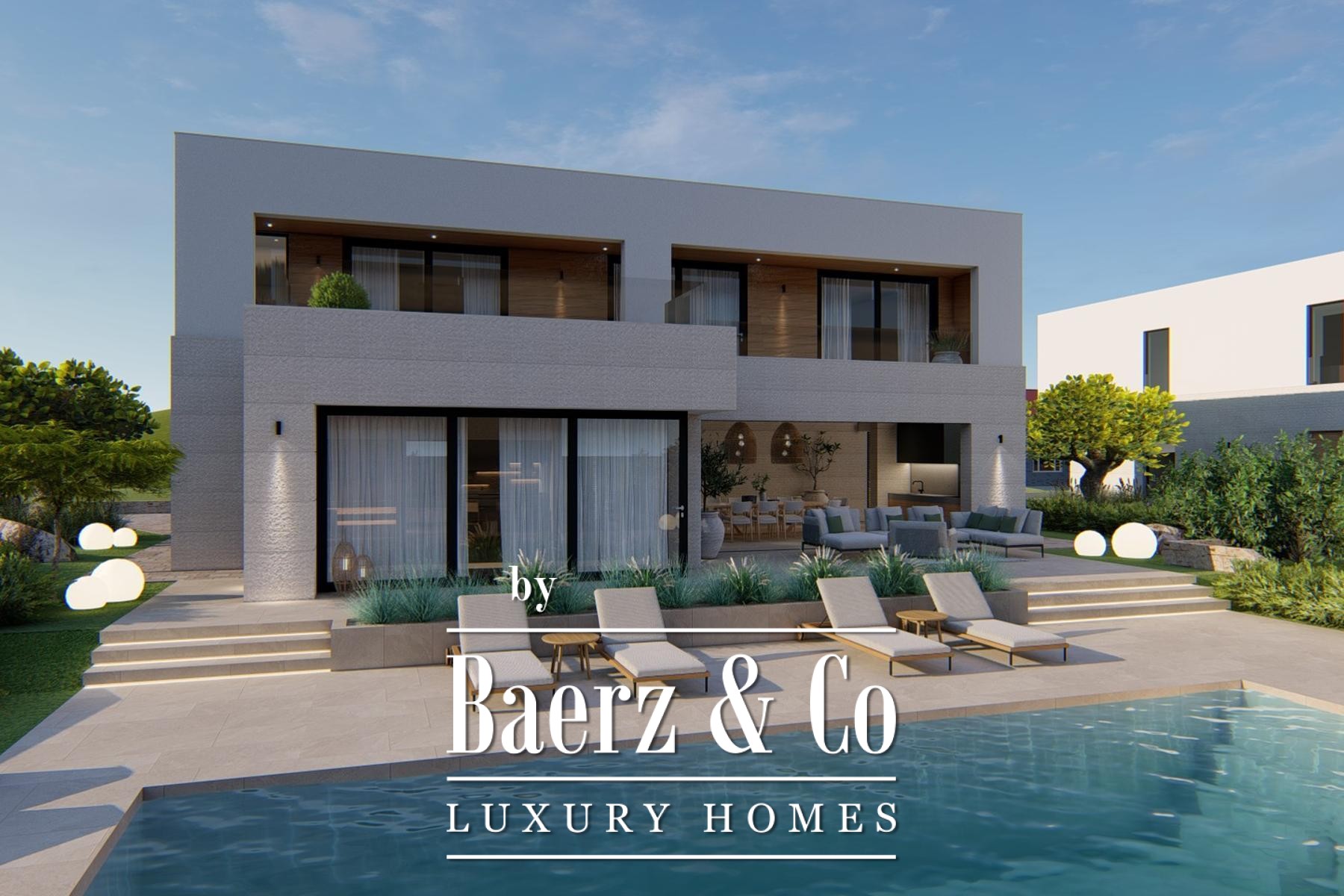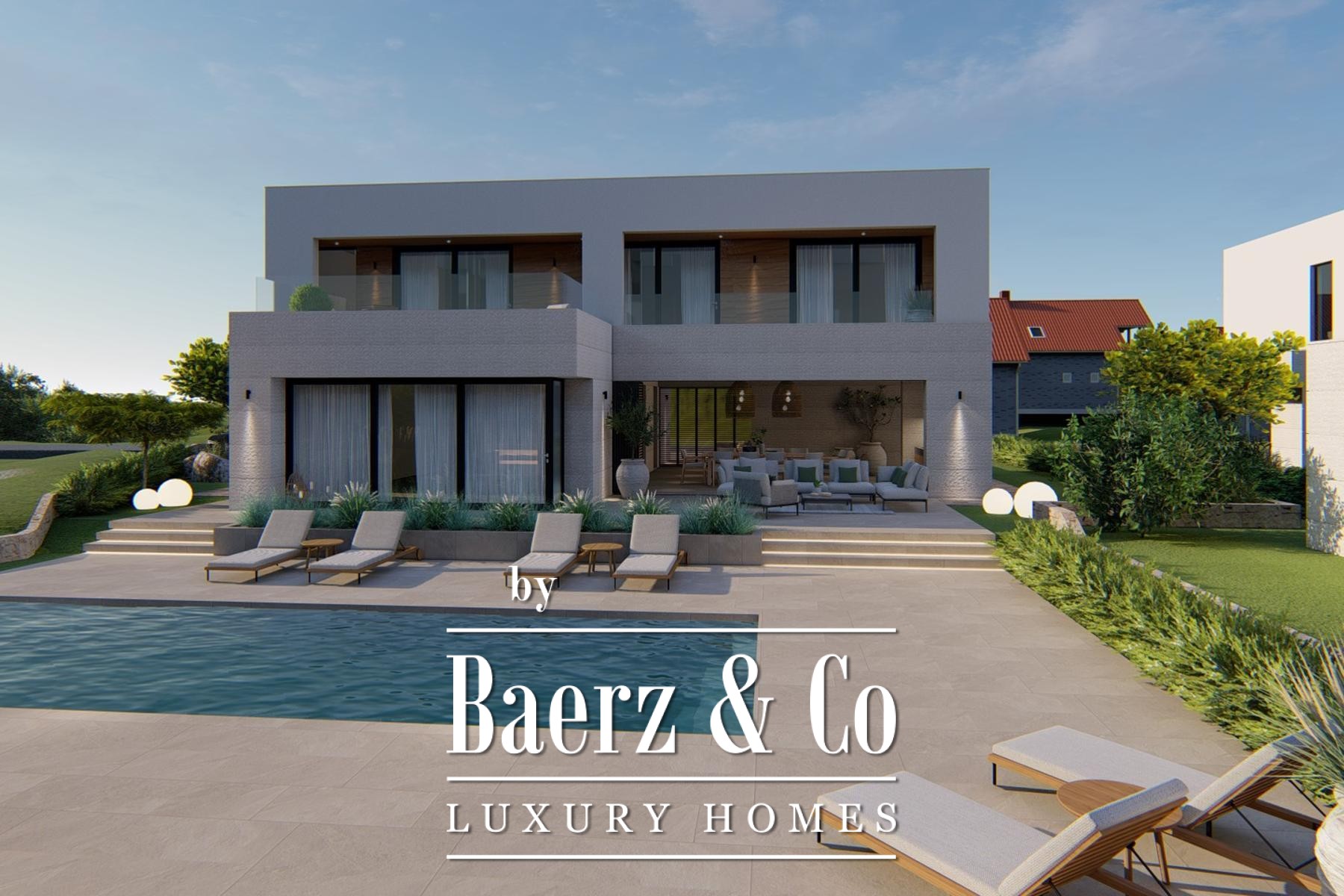Modern villa with sea view Primošten is an architectural statement of restrained luxury and thoughtful living. With a living area of 314 m² set across two floors, this newly built residence rests on a generous 898 m² plot, balancing openness and privacy. On the ground floor, an expansive living space with kitchen and dining area flows onto a covered terrace with barbecue, providing seamless indoor-outdoor connection. The ground floor also offers a bedroom with private bathroom, guest toilet, and a storage area. Outdoors, a heated swimming pool anchors the garden, complemented by an auxiliary building with sauna and covered terrace, inviting calm and relaxation.