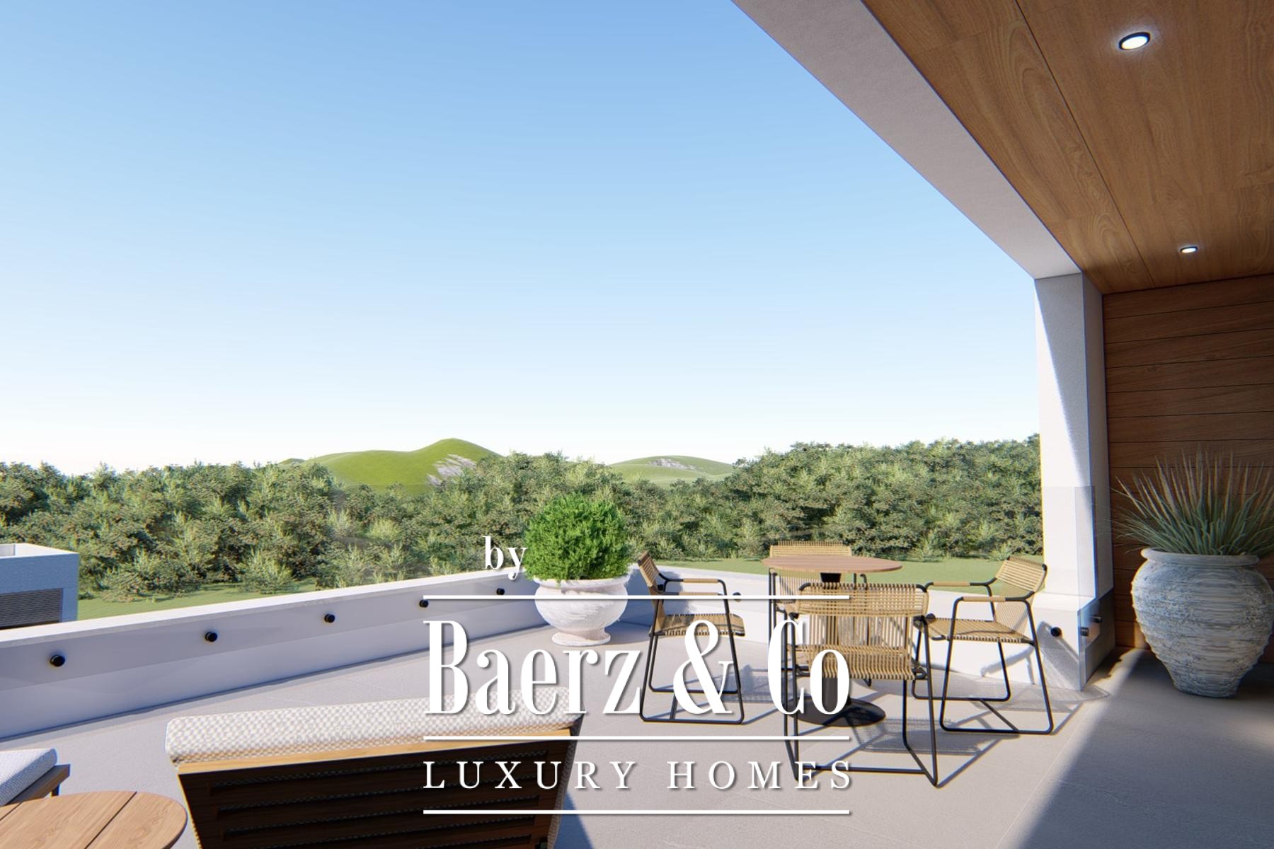 Internal stairs lead to the first floor where three additional bedrooms, each with a private bathroom, open to loggias and a large terrace, uniting views with natural light. Materials are considered: ceramic floors on the ground level and terraces, parquet on the upper floor, wood-aluminium windows, and a stone facade. Underfloor heating warms living spaces, while smart home technology and a photovoltaic power plant complete the modern conveniences. Set in a quiet location with 4 parking spaces, two covered, the property is just 1,650 meters from the sea, offering both serenity and proximity.