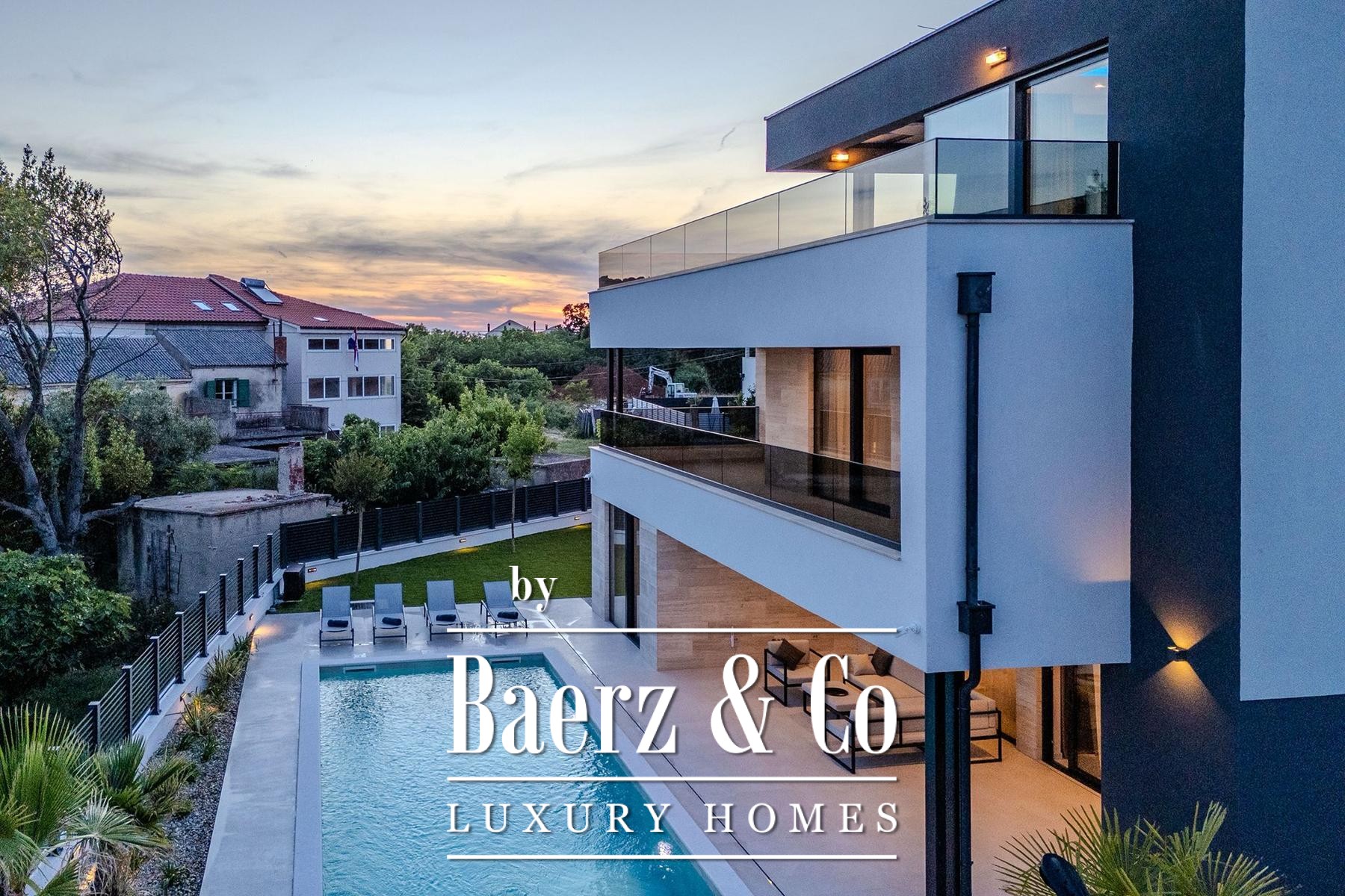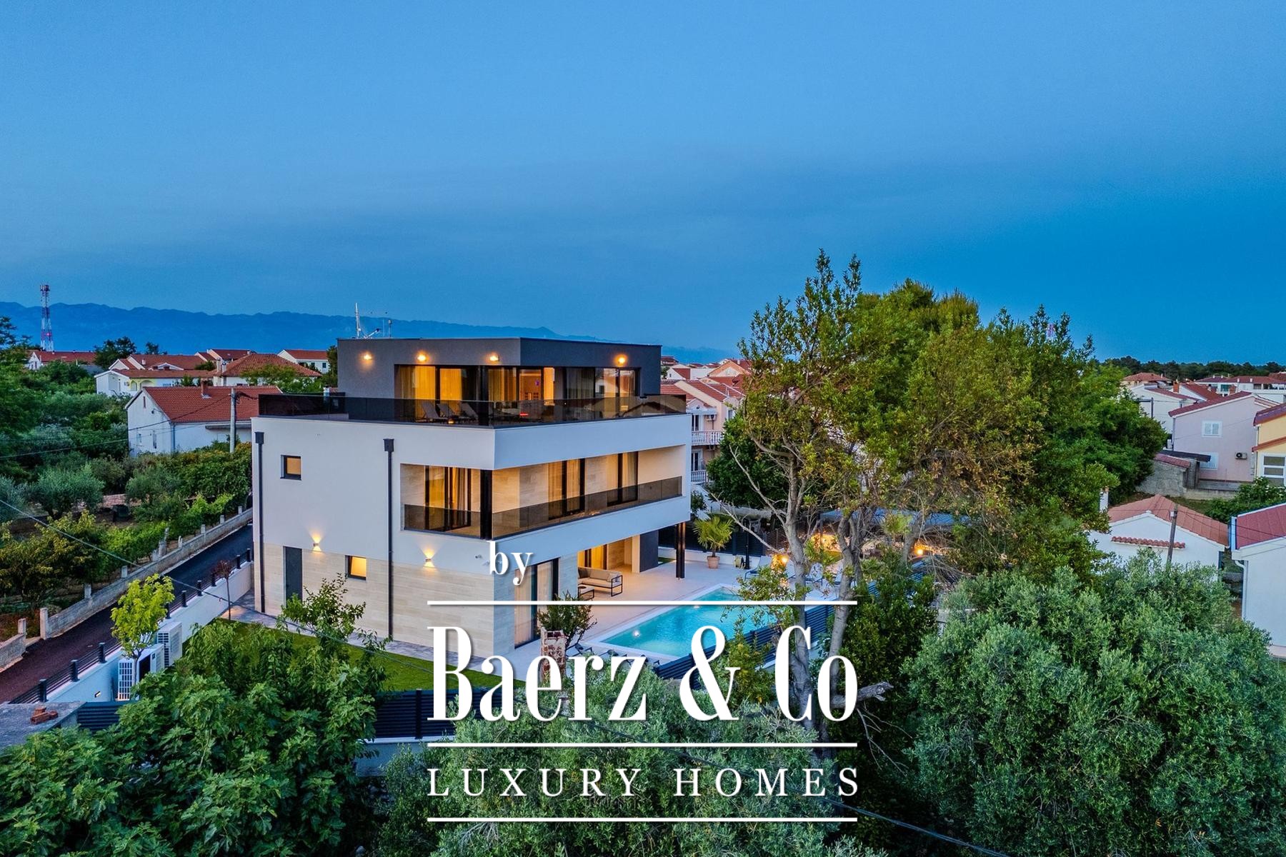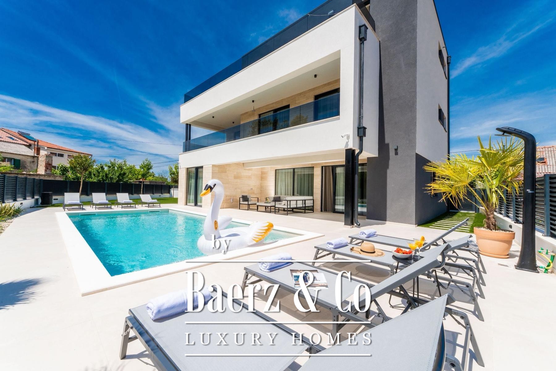 Villa Privlaka in Croatia presents a modern architectural statement in a quiet, exclusive enclave just moments from the Adriatic Sea. This villa offers 412.80 m² total floor area including terraces, set on a 591 m² plot, integrating open-plan living with a sense of seamless indoor-outdoor flow. The main living area of 52.66 m² connects to a 28.95 m² covered terrace and leads directly to the private 36 m² swimming pool, creating a social core ideal for relaxed gatherings or tranquil retreat. Four bedrooms all feature private en-suite bathrooms, with thoughtful allocation across the first and ground floors for both privacy and comfort. The top level is dedicated to a versatile wellness area of 23.60 m² with two expansive terraces designed for quiet contemplation beneath the Mediterranean sky.