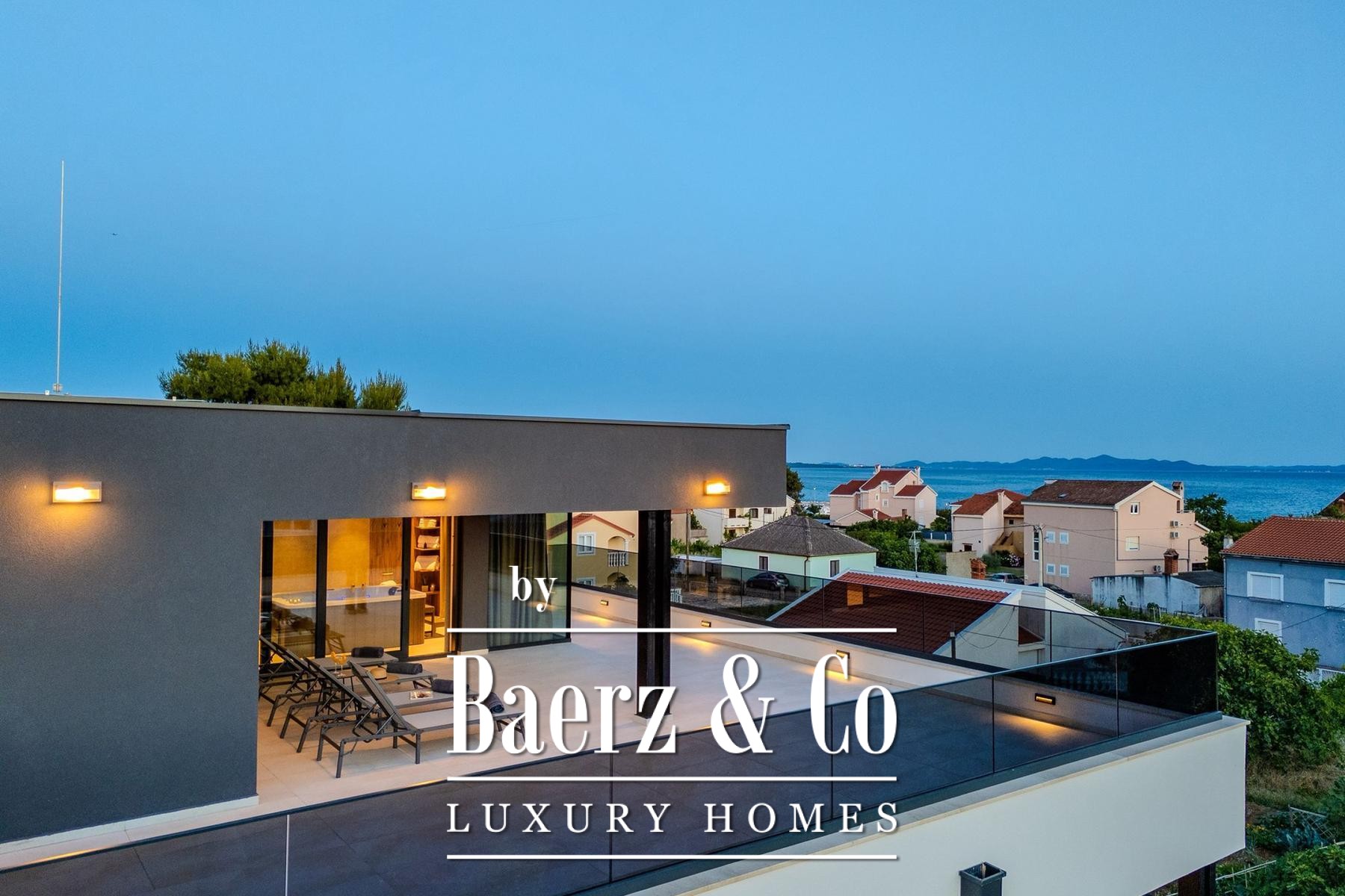 Covered and uncovered terraces extend the living spaces, combining Mediterranean sun with sheltered relaxation. The landscaped garden and sunbathing area convey privacy, while secure parking with video surveillance further enhances peace of mind. Mere steps from well-maintained beaches, this villa for sale in Privlaka aligns architectural elegance with Mediterranean leisure, equally suited for discreet family residence or luxury tourist rental. Each architectural detail reflects functionality and enduring quality, cultivating a setting of restraint, comfort, and light.