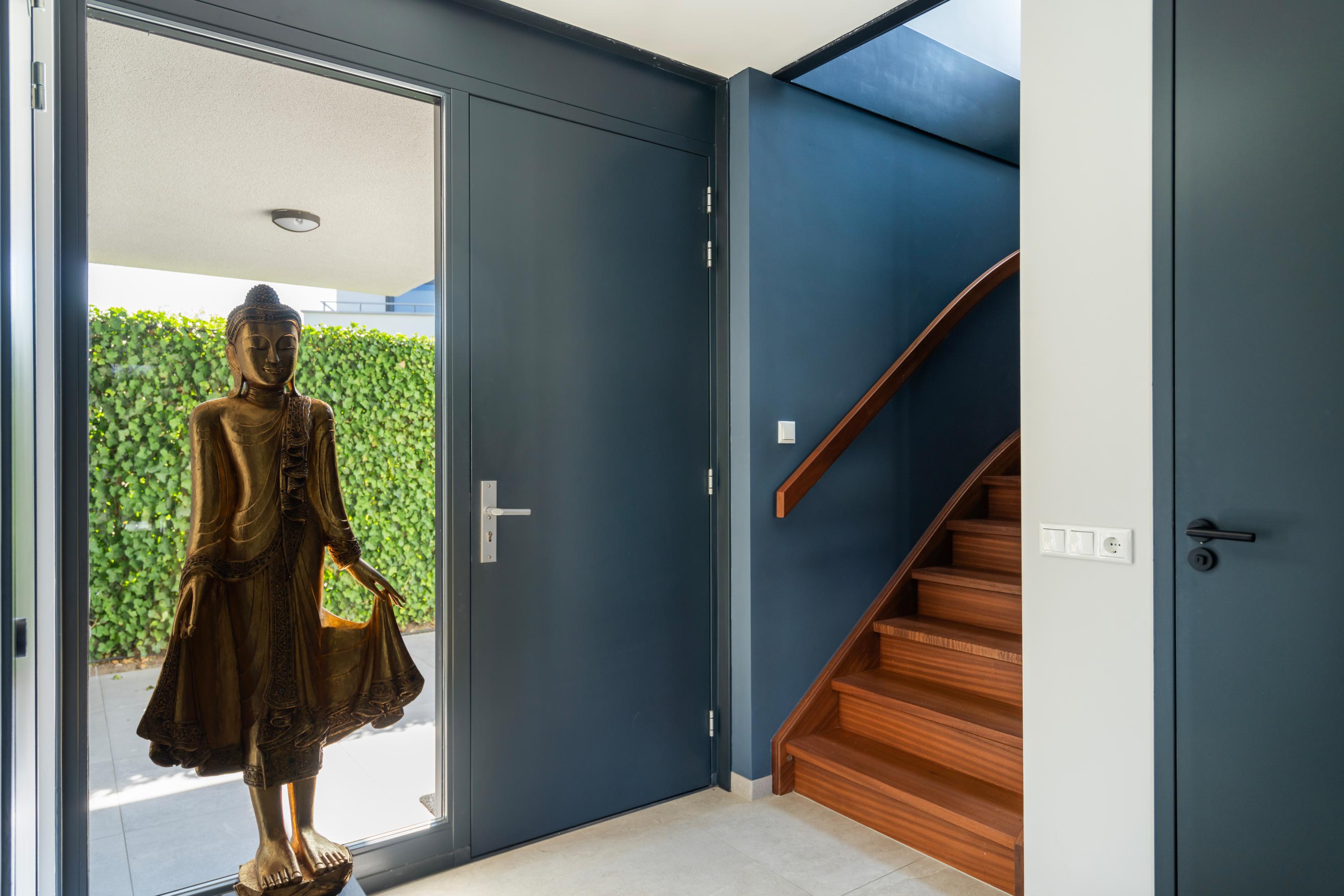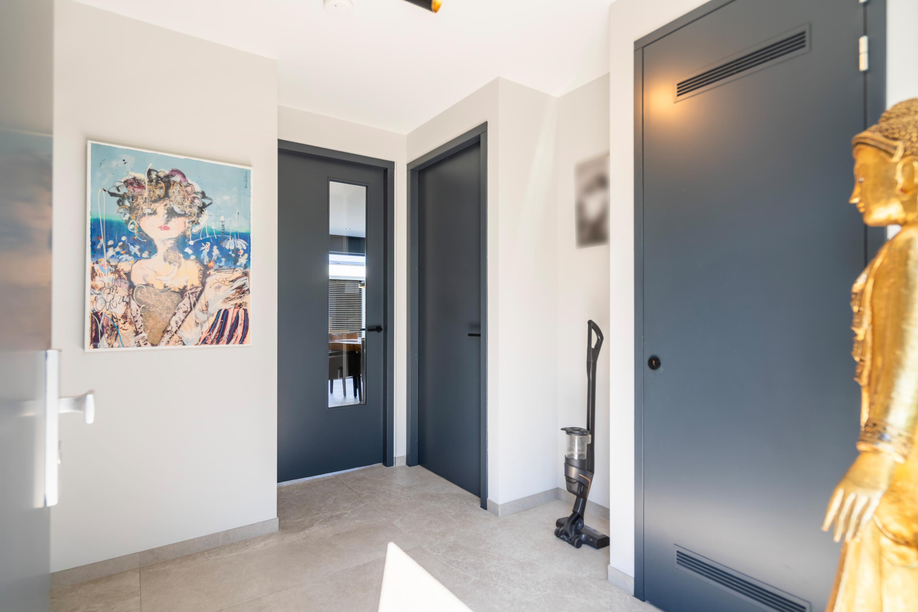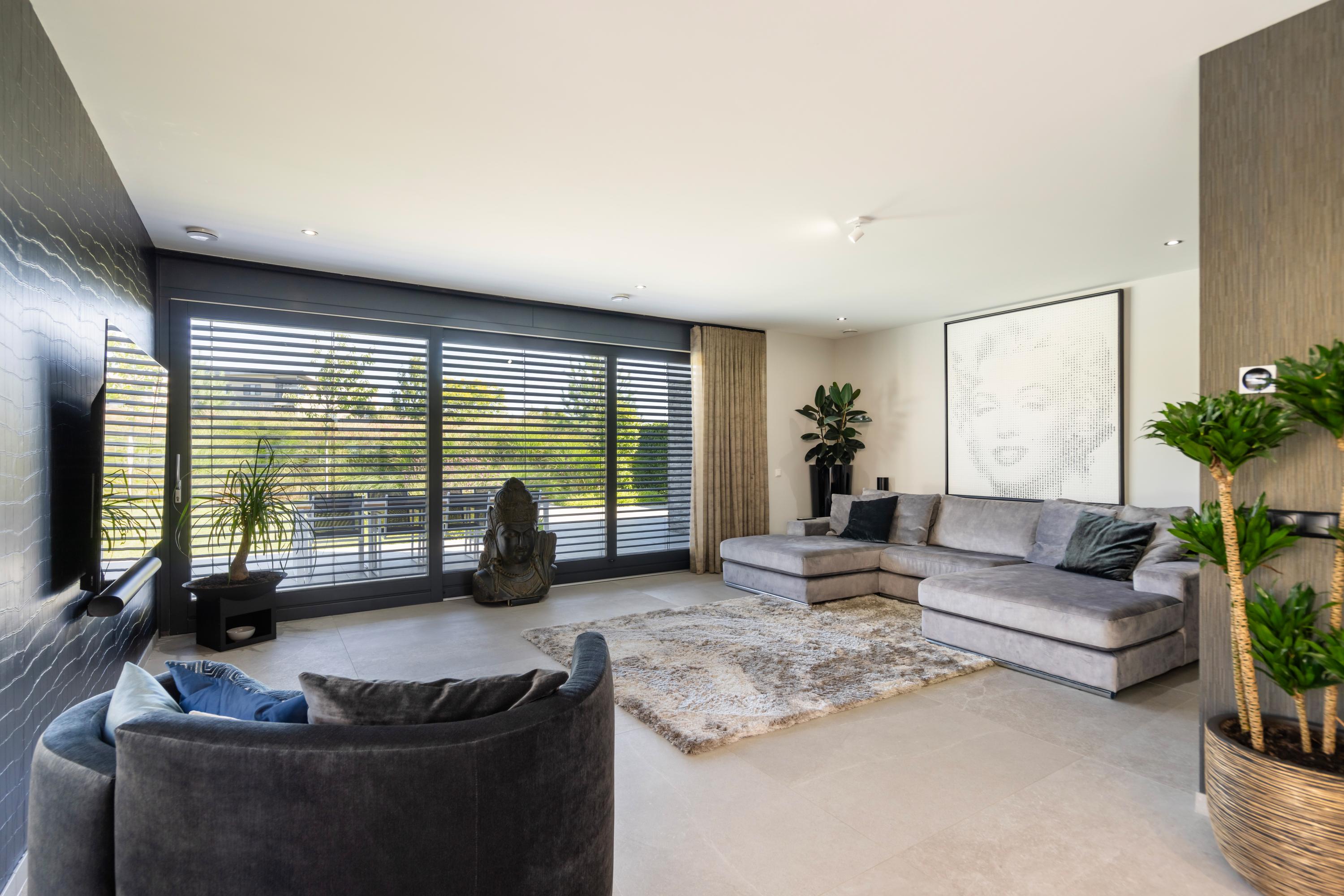 At the front, the villa is embraced by a generous garden that immediately sets the tone for the exclusive character of the property. The carefully designed combination of modern paving and green borders creates a harmonious and refined whole. The private driveway, finished with high?quality tiles and subtle greenery, leads you stylishly to the entrance.