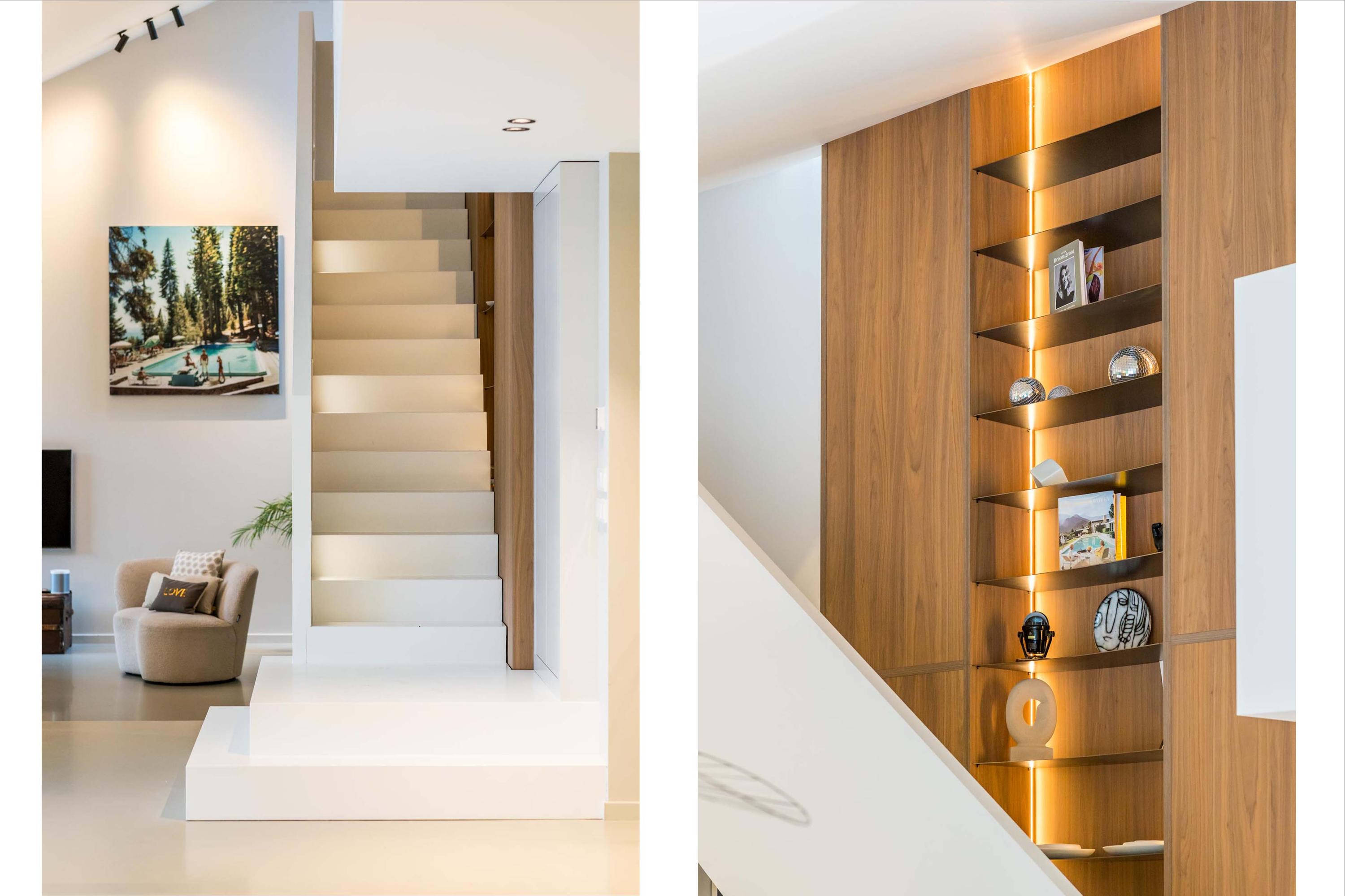 The staircase to the first floor and mezzanine is a real eye-catcher and features a custom-made built-in wardrobe with beautiful lighting.