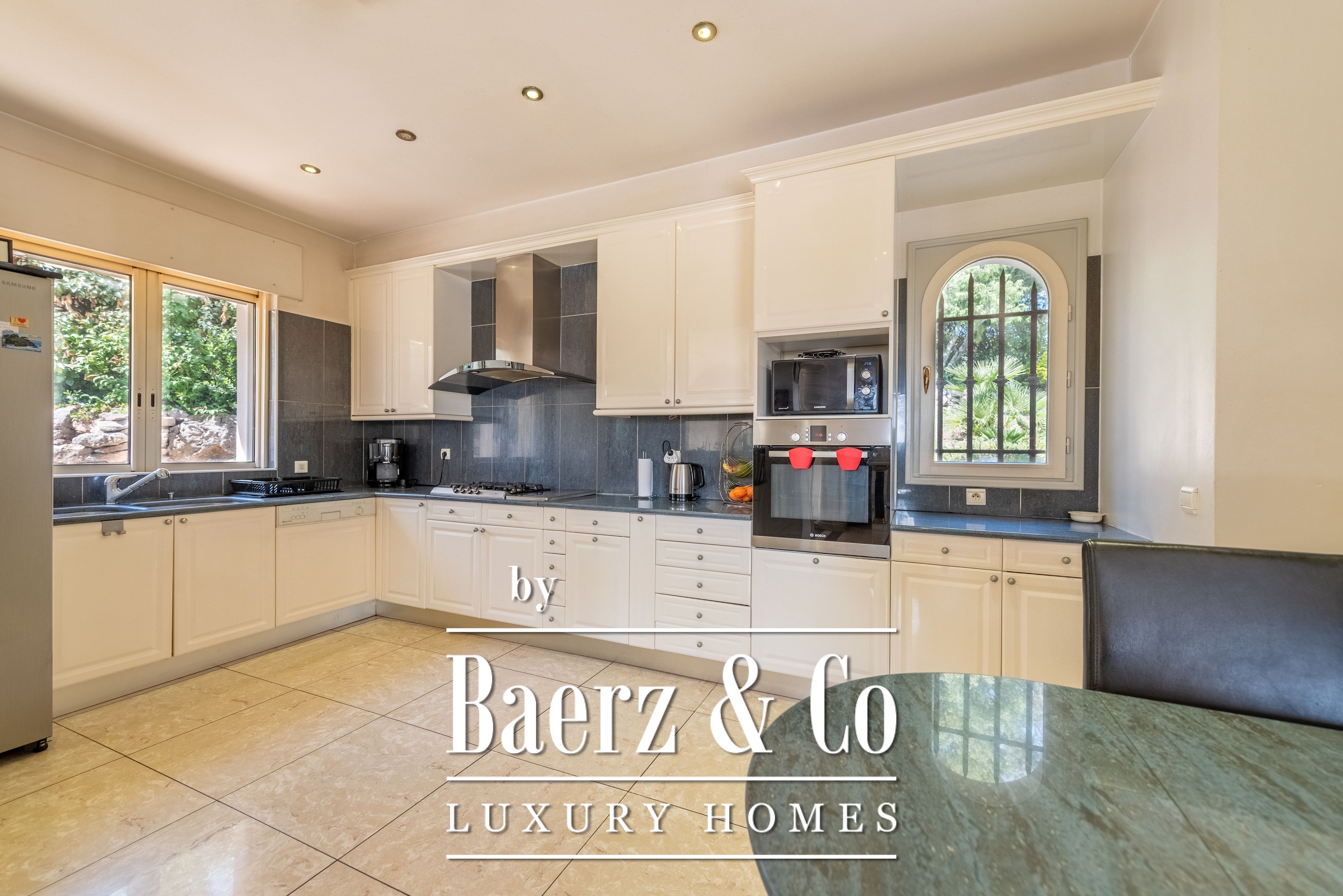 The 1,511 m² landscaped plot surrounds the home with mature gardens, multiple terraces, and an infinity pool. On the lower level, find a games room, double garage, and utility spaces. Features such as aluminum frames, central electric shutters, alarm, video surveillance, and electric gate enhance peace of mind.