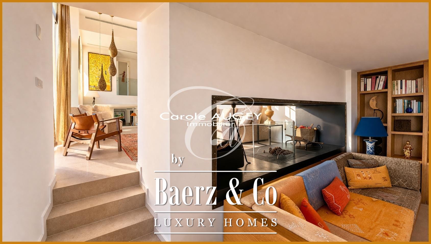 The property boasts 5 suites, including a studio with independent access. The principal suite offers expansive views and a calming atmosphere. The main living area is defined by its generous volumes, soaring ceilings, and an XXL double-sided fireplace, while the fully equipped kitchen enhances the connection between indoor and outdoor living. An elevator adds effortless access, and a sea-view gym completes the amenities.