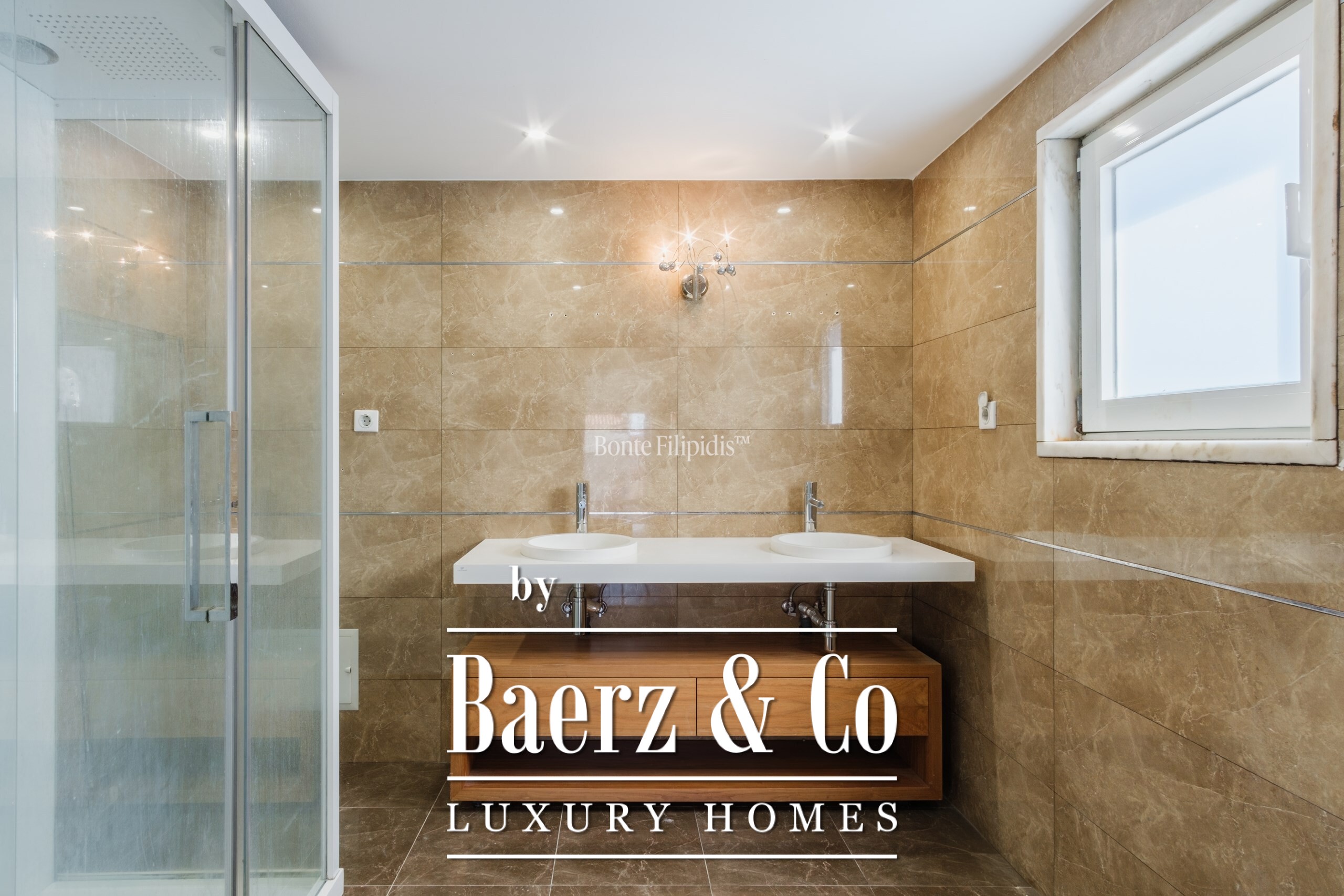 Underfloor heating runs throughout, providing comfort across every season. The villa features a private 35 m² swimming pool, a landscaped garden, and practical details including a garage for three vehicles plus an additional parking space. Four bathrooms balance function and privacy for family and guests.