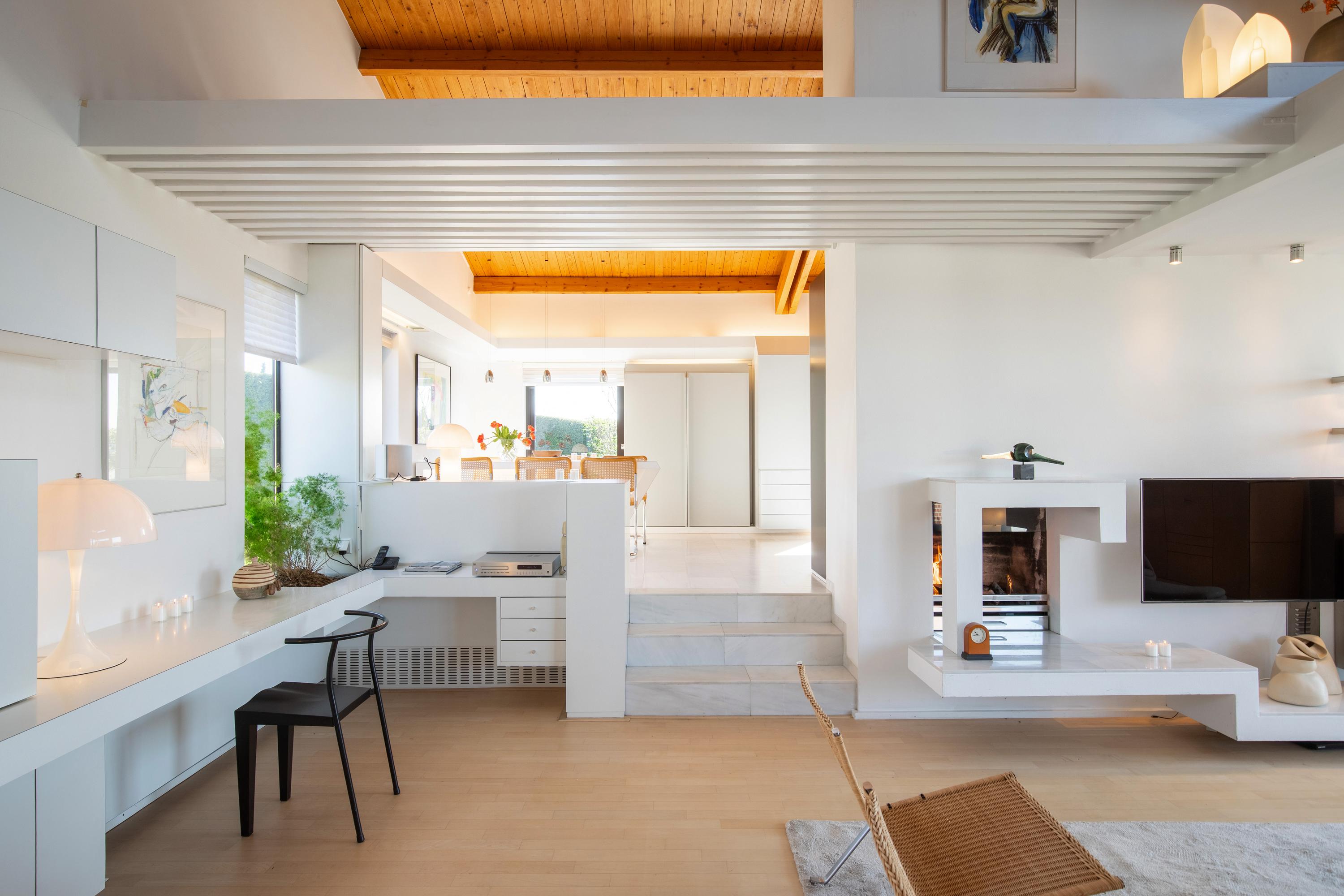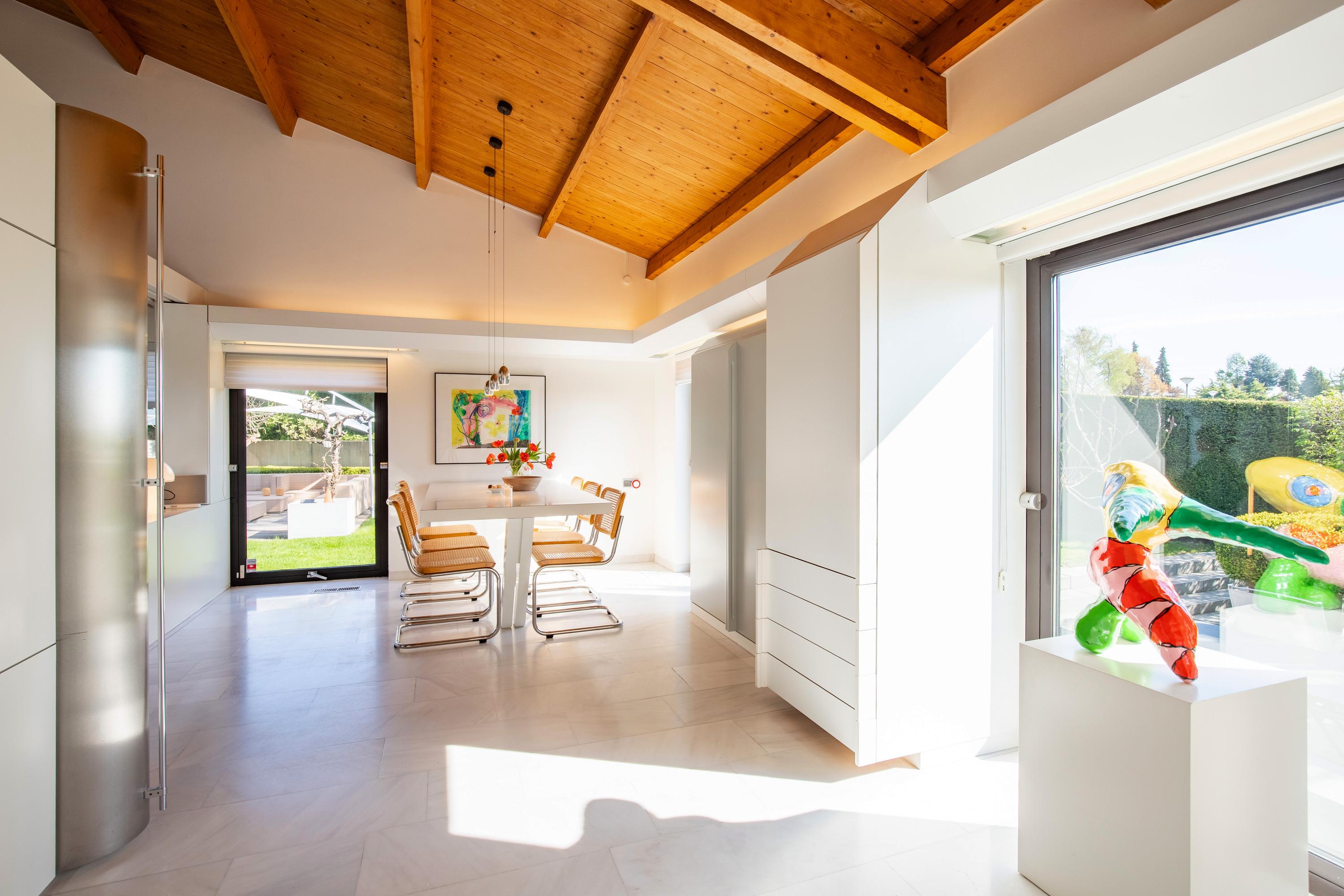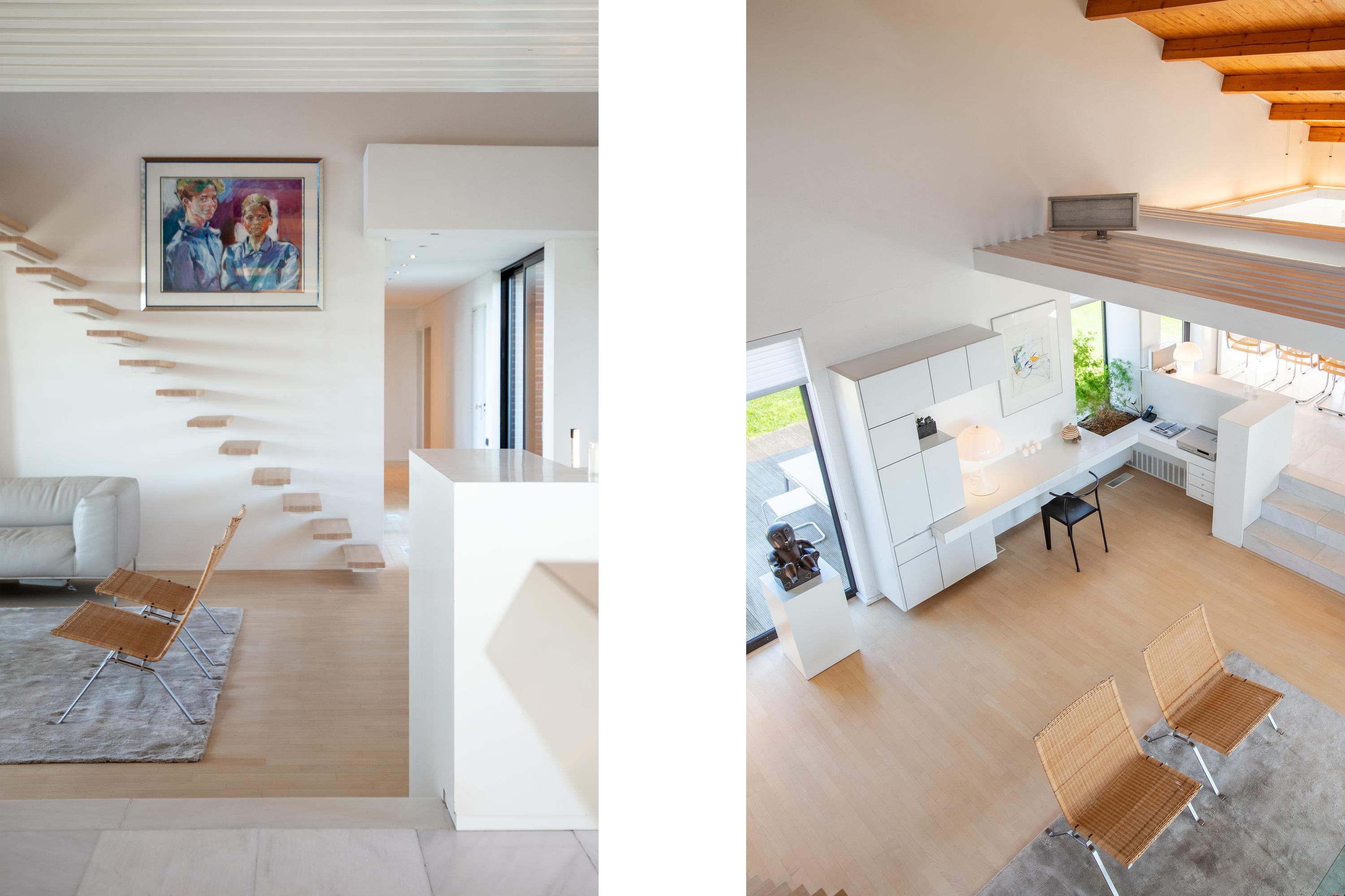 One floor up, accessible via the spiral staircase from the entrance hall, lies the entire living area. An open hallway with a few steps on the right leads to the semi-open kitchen, and on the left to the living room. Generous windows on all facades allow plenty of natural light to flood in. The combination of the sloping wooden ceiling and the roofline, paired with “maple” parquet flooring, enhances the living experience and creates a harmonious atmosphere. The kitchen is arranged in a corner layout and equipped with various built-in appliances. A staircase from the living room leads to the cozy sitting room one floor up, which features a loft. The living room features a cozy gas fireplace.