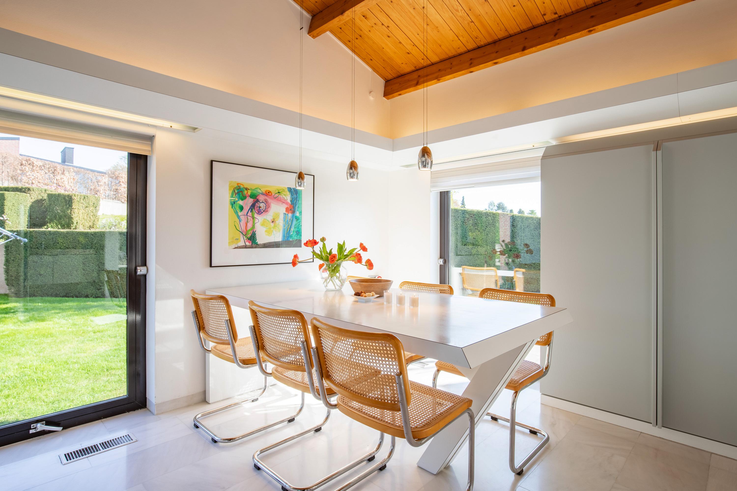 The villa features a highly varied and playful layout. The current owner uses it as a residence with a workspace, located in the spacious practice area on the ground floor. The property is accessible via a paved driveway. The driveway offers space for parking multiple vehicles. Covered entrance to the reception hall. From the reception hall, there is access to the two separate practice rooms currently used as a beauty salon. Utility room with mechanical systems. The indoor garage is equipped with two electrically operated sectional doors. The spacious garage offers parking for three vehicles. The utility room/storage area, located directly adjacent to the garage, is accessible from the garage. This space serves as the mechanical room for the indoor swimming pool. The fully tiled pool area is accessible via a spiral staircase from the master bedroom upstairs, as well as from the indoor garage. The pool measures approximately 45 m². This area also includes a separate restroom and shower room.