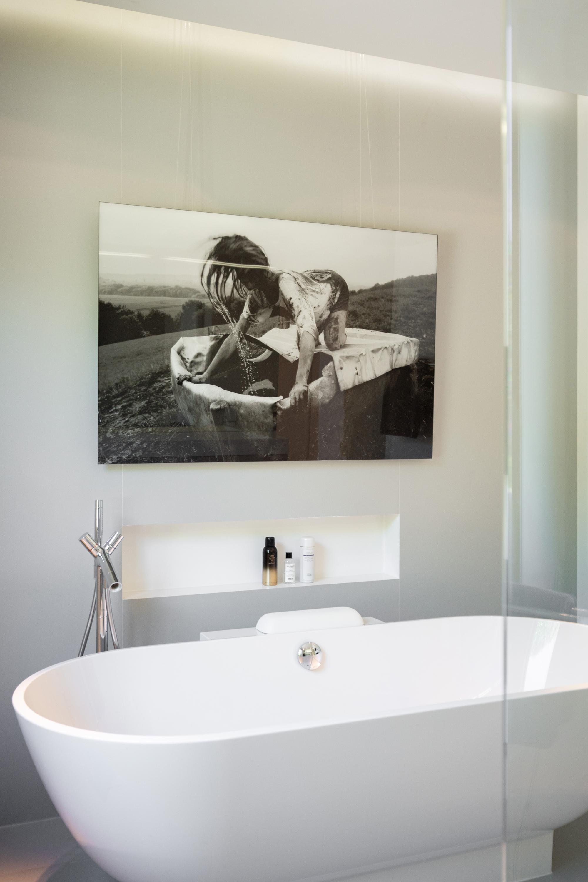 The sleeping areas are connected to the living room and kitchen via a hallway lined with windows on both sides. A beautifully tiled half-bathroom. Three bedrooms, some of which feature built-in closets. A spiral staircase leads from the master bedroom down to the pool at ground level. The tasteful and luxurious bathroom is finished with high-quality materials and accessible from the hallway. First, there is a spacious walk-in closet with built-in cabinetry, followed by access to the bathroom. This has been recently fitted with a wall-hung toilet, a walk-in shower with a tempered glass screen, a freestanding bathtub, and a bathroom vanity featuring a full-width sink with a mirrored wall. The walls and floor feature a distinctive finish with large, ultra-thin ceramic tiles laid seamlessly. Finally, ceiling lighting with elegant recessed spotlights has been installed. The bathroom features underfloor heating. From each of the living areas, there is a direct connection to the exterior of the villa and a magnificent view of the rolling hills and the architecturally landscaped garden. Surrounding the villa are exquisitely landscaped terraces where one can enjoy the sun or shade. A water feature in an elongated concrete element with a wooden deck tastefully completes the ensemble. The beautiful fig trees are a true eye-catcher in the garden. The garden is also accessible from the front and side.